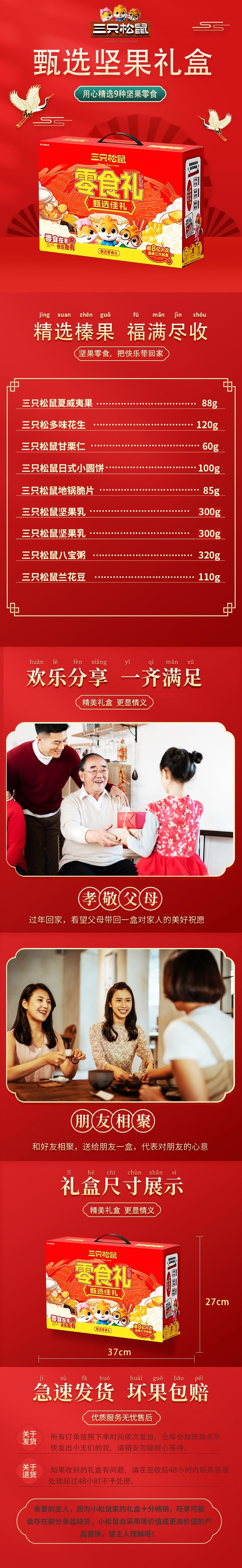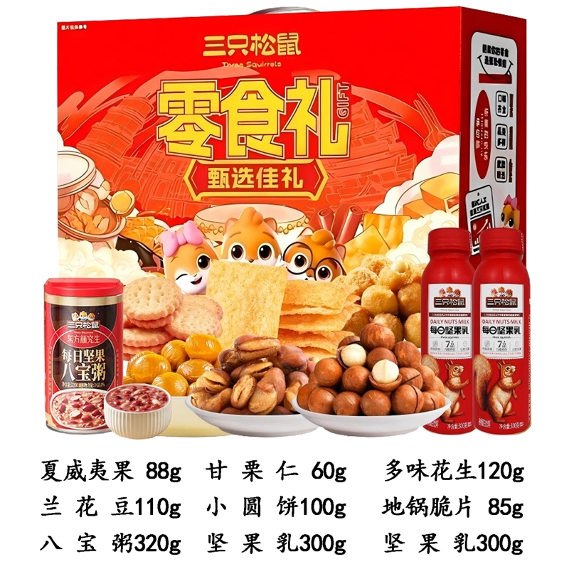 配置清单:三只松鼠-夏威夷果88g 三只松鼠-甘栗仁60g 三只松鼠-多味花生120g 三只松鼠-兰花豆110g 三只松鼠-日式小圆饼100g 三只松鼠-地锅脆片85g 三只松鼠-八宝粥320g 三只松鼠-坚果乳300g 三只松鼠-坚果乳300g