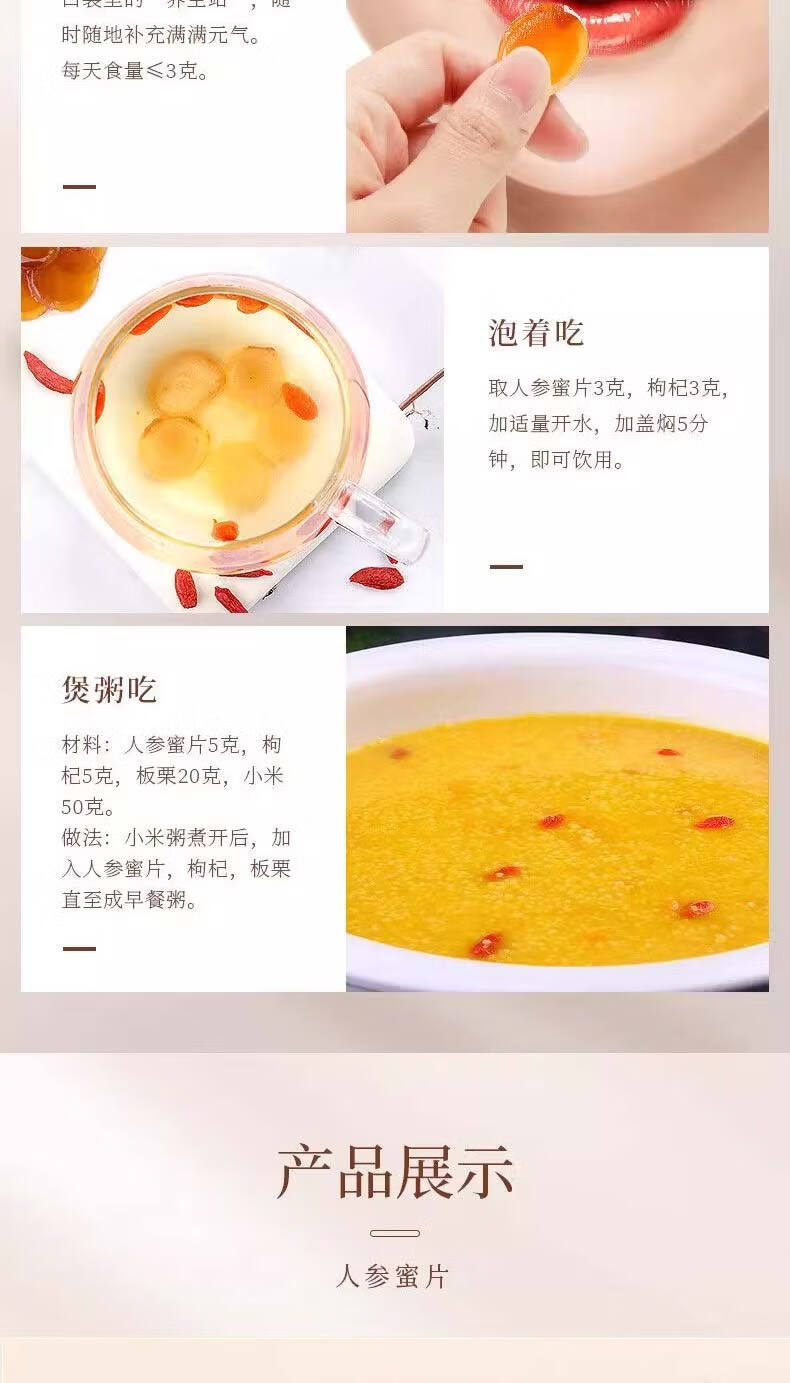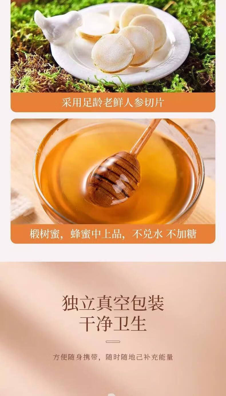 人参蜜片撕开就能嚼,随时随地能量嚼回来;足龄人参,参味浓郁;纹路清晰 色泽饱满