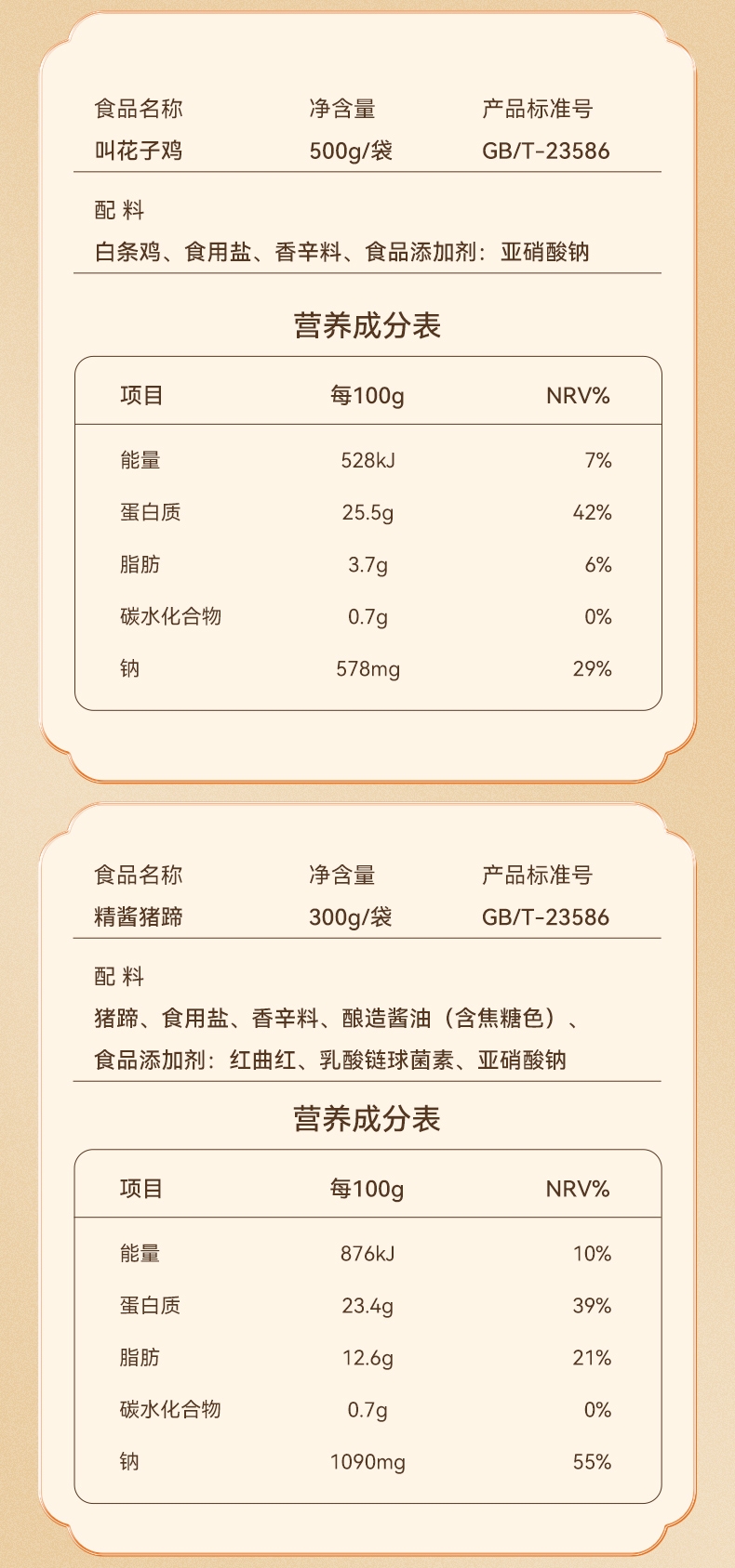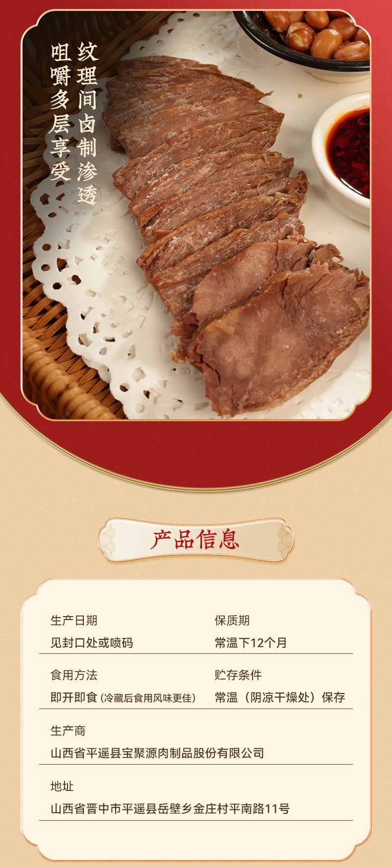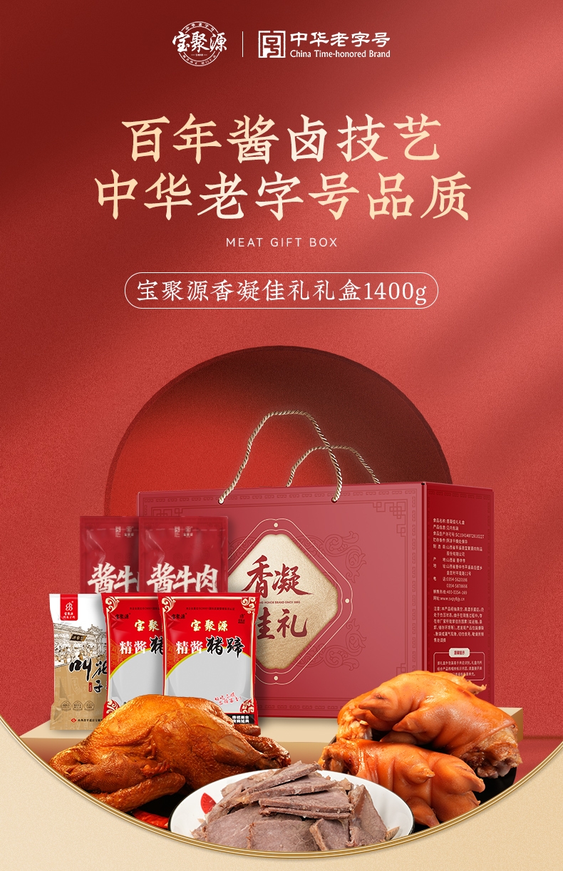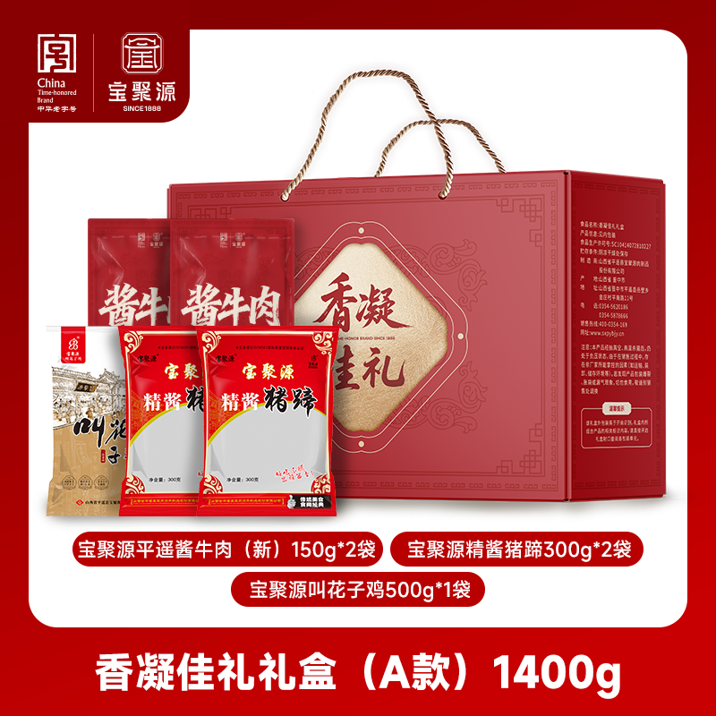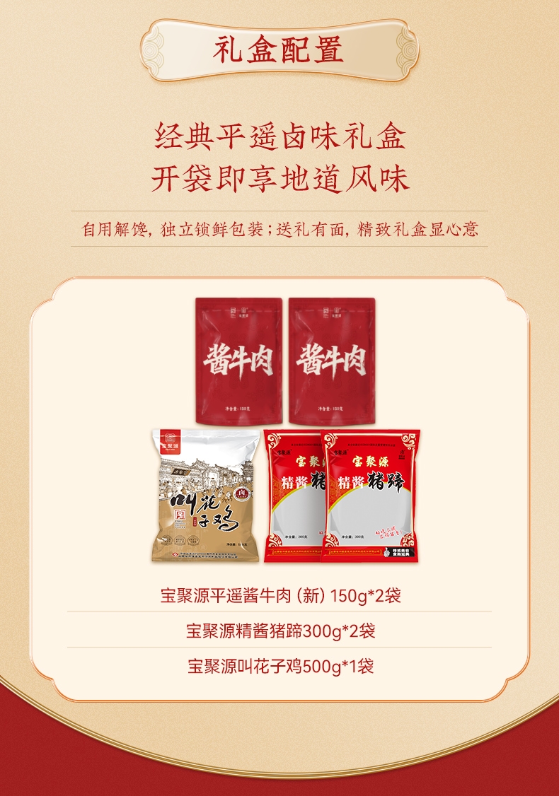 配置清单:宝聚源平遥酱牛肉(新)150g*1袋 宝聚源平遥酱牛肉(新)150g*1袋 宝聚源精酱猪蹄300g*1袋 宝聚源精酱猪蹄300g*1袋 宝聚源叫花子鸡500g*1袋