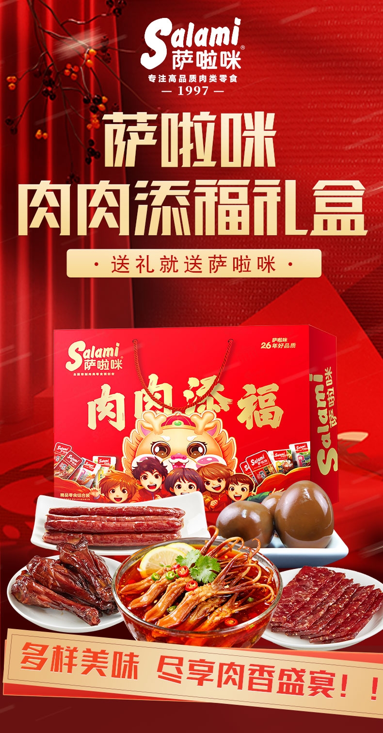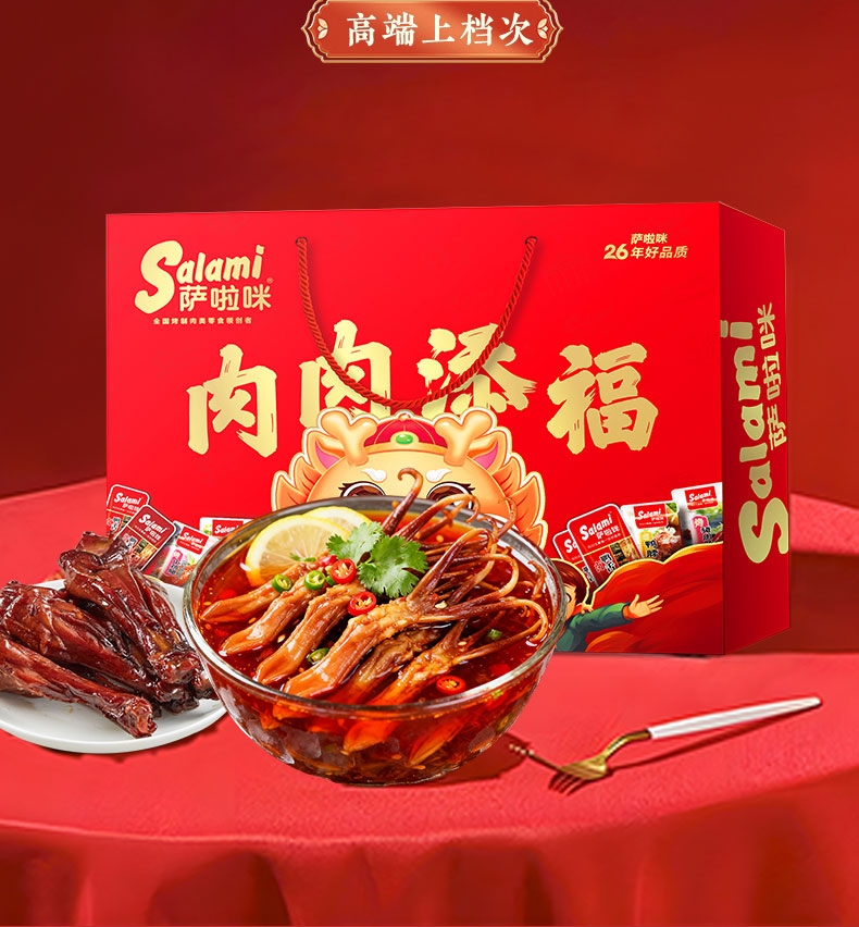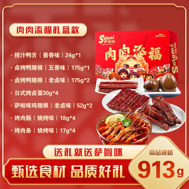 配置清单:萨啦咪卤烤鸭翅根175克(老卤味)*2 萨啦咪卤烤鸭翅根175克(五香味)*1 萨啦咪鸡翅根(老卤味)52克*2 萨啦咪鸭舌(酱香)24克*1 萨啦咪烤肉条(烧烤味)17克*4 萨啦咪烤肉肠(烧烤味)18克*4 萨啦咪日式烤卤蛋30g*4