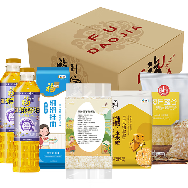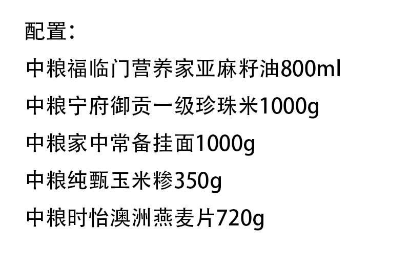 配置:中粮福临门营养家亚麻籽油800ml 中粮宁府御贡一级珍珠米1000g 中粮家中常备挂面1000g 中粮纯甄玉米糁350g 中粮时怡澳洲燕麦片720g
