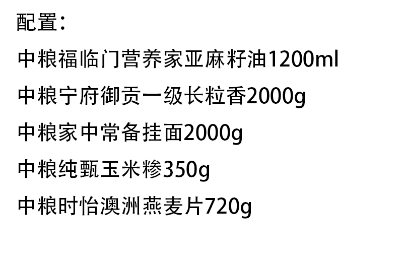 配置:中粮福临门营养家亚麻籽油1200ml 中粮宁府御贡一级长粒香2000g 中粮家中常备挂面2000g 中粮纯甄玉米糁350g 中粮时怡澳洲燕麦片720g