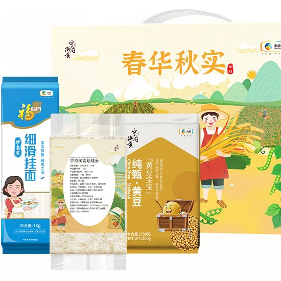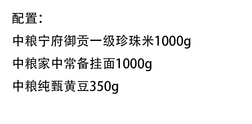 配置:中粮宁府御贡一级珍珠米1000g 中粮家中常备挂面1000g 中粮纯甄黄豆350g