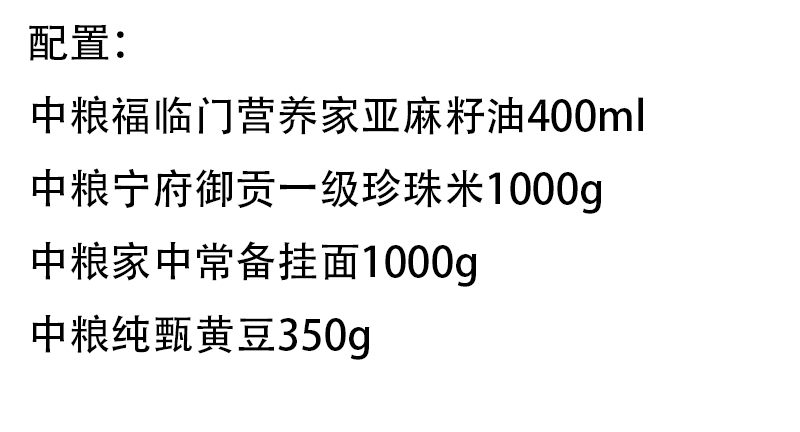 配置:中粮福临门营养家亚麻籽油400ml 中粮宁府御贡一级珍珠米1000g 中粮家中常备挂面1000g 中粮纯甄黄豆350g