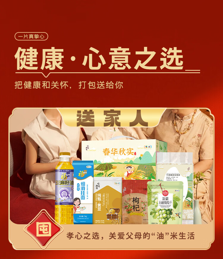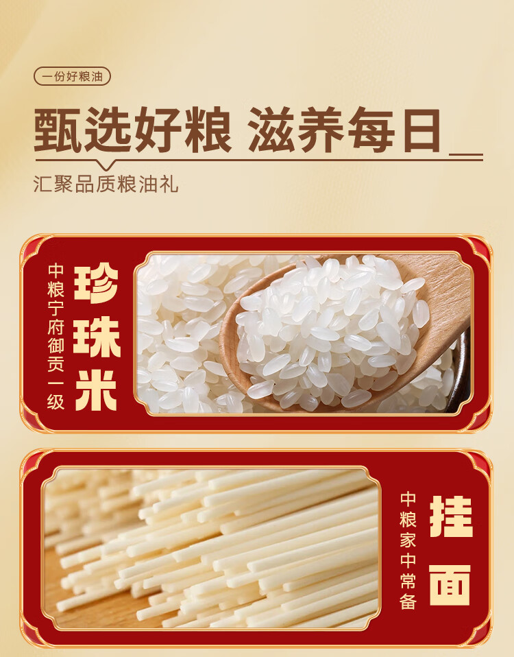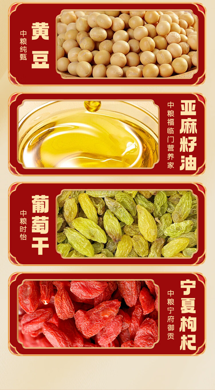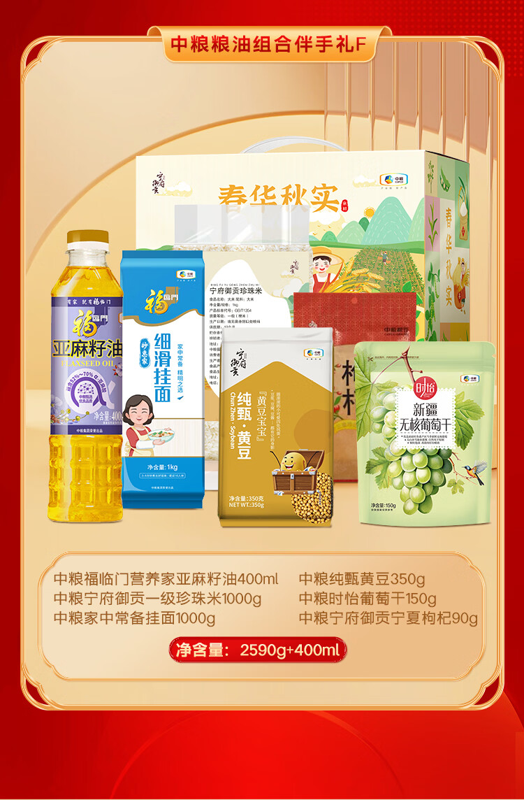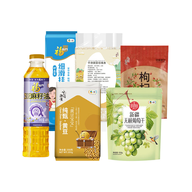 配置:中粮福临门营养家亚麻籽油400ml 中粮宁府御贡一级珍珠米1000g 中粮家中常备挂面1000g 中粮纯甄黄豆350g 中粮时怡葡萄干150g 中粮宁府御贡宁夏枸杞90g