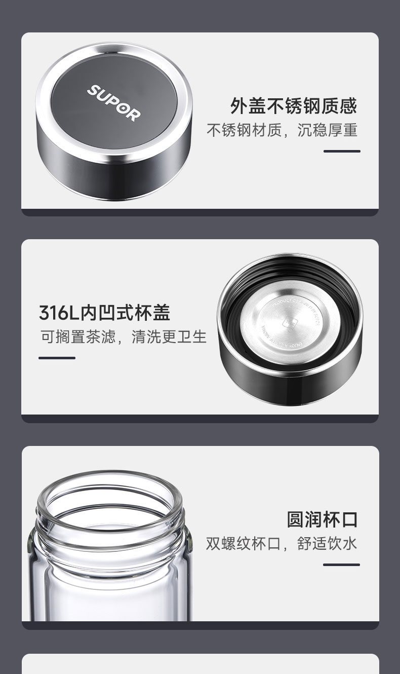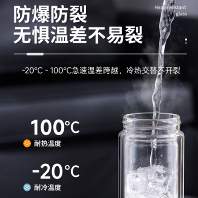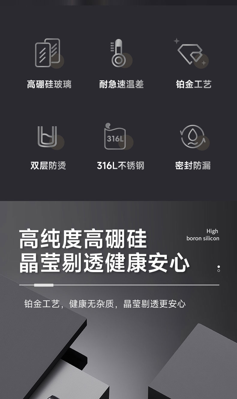 高纯度高硼硅玻璃杯体,防爆防裂,无惧温差;双层加厚杯身,隔热不烫手;304不锈钢茶滤,易拿取易清洁