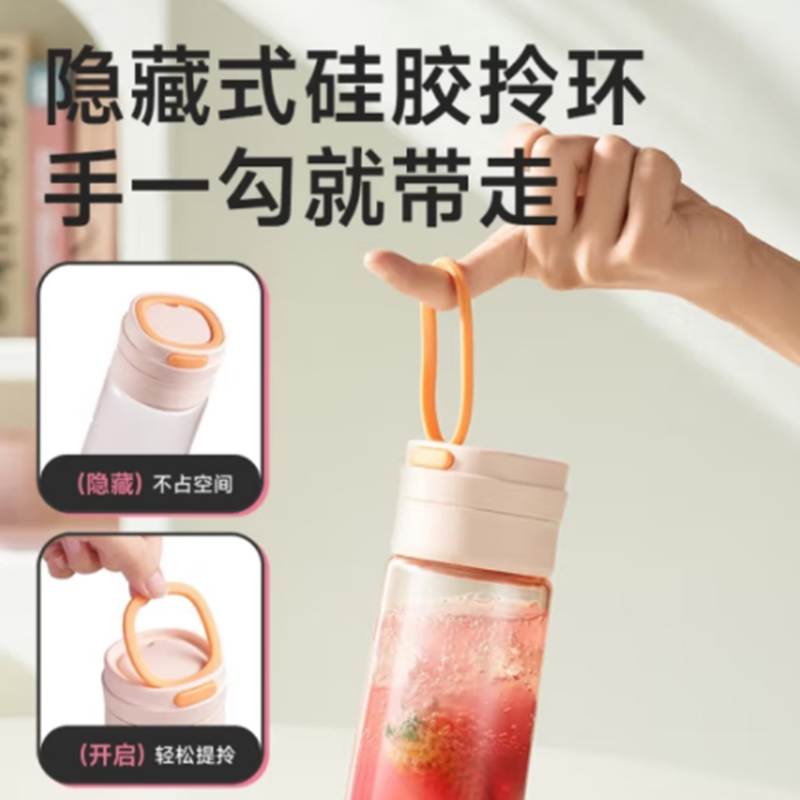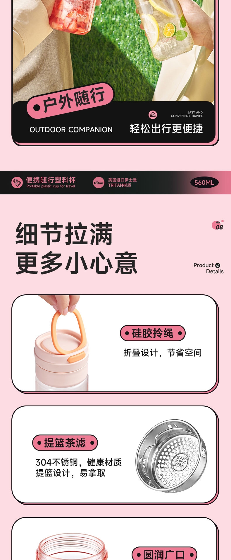 美国进口伊士曼TRITAN材质,饮水更健康;加厚杯身冷热皆可装耐-20~100°C 温差, ;隐藏式硅胶拎环手一勾就带走
