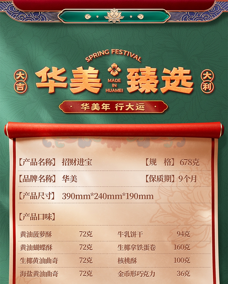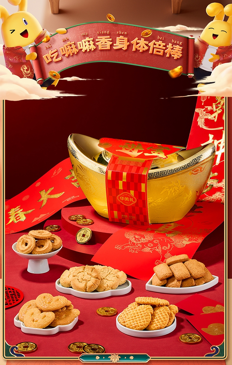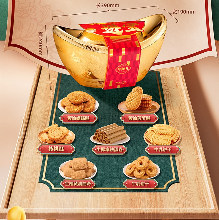 配置:黄油菠萝酥72g 黄油蝴蝶酥72g 生椰黄油曲奇72g 海盐黄油曲奇72g 牛乳饼干94g 生椰拿铁蛋卷160g 核桃酥100g 金币形巧克力36g