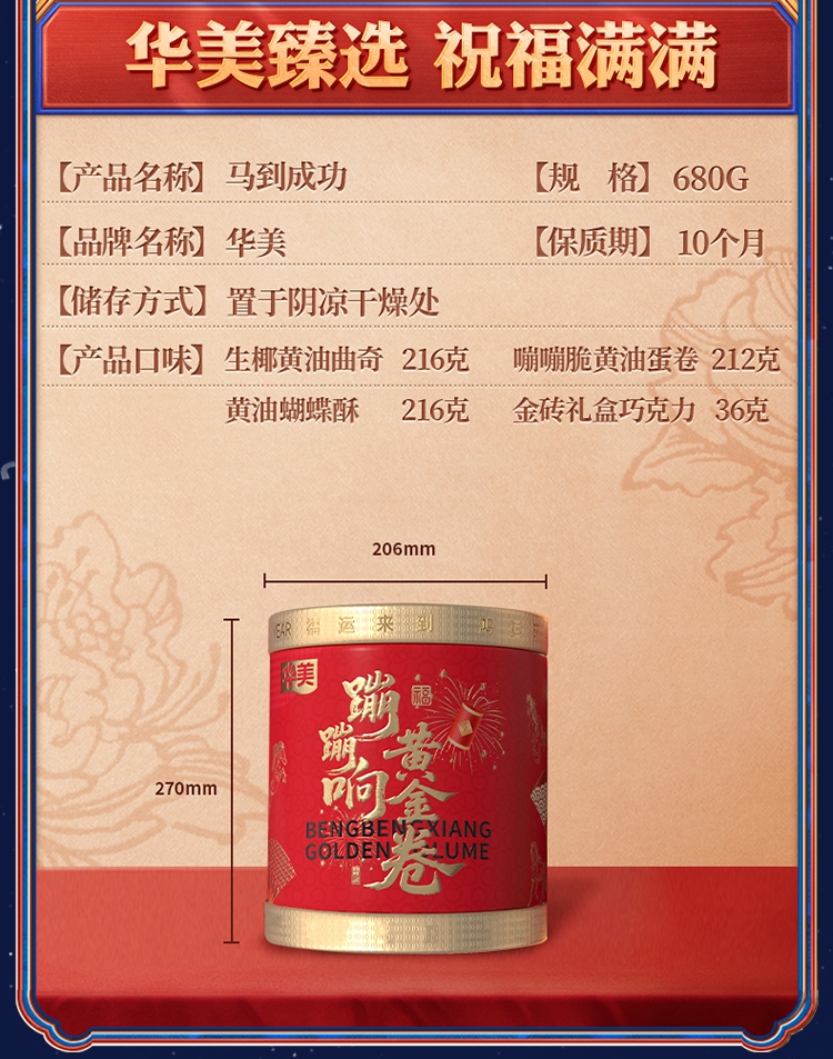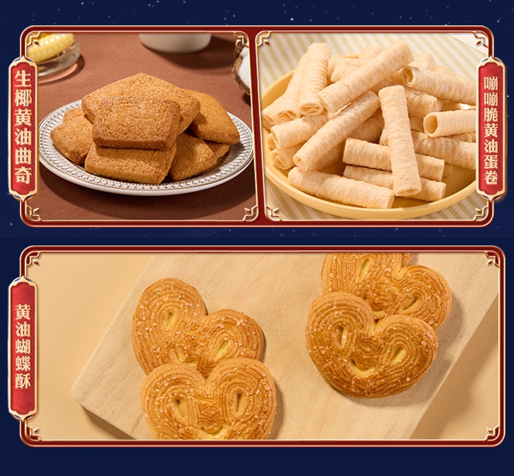 配置:生椰黄油曲奇216g 黄油蝴蝶酥216g 蹦蹦脆黄油蛋卷212g 金砖礼盒巧克力36g
