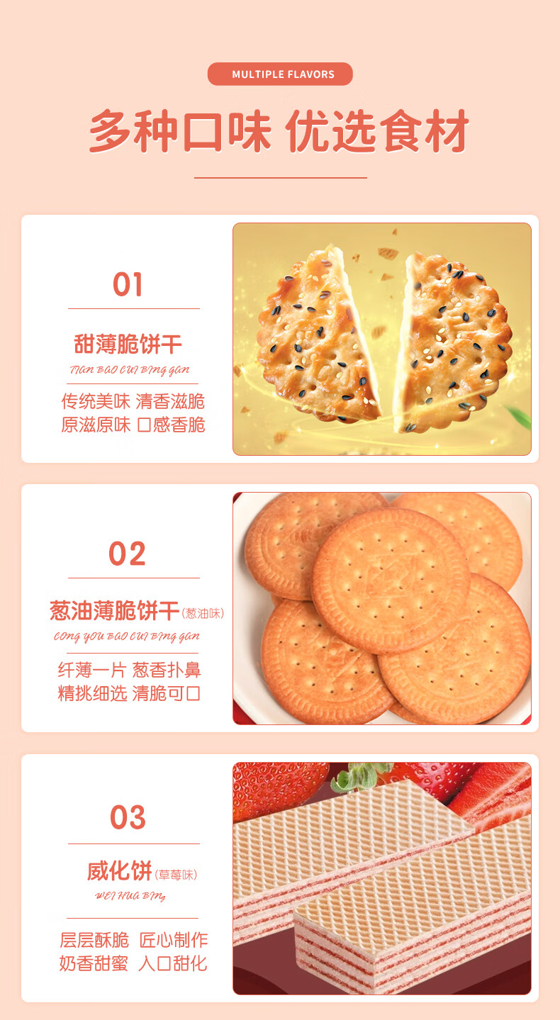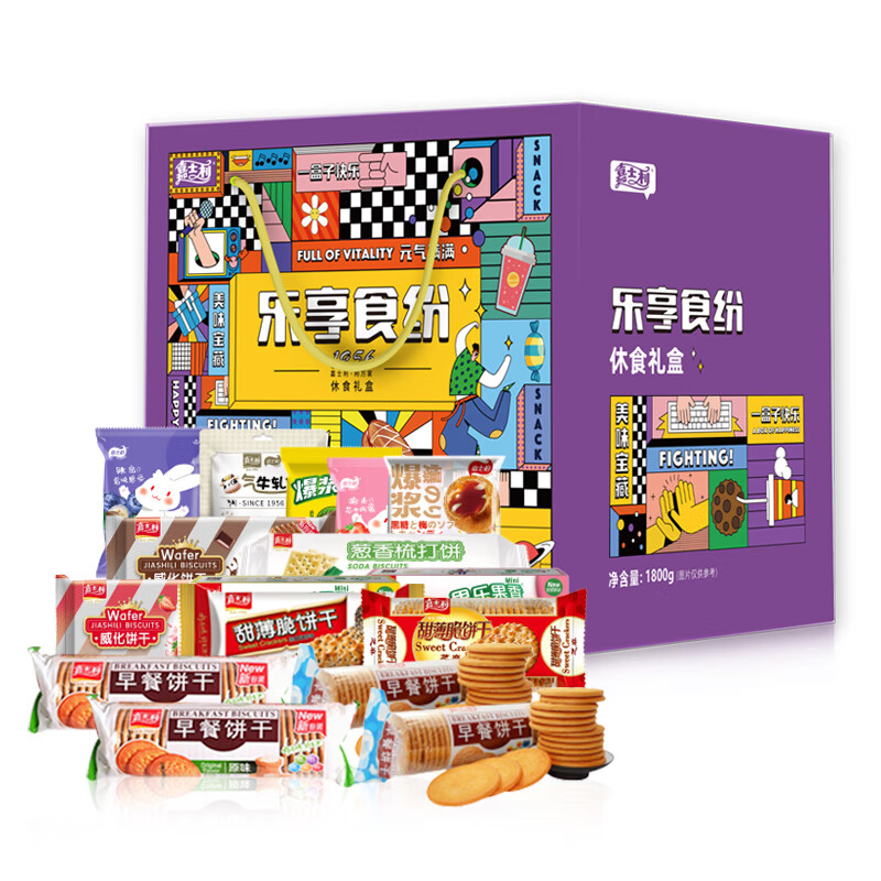 配置:早餐饼干-牛奶味167g*2 早餐饼干-原味 167g*2 威化饼-草莓味 115g*1 威化饼-巧克力味 115g*1 果酱味夹心饼干-青柠味 85g*1 果酱味夹心饼干-草莓味 85g*1 甜薄脆饼干-黑白芝麻215g*1 甜薄脆饼干-红枣味 215g*1 梳打饼-葱香味 200g*2 经典牛轧糖-花生 80g*1 爆浆黑糖话梅软糖 50g*1 爆浆陈皮软糖 50g*1 蓝莓味果酱夹心软糖 63g*1 草莓味果酱夹心软糖 63g*1
