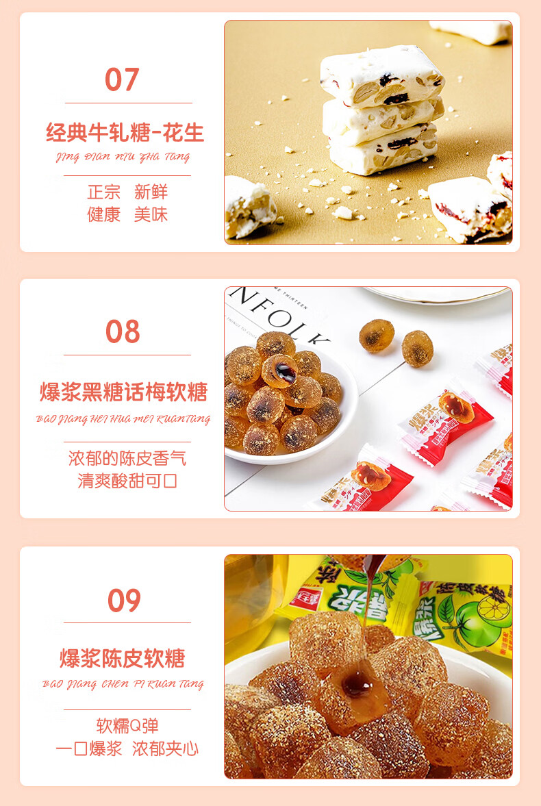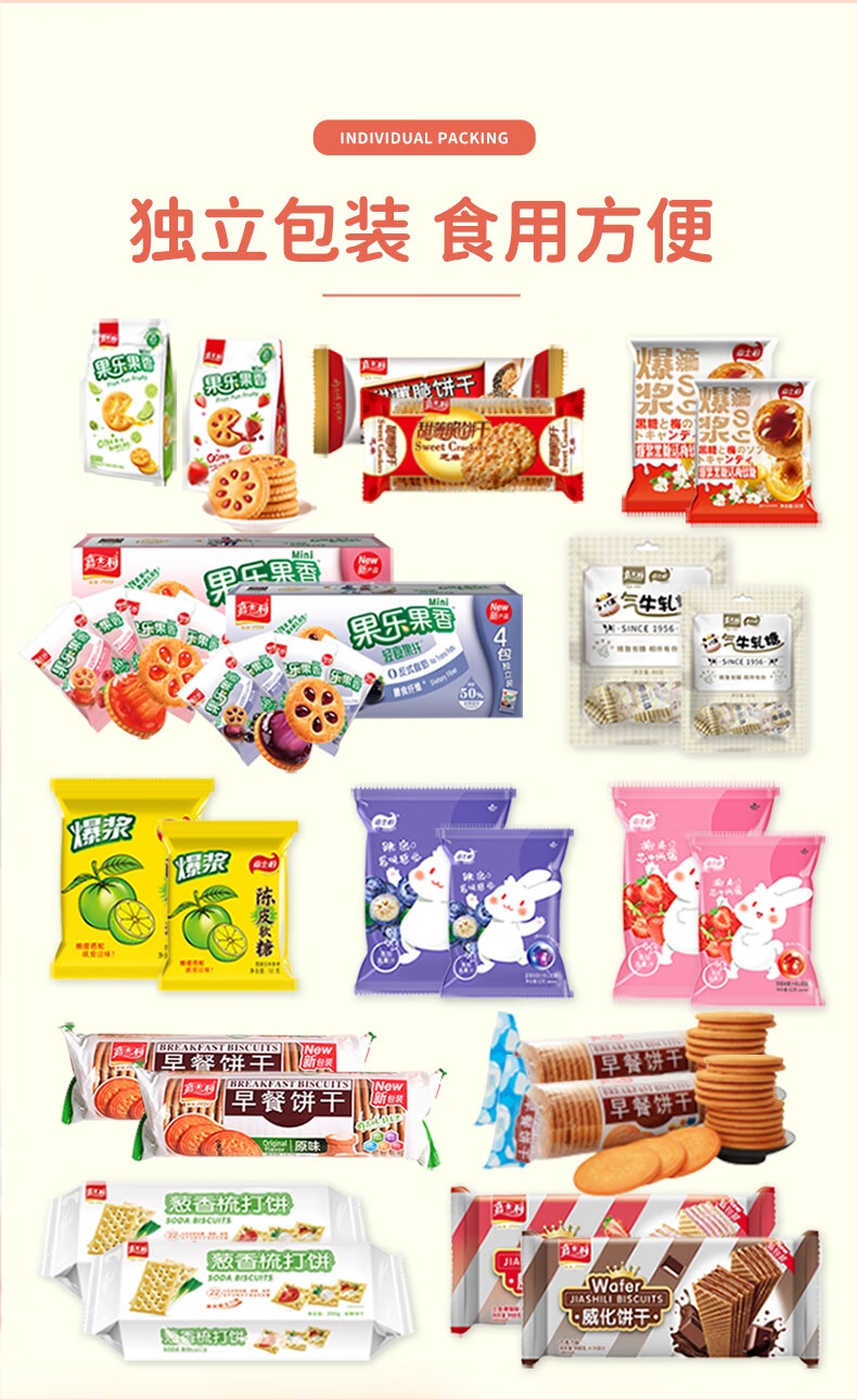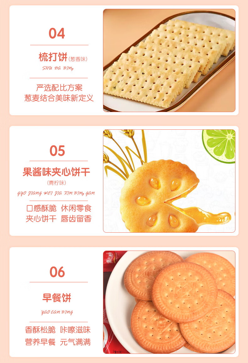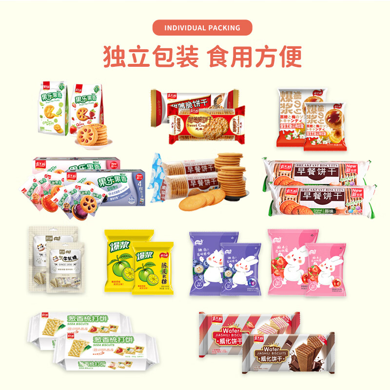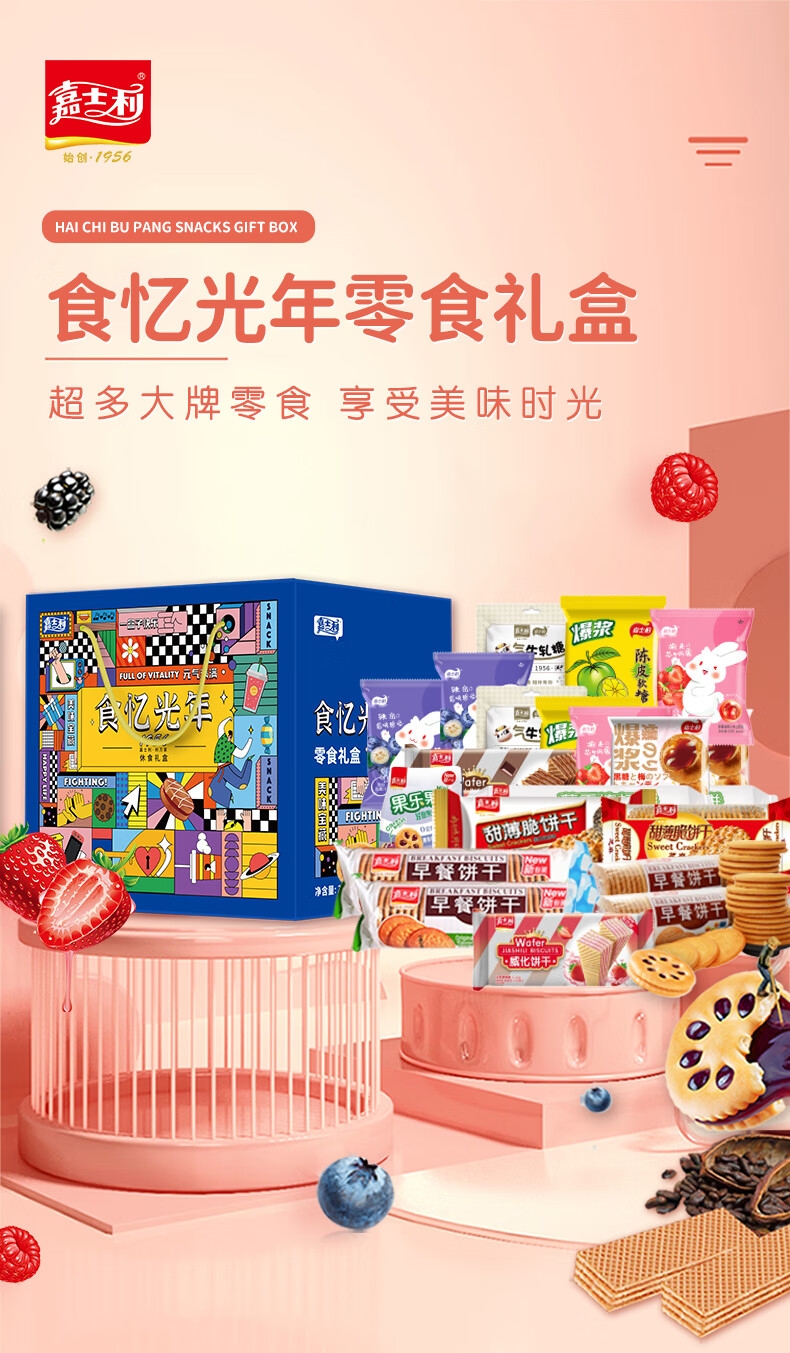 配置:早餐饼干-牛奶味167g*2 早餐饼干-原味 167g*2 威化饼-草莓味 115g*1 威化饼-巧克力味 115g*1 果酱味夹心饼干-青柠味 85g*1 果酱味夹心饼干-草莓味 85g*1 果乐果香轻食果纤夹心饼干-黑加仑 110g*1 果乐果香轻食果纤夹心饼干 -三莓 110g*1 梳打饼-葱香味 200g*2 甜薄脆饼干-黑白芝麻味 215g*1 甜薄脆饼干-红枣味215g*1 经典牛轧糖-花生 80g*2 爆浆黑糖话梅软糖 50g*2 爆浆陈皮软糖 50g*2 蓝莓味果酱夹心软糖 63g*2 草莓味果酱夹心软糖 63g*2
