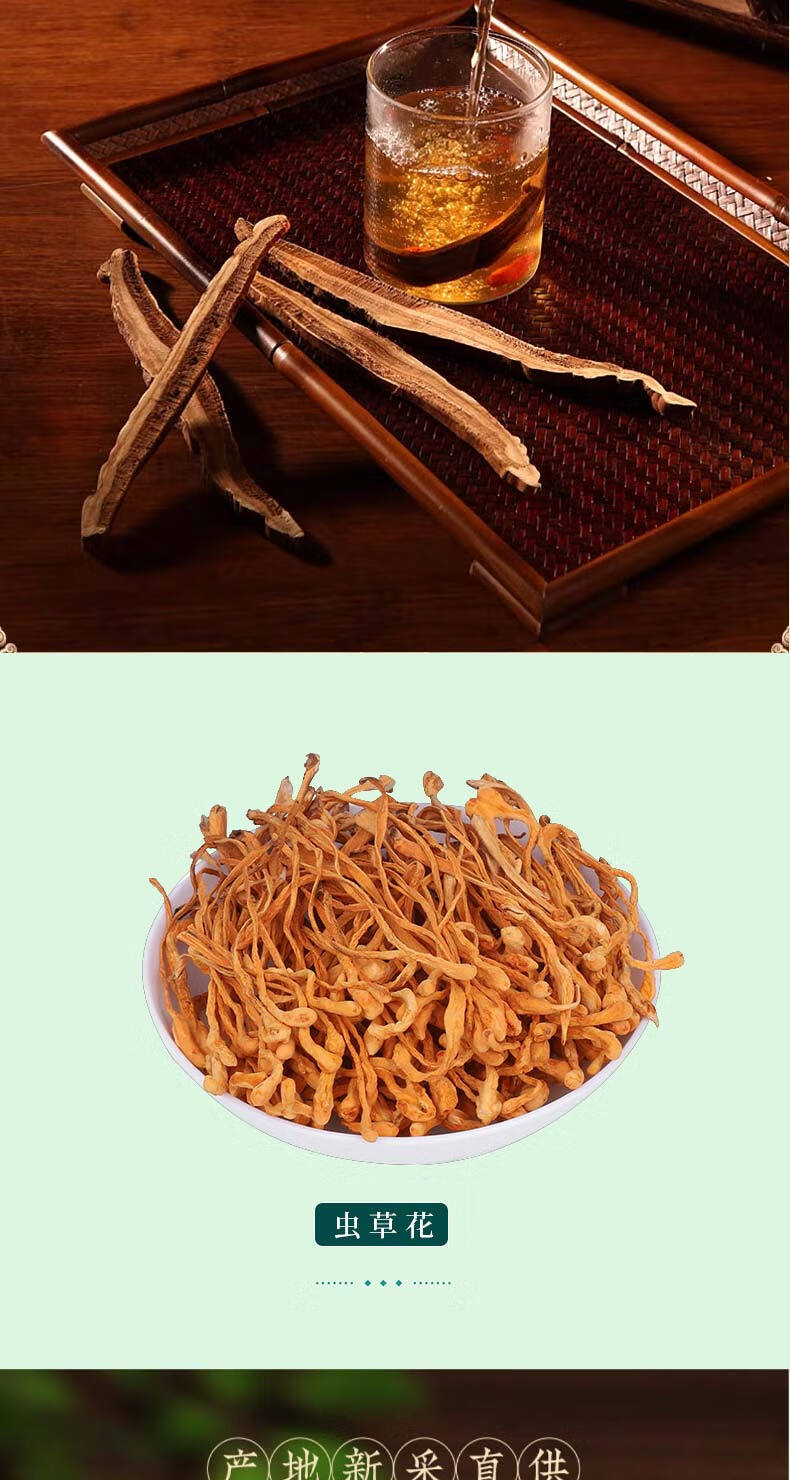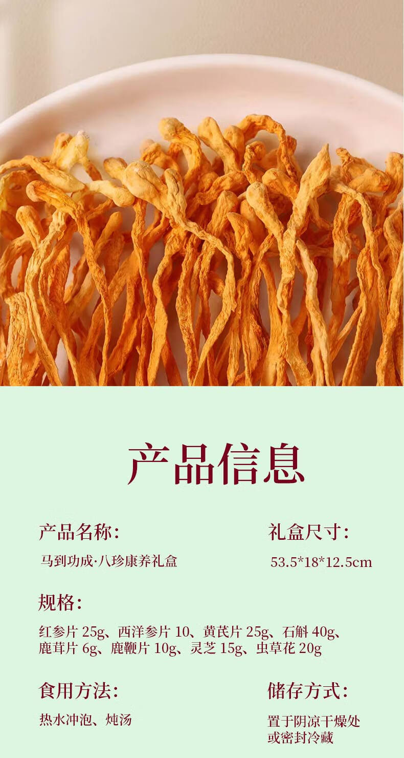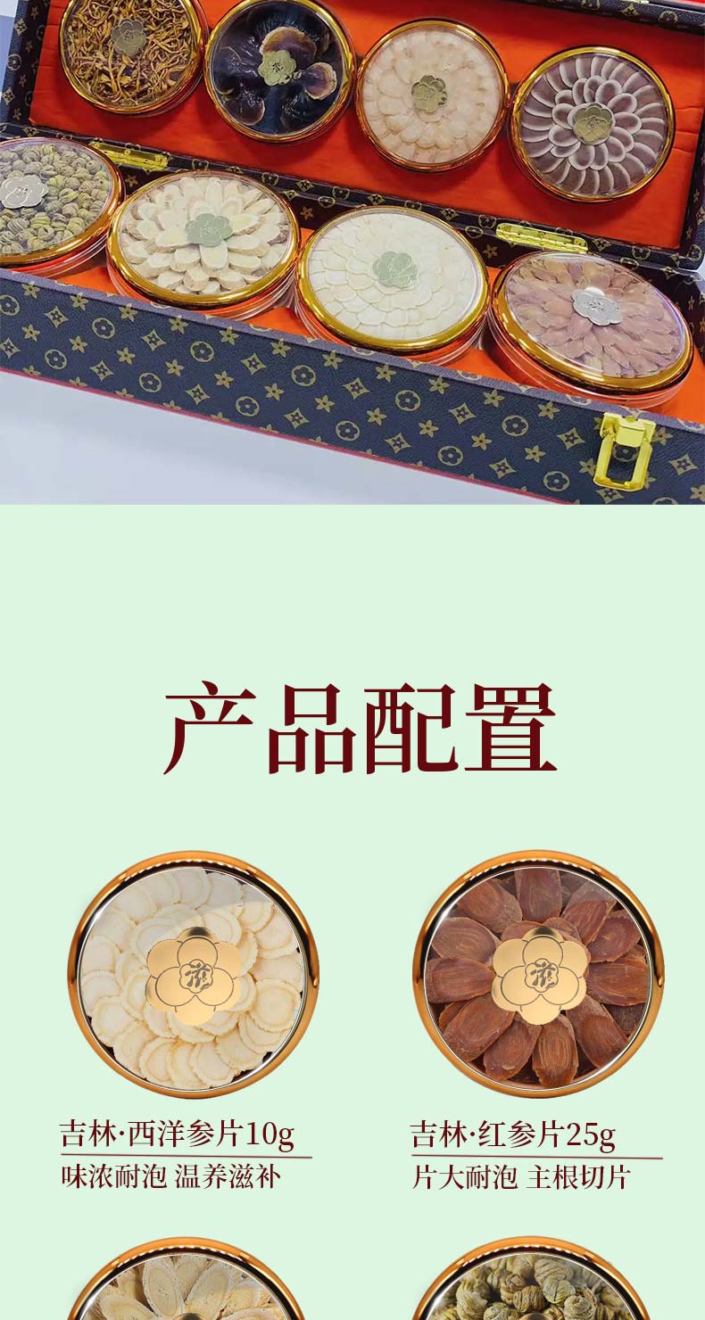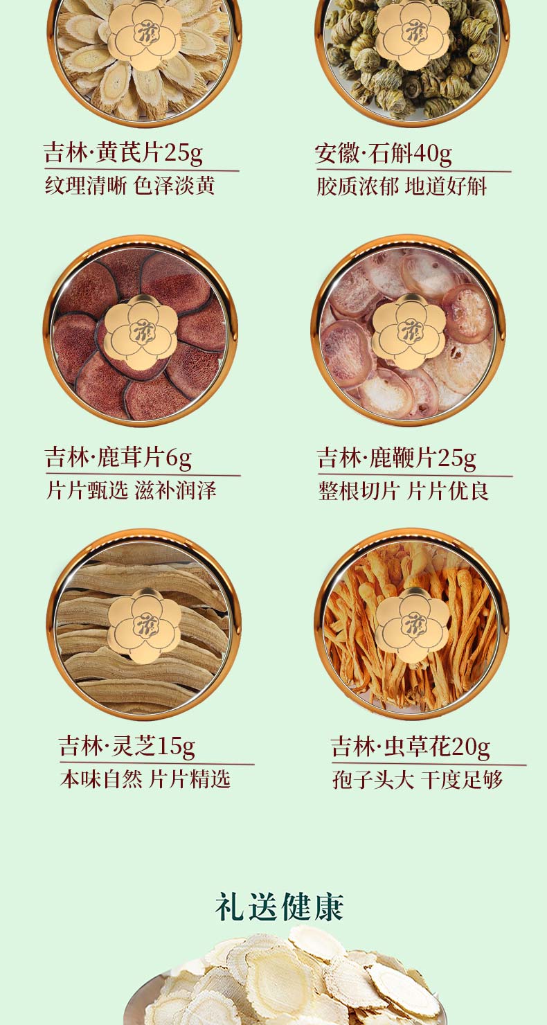 配置清单:红参片25g+西洋参片10g+黄芪片 25g+石斛 40g+鹿茸片6g+鹿鞭片 10g+灵芝15g+虫草花20克