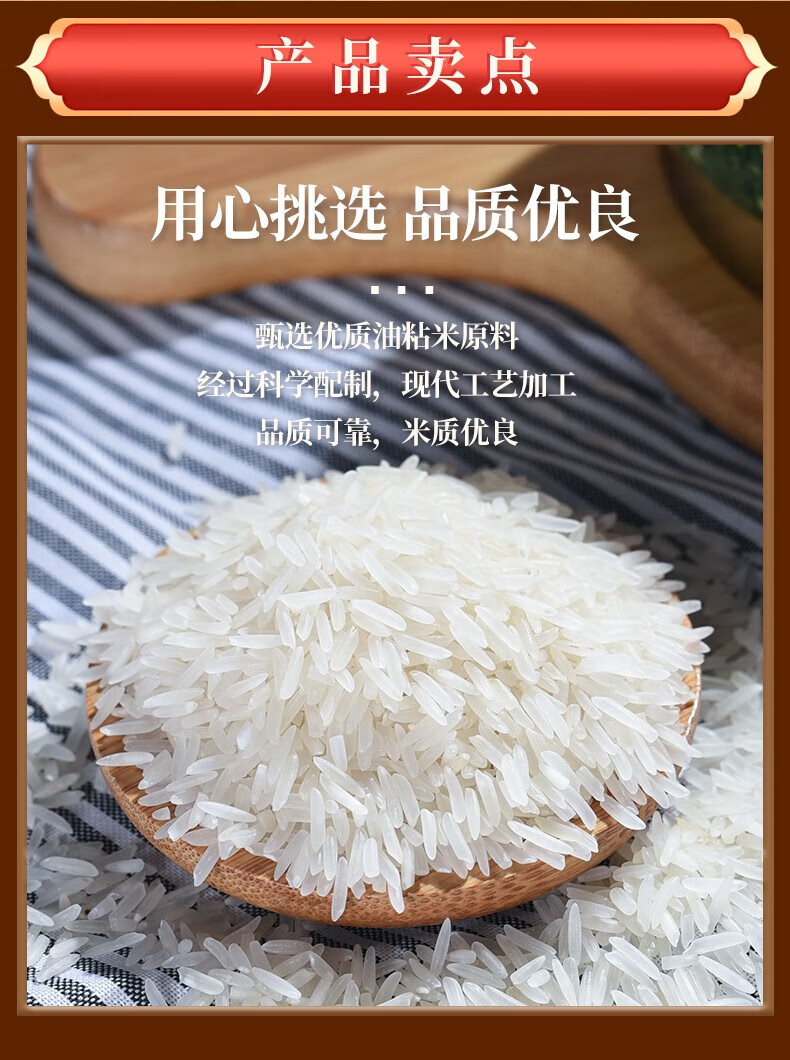 地道油粘 口感否软;油脂丰富,香滑软熟,饭后齿颊留香;甄选优质油粘米原料经过科学配制,现代工艺加工