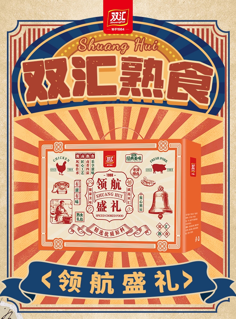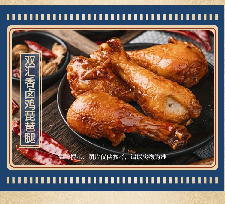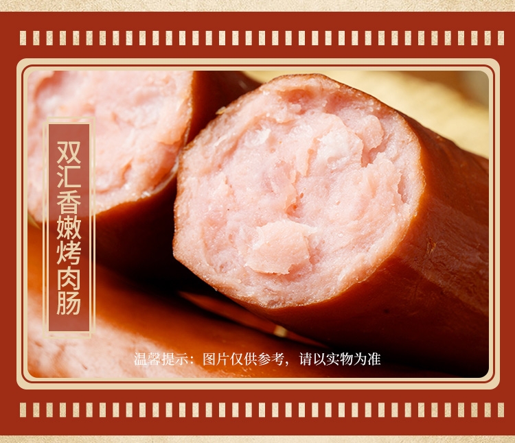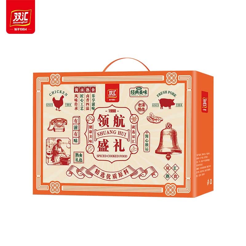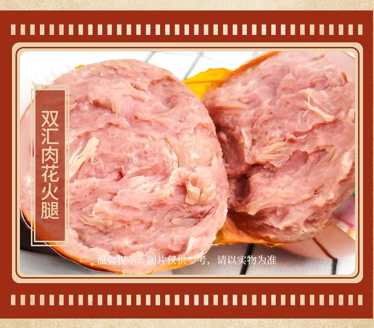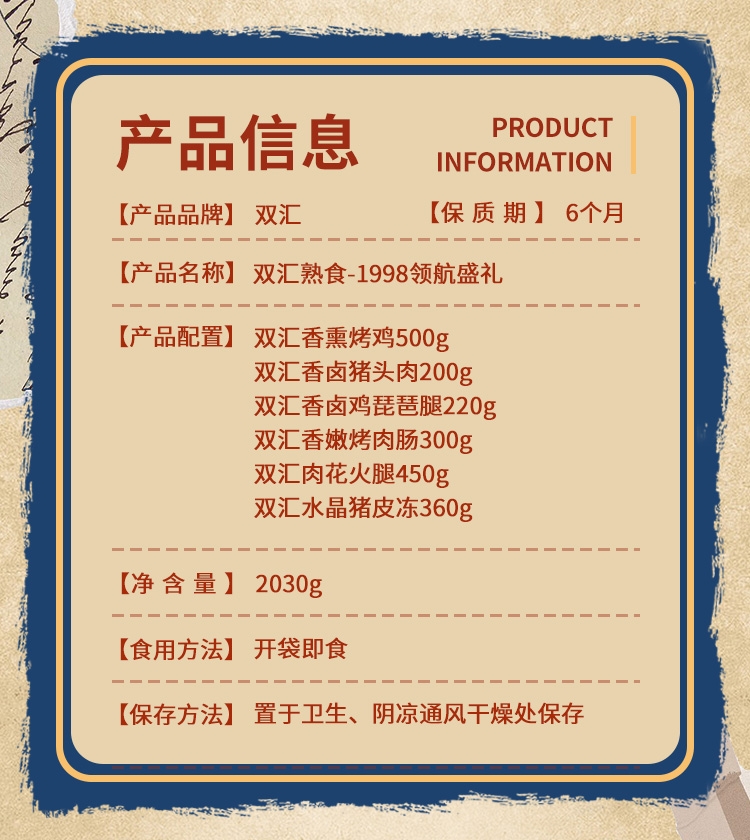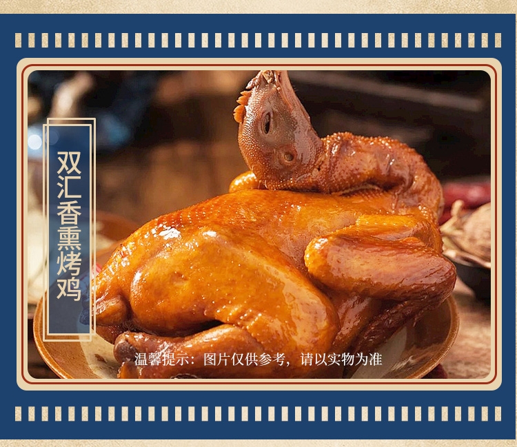 内配:双汇香熏烤鸡500g 双汇香卤猪头肉200g 双汇香卤鸡琵琶腿220g 双汇香嫩烤肉肠300g 双汇肉花火腿450g 双汇水晶猪皮冻360g