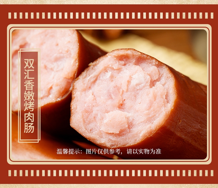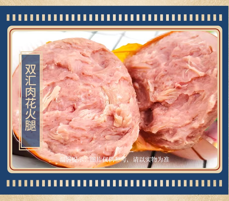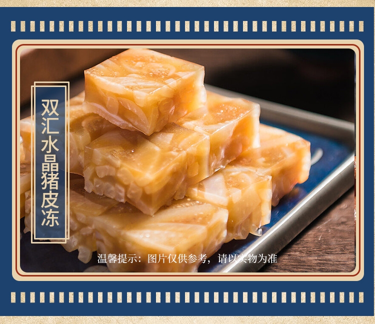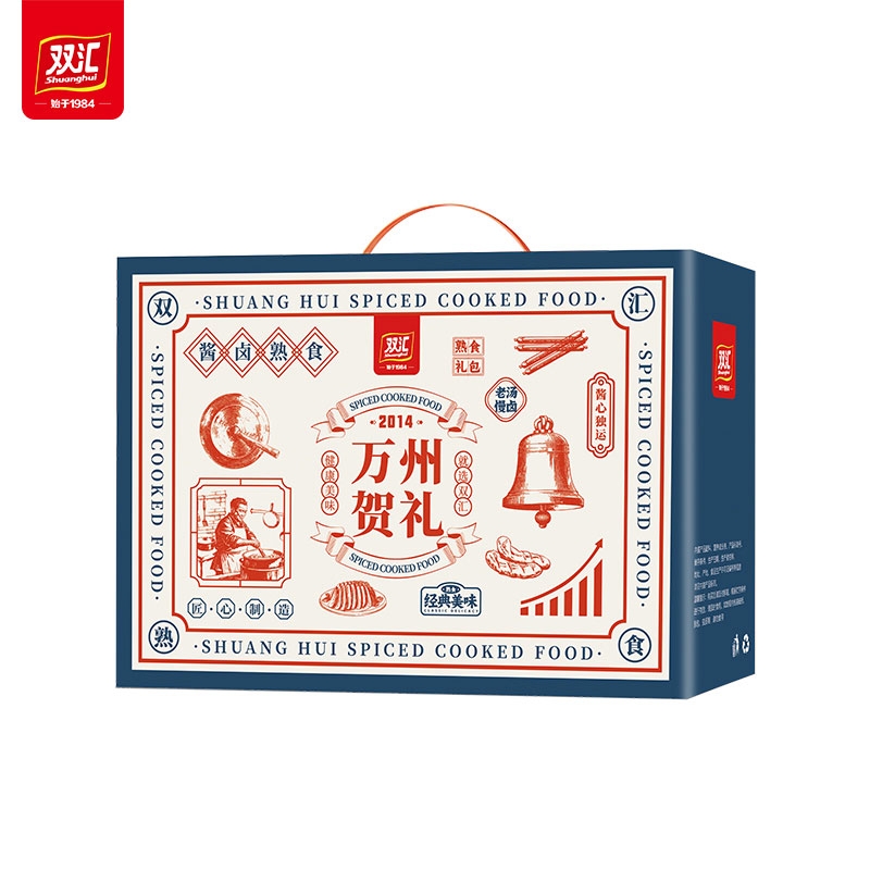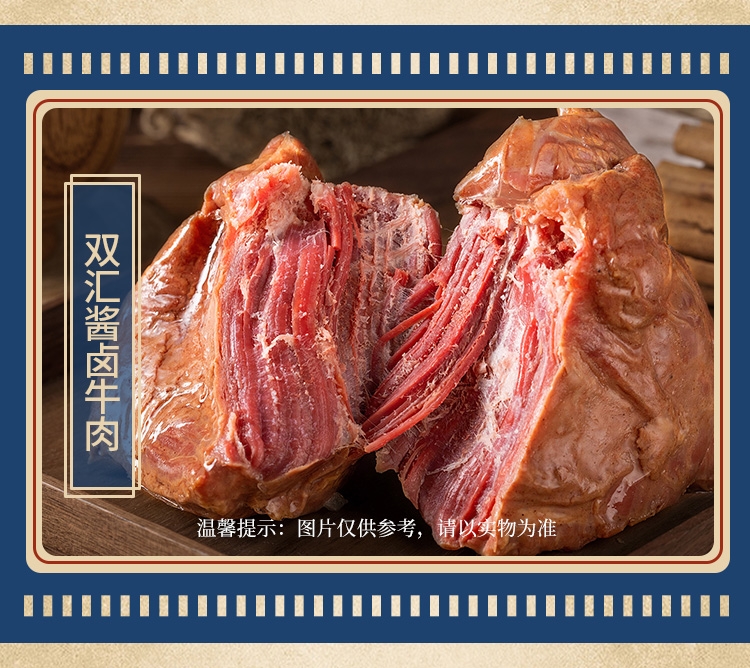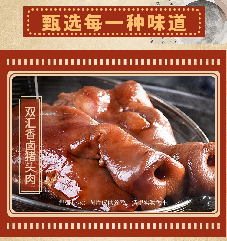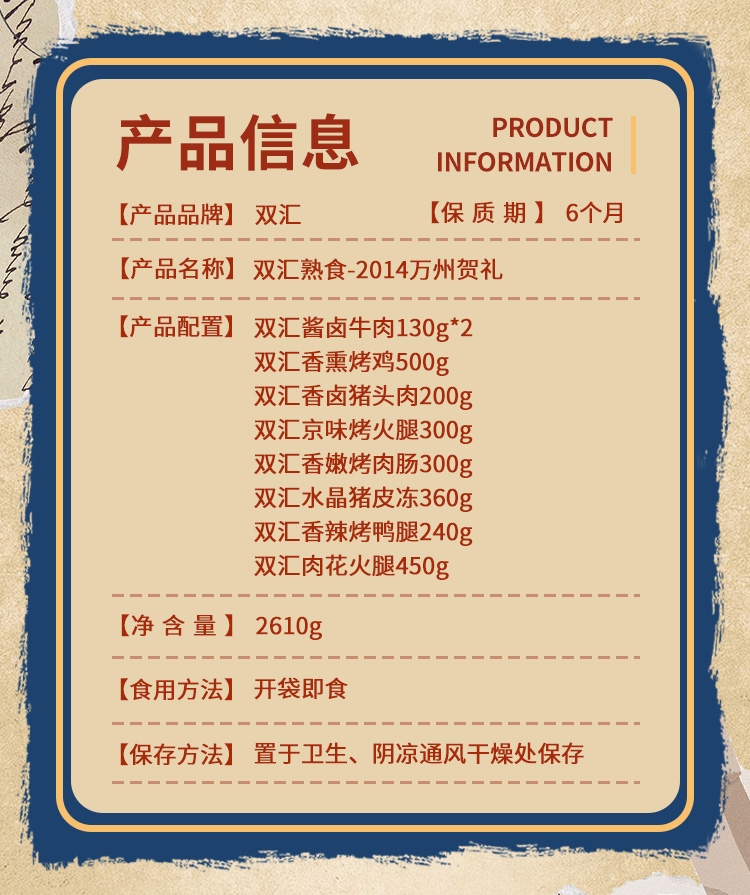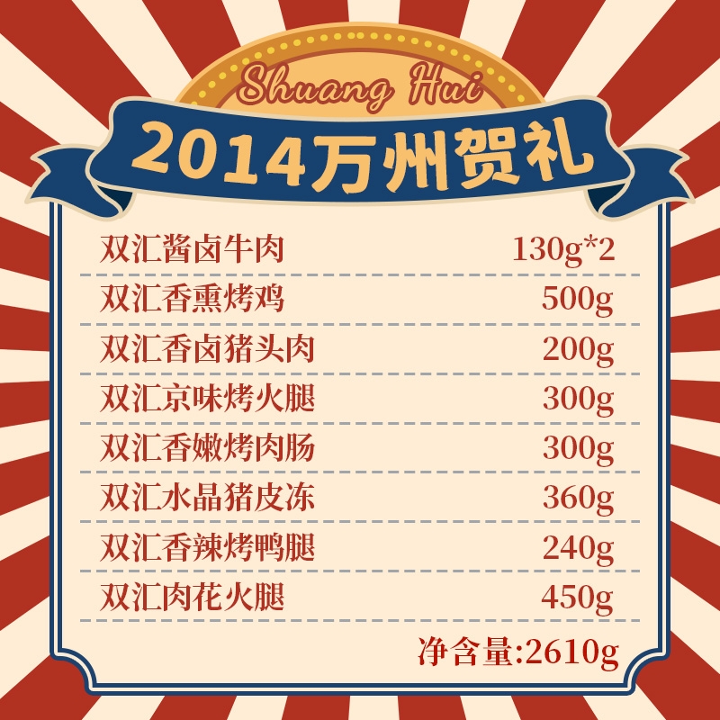 内配:双汇酱卤牛肉130g 双汇酱卤牛肉130g 双汇香熏烤鸡500g 双汇香卤猪头肉200g 双汇京味烤火腿300g 双汇香嫩烤肉肠300g 双汇水晶猪皮冻360g 双汇香辣烤鸭腿240g 双汇肉花火腿450g