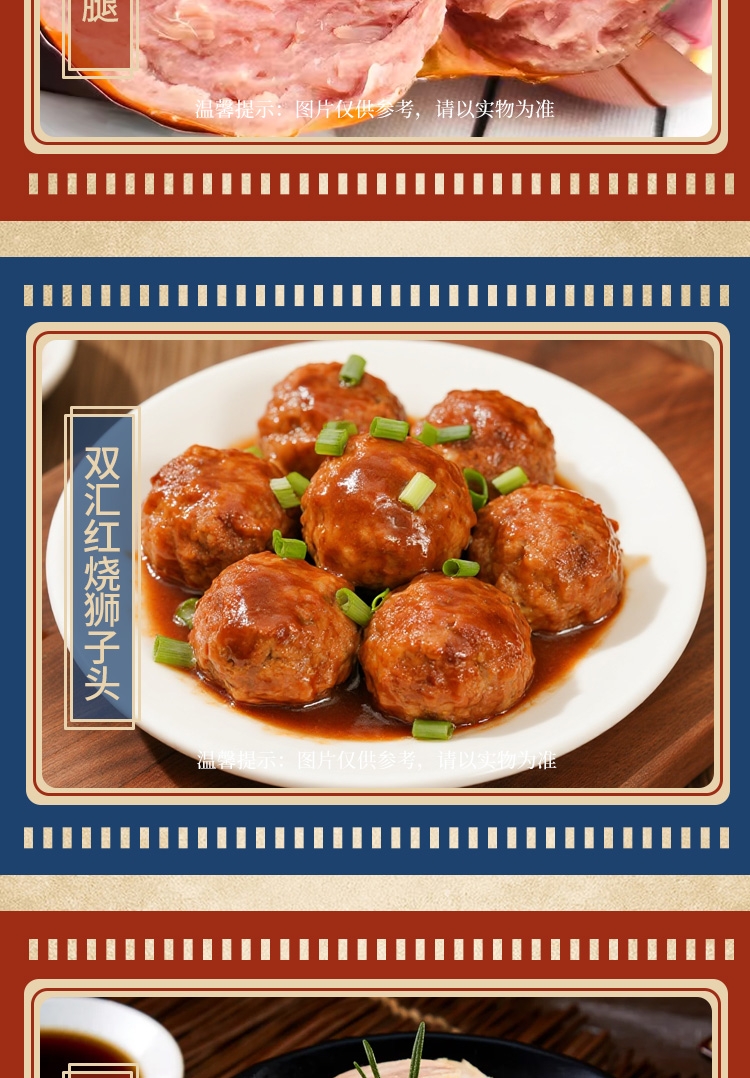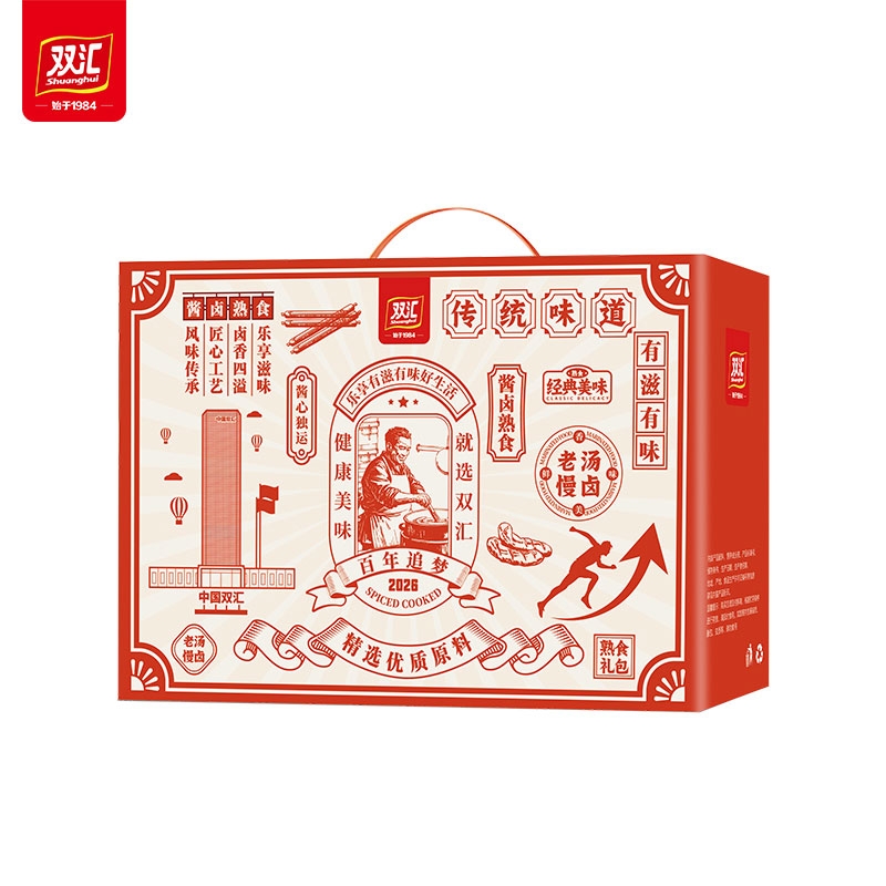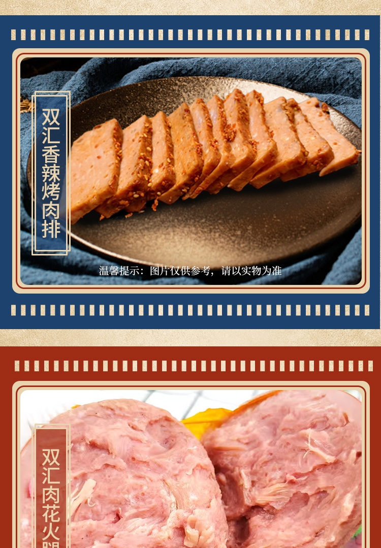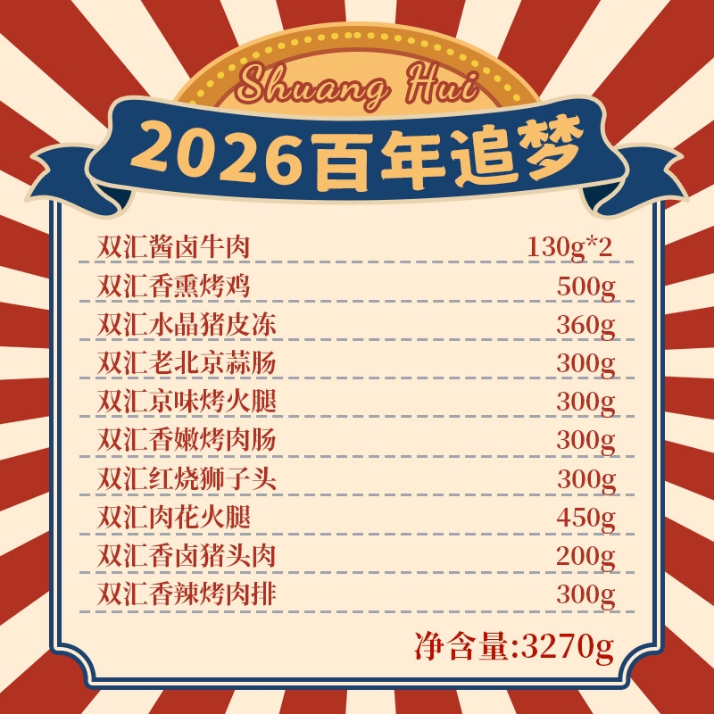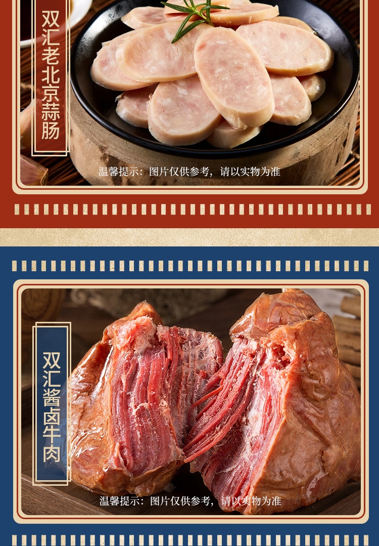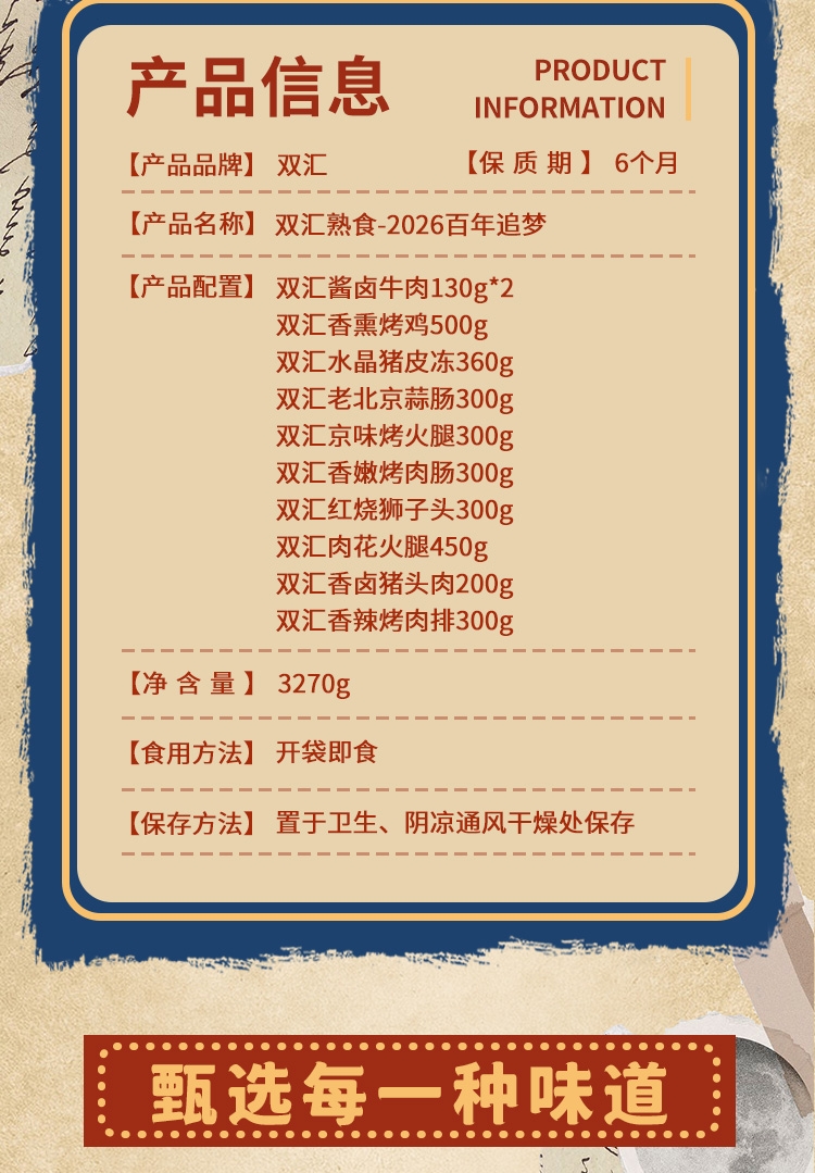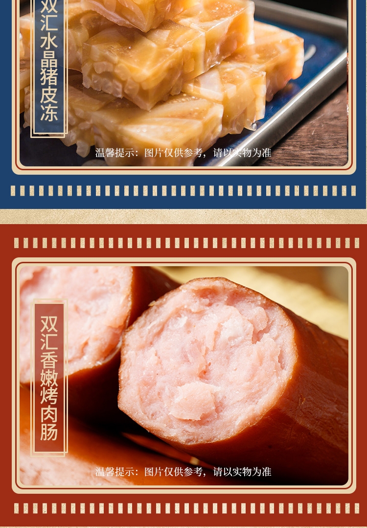 内配:双汇酱卤牛肉130g 双汇酱卤牛肉130g 双汇香熏烤鸡500g 双汇水晶猪皮冻360g 双汇老北京蒜肠300g 双汇京味烤火腿300g 双汇香嫩烤肉肠300g 双汇五香卤猪肝250g 双汇肉花火腿450g 双汇香卤猪头肉200g 双汇香辣烤肉排300g