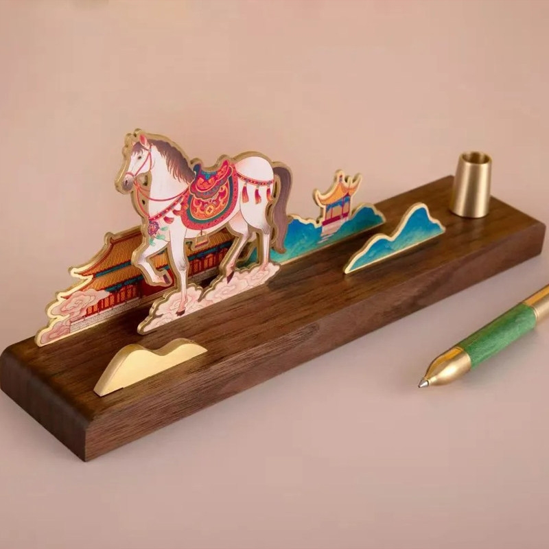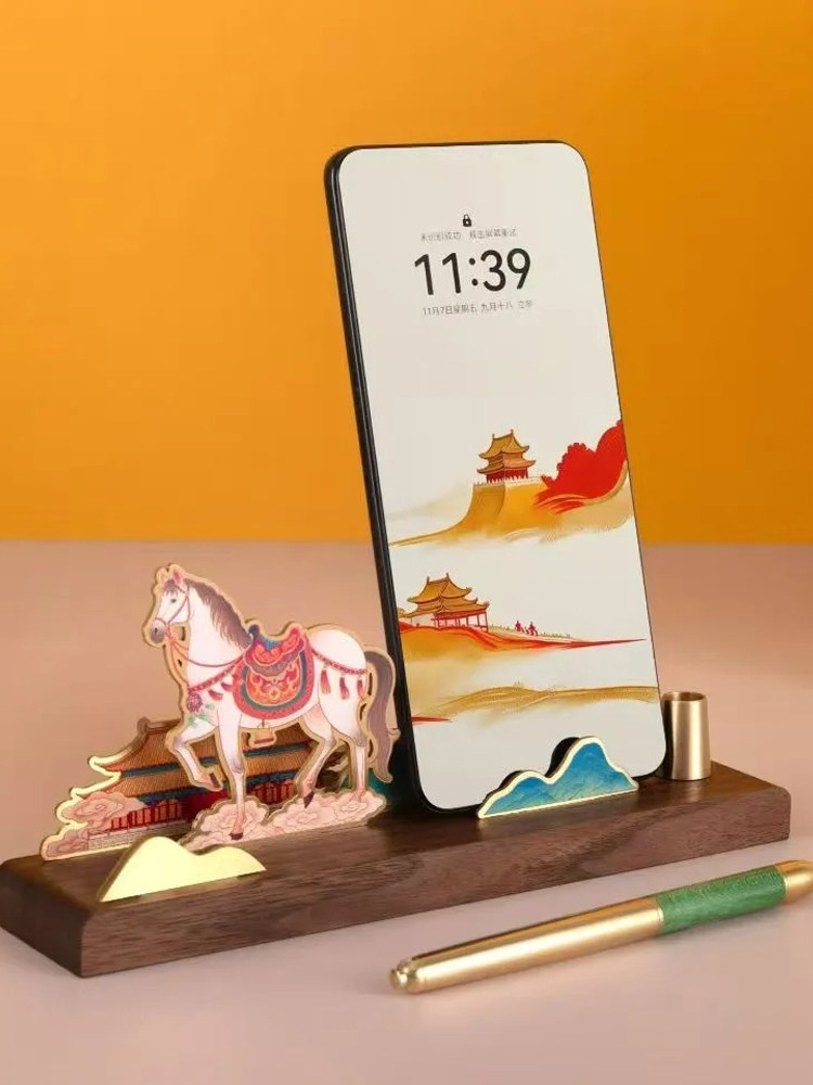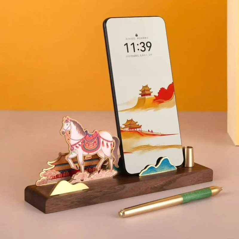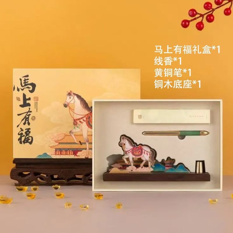 马上有福奢华笔座,山形作手机支架;前面设香插、另配黄铜笔。;商务赠礼显格调,图案定制更彰专属心意