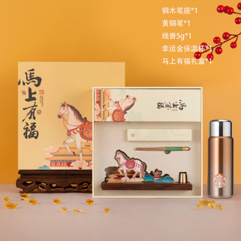 星巴克Max版配置:铜木笔座×1 黄铜笔×1 线香5g×1 幸运金保温杯×1 说明书×1 手提袋×1
