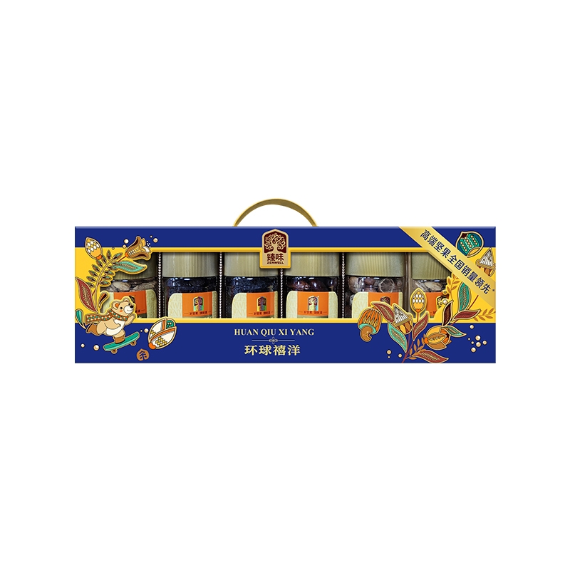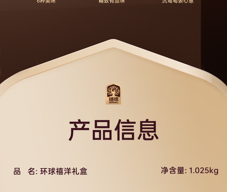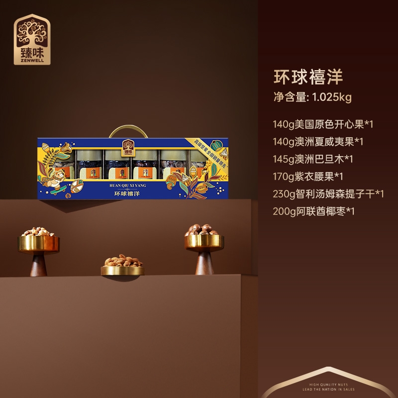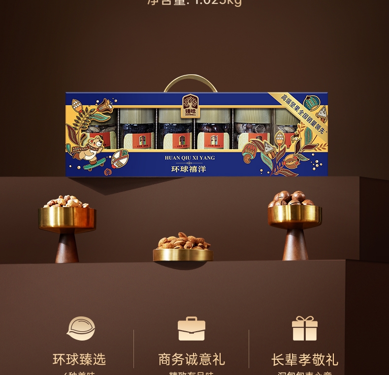 环球禧洋,长方形开窗设计象征诚意满满一目了然;打开礼盒迎来新的一年,为您送去福禄双全,幸福美满;净含量:1025g,4种坚果,2种果干