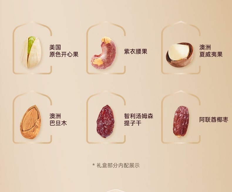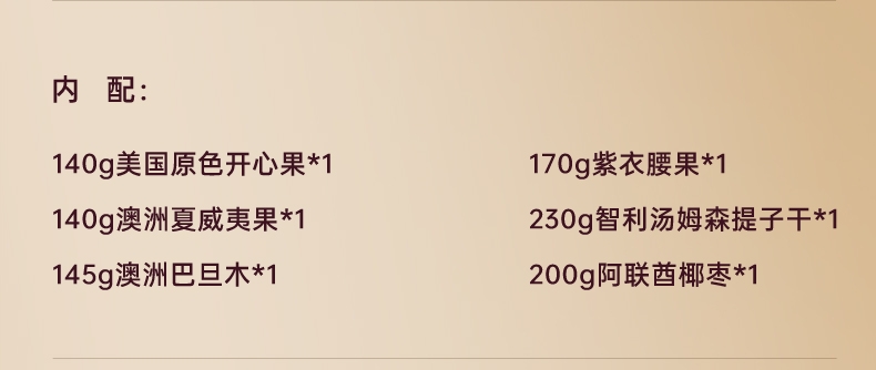 配置清单:1、臻味140g美国原色开心果*1 2、臻味140g澳洲夏威夷果*1 3、臻味145g澳洲巴旦木*1 4、臻味170g紫衣腰果*1 5、臻味230g智利汤姆森提子干*1 6、臻味200g阿联酋椰枣*1