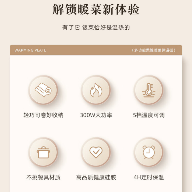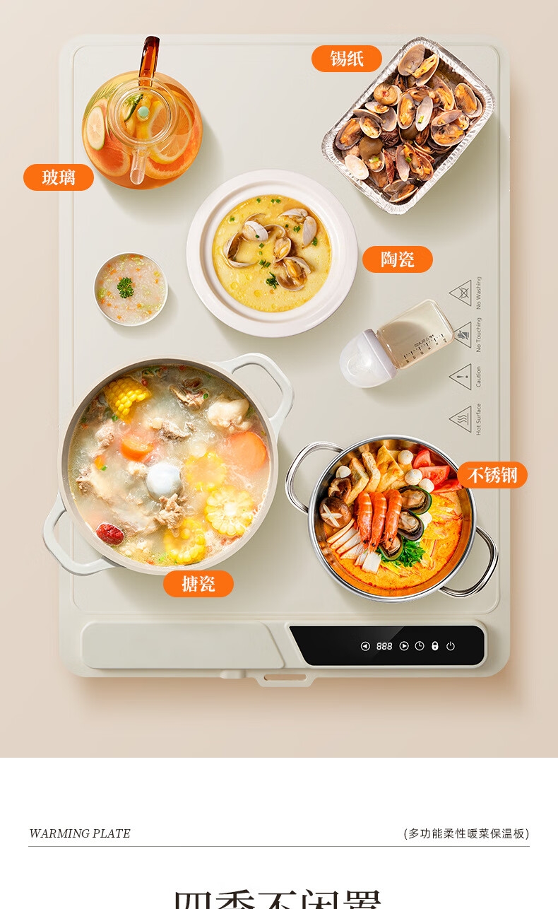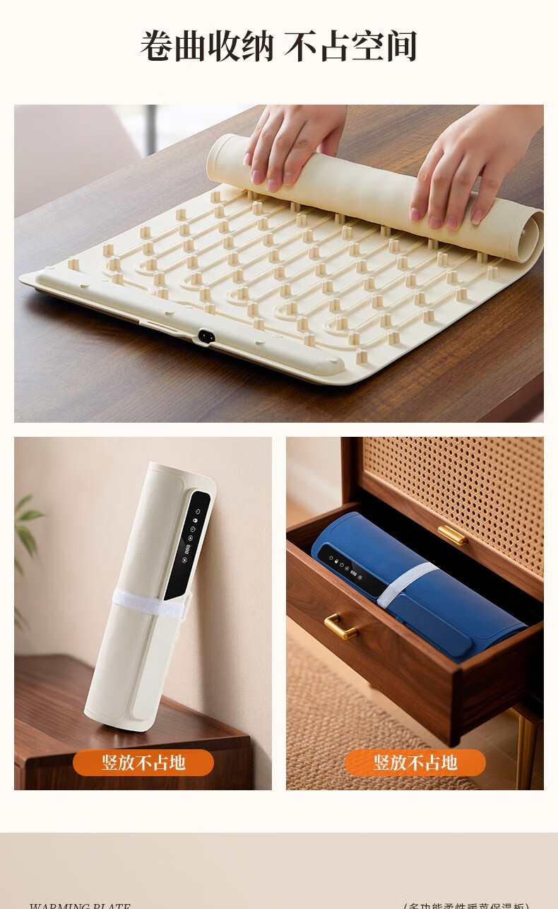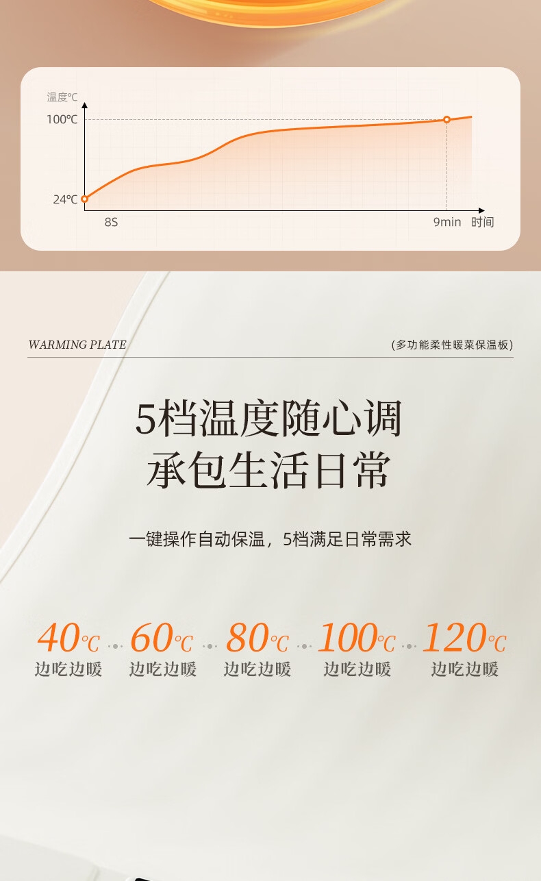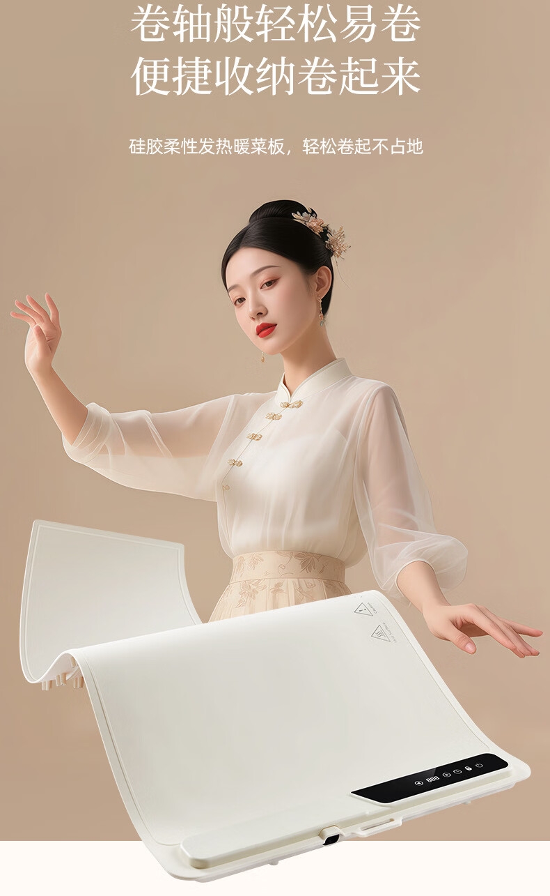 纤薄机身,柔性硅胶材质,卷曲收纳,不占空间;百搭不挑锅,无需专门餐具,摆上就能加热;智能变频控温,5档温度调节,4小时定时保温;童锁设计,贴心呵护,家人更安心;高温耐热金属面板,防水隔污,无惧汤渍,光泽易清洁