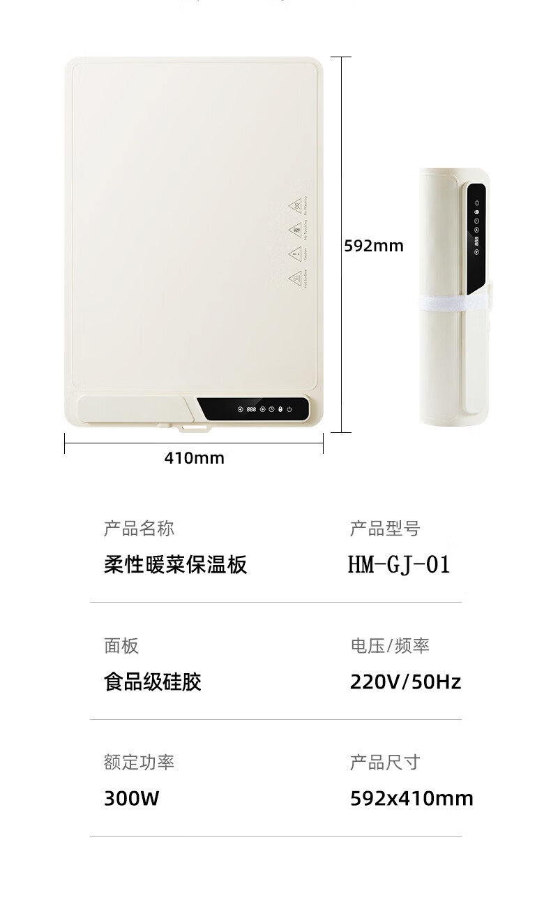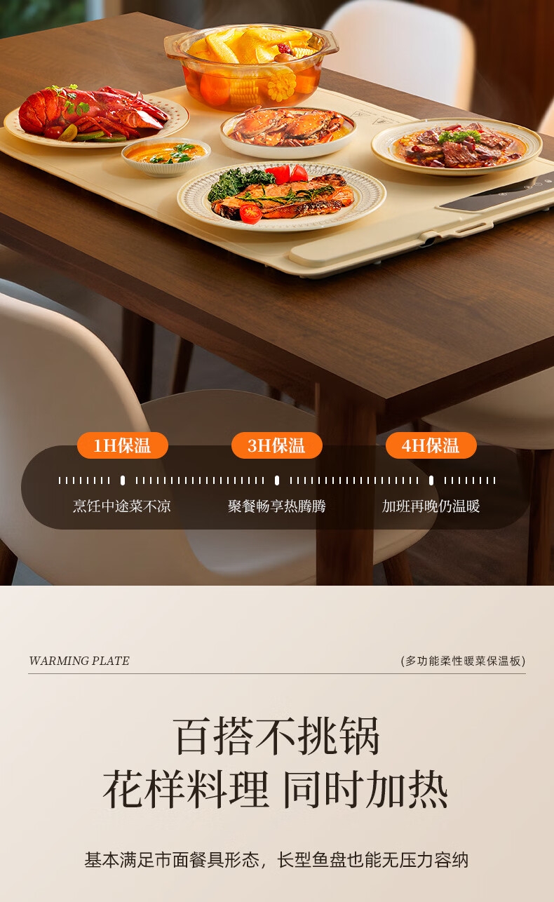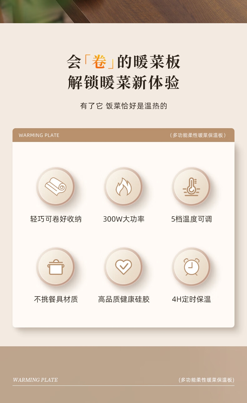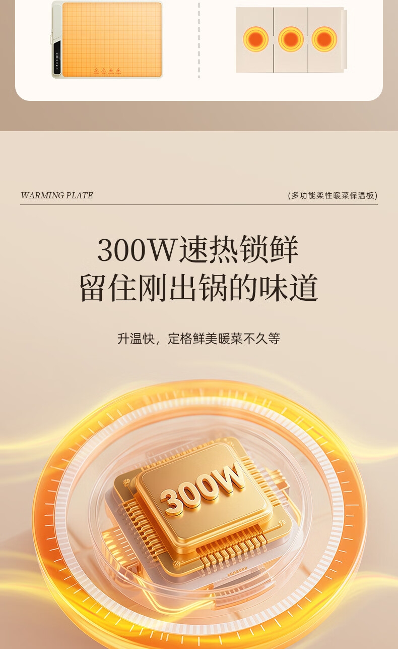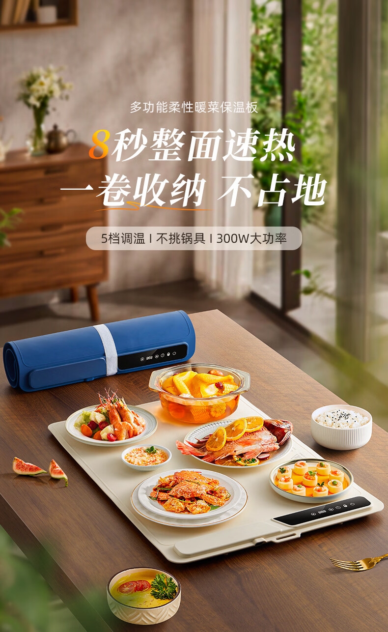 纤薄机身,柔性硅胶材质,卷曲收纳,不占空间;百搭不挑锅,无需专门餐具,摆上就能加热;智能变频控温,5档温度调节,4小时定时保温;童锁设计,贴心呵护,家人更安心;高温耐热金属面板,防水隔污,无惧汤渍,光泽易清洁