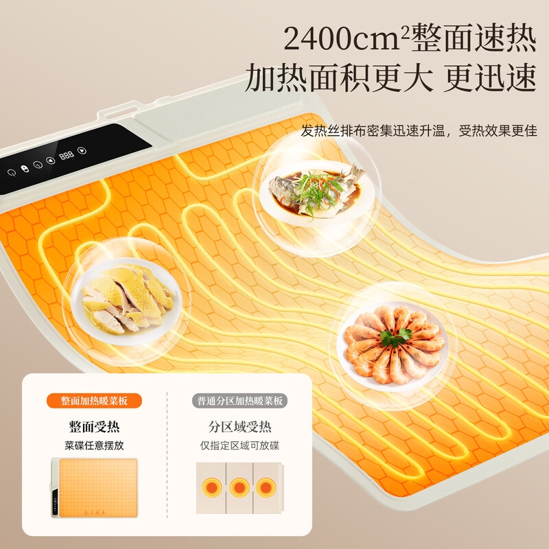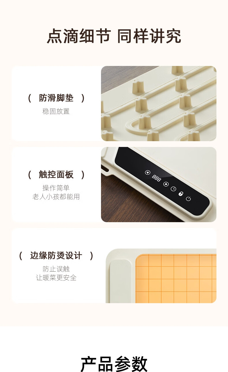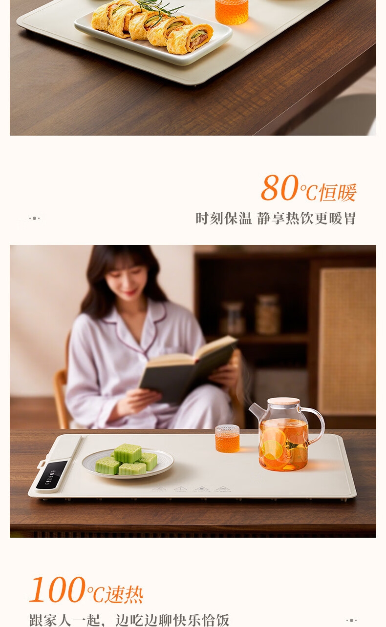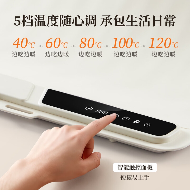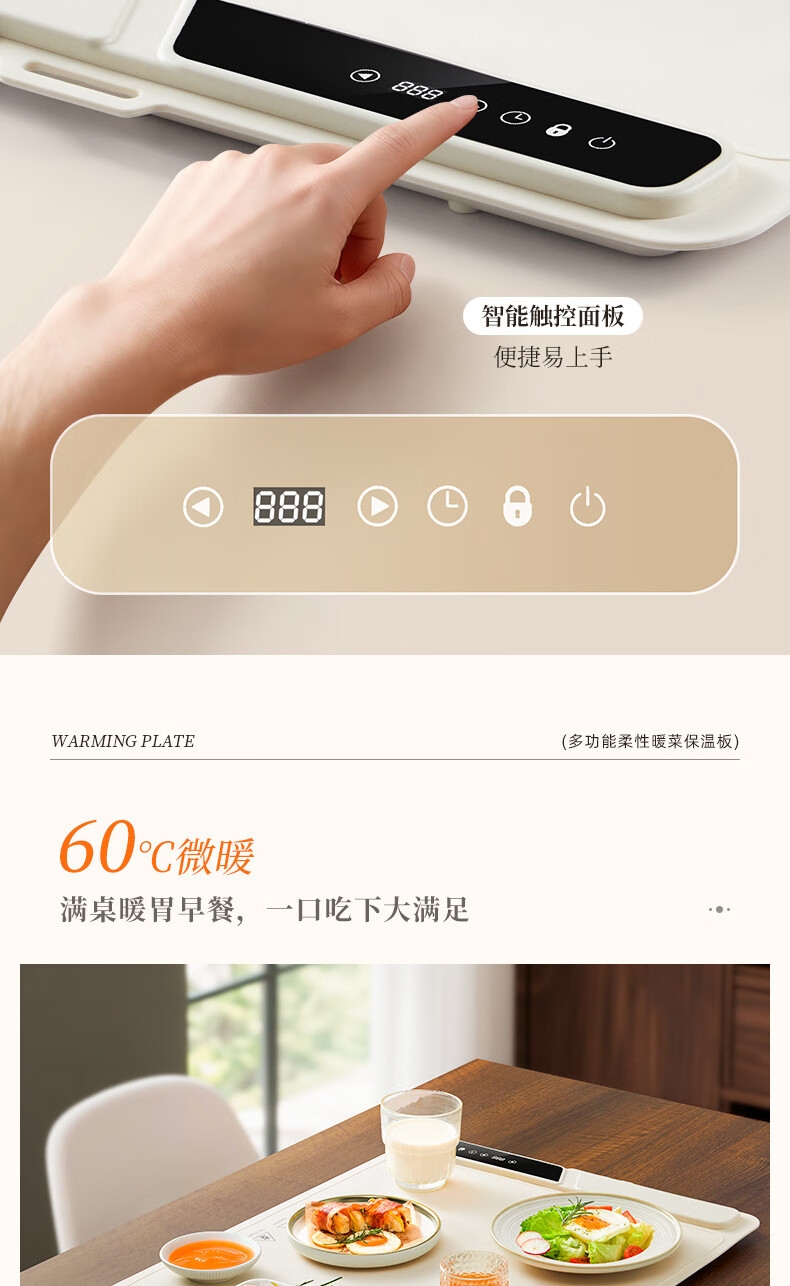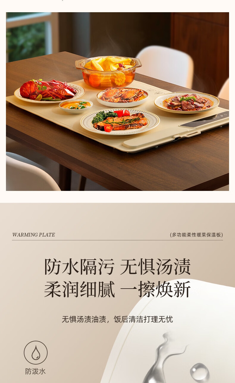 纤薄机身,柔性硅胶材质,卷曲收纳,不占空间;百搭不挑锅,无需专门餐具,摆上就能加热;智能变频控温,5档温度调节,4小时定时保温;童锁设计,贴心呵护,家人更安心;高温耐热金属面板,防水隔污,无惧汤渍,光泽易清洁