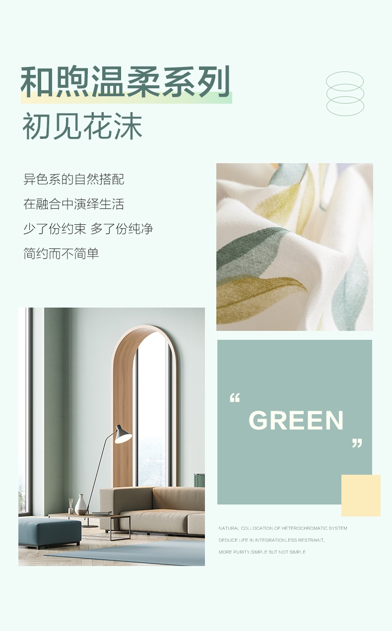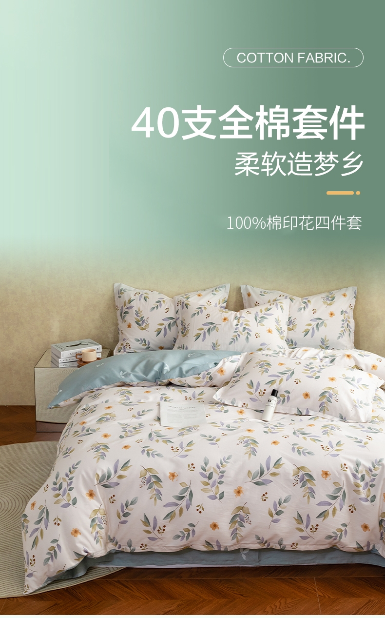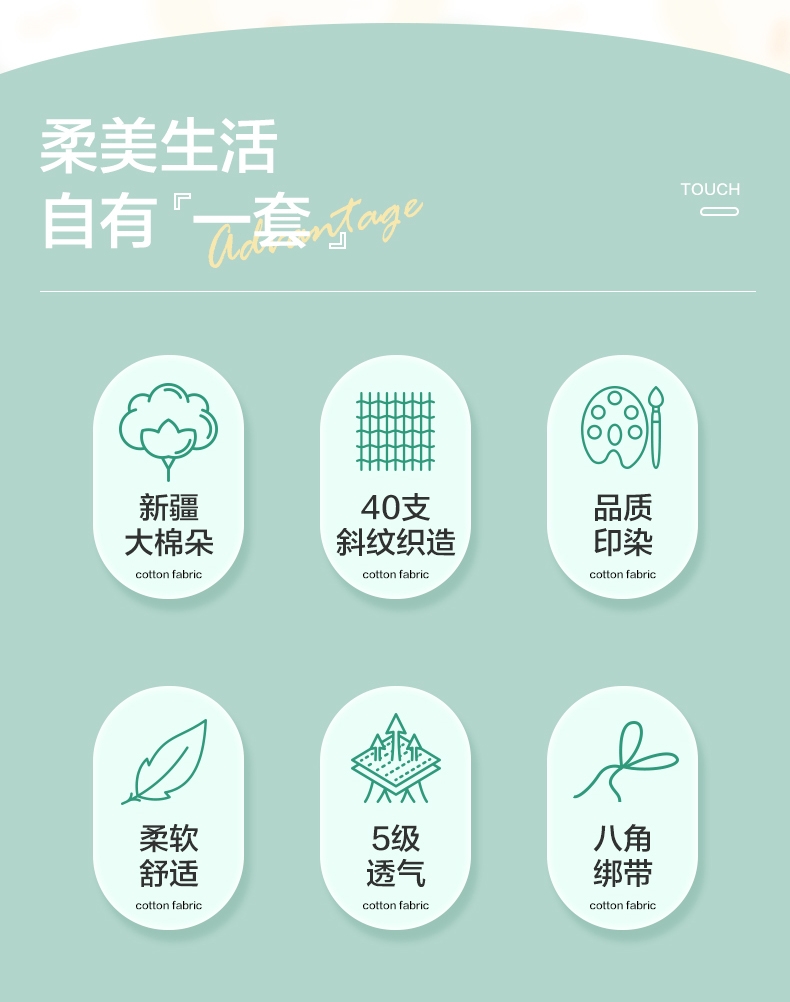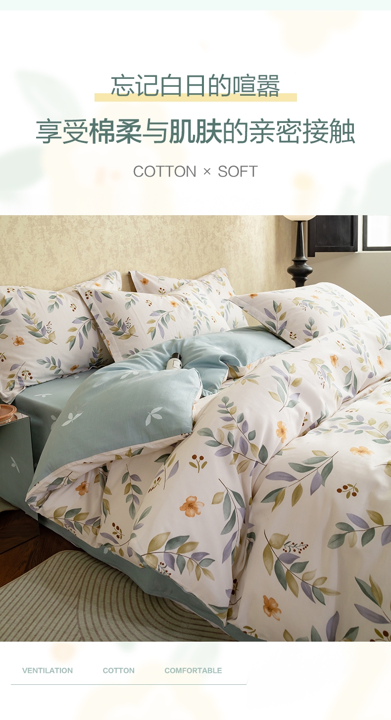 AB双版印花,清爽的印花设计,清新淡雅;天然棉花具有较好的染色效果;透气性强,不易起球,对人体无刺激,贴身感觉温暖舒适