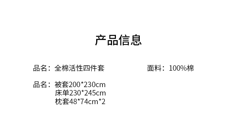 规格:被套200*230cm 床单230*245cm 枕套48*74cm*2