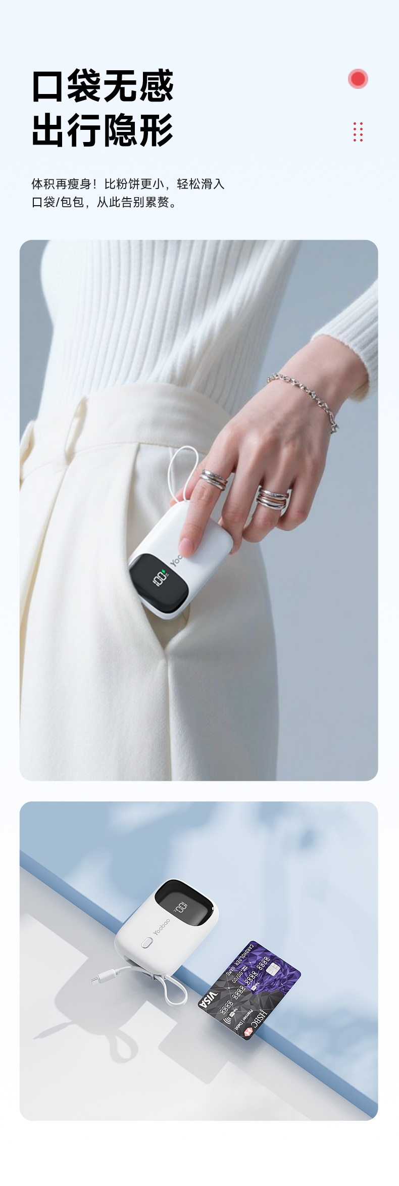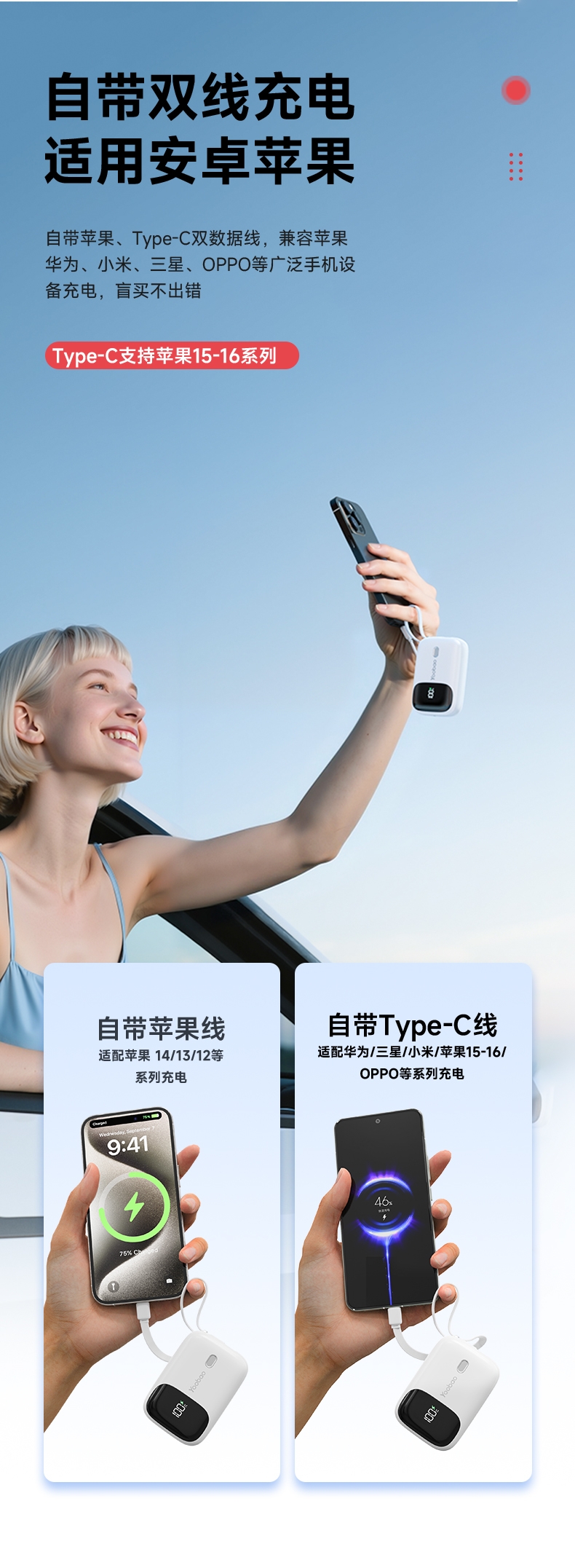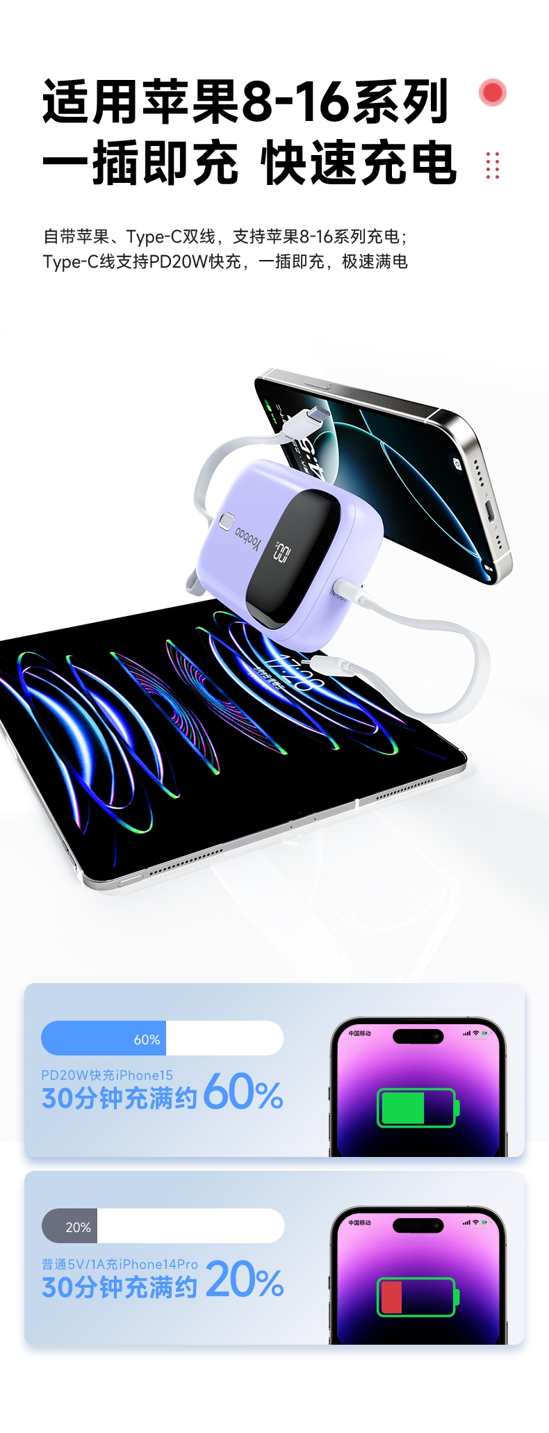 迷你自带线 充电更方便;小巧便捷 出行不再是负担;有3C安全认证 可登飞机