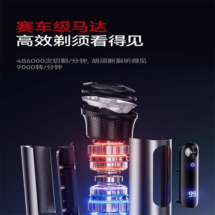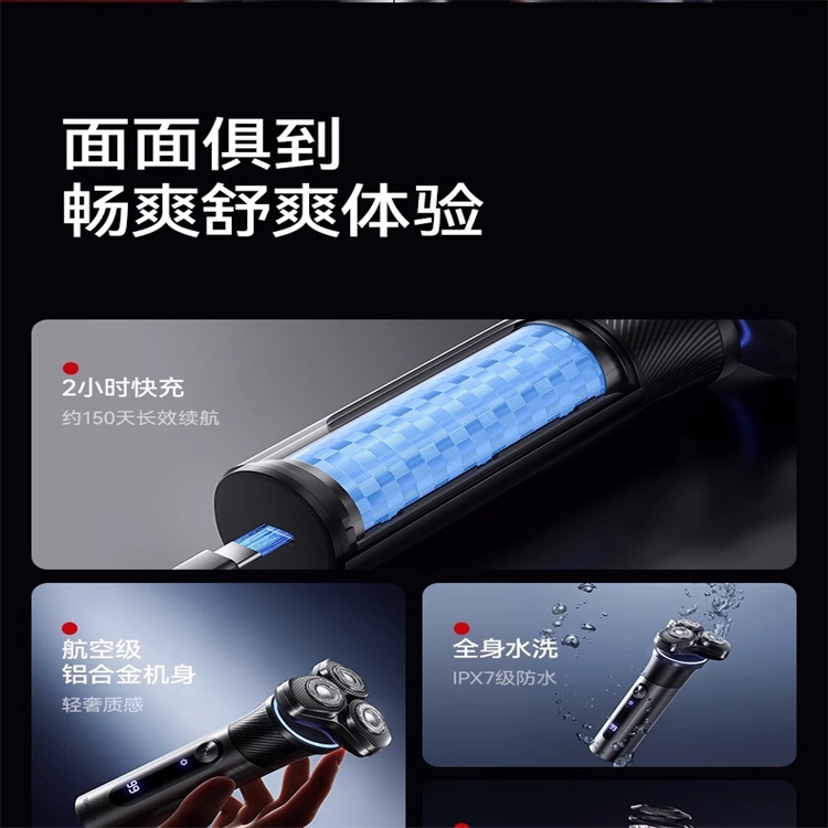 刀头能根据面部轮廓和压力自动调节角度和力度。;动力更直接、更稳定,噪音更小,效率更高。;高转速马达,提供强大切割力,应对浓密、粗硬胡须。