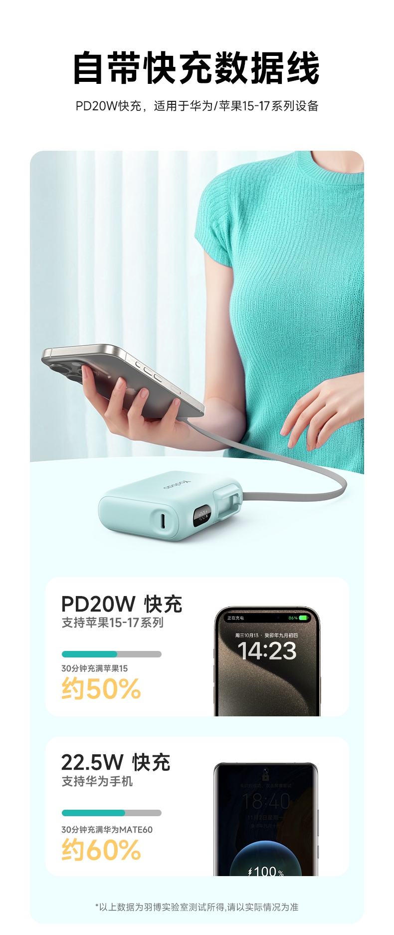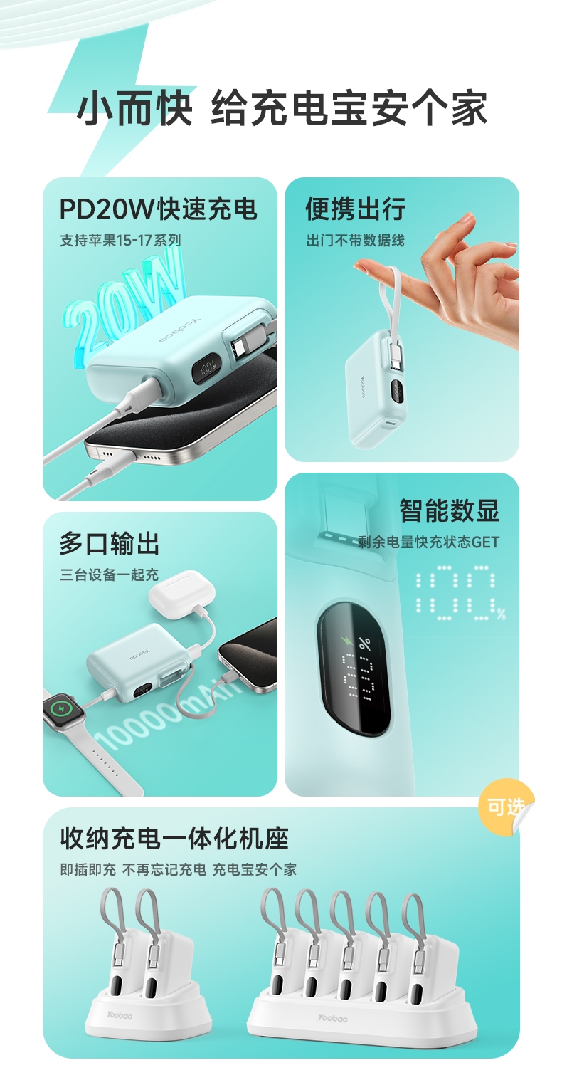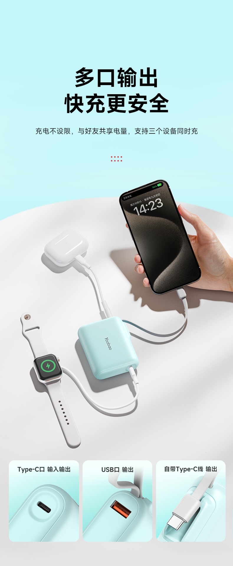 多口输出 快充更安全;有3C安全认证 可登飞机;高品质 自带线