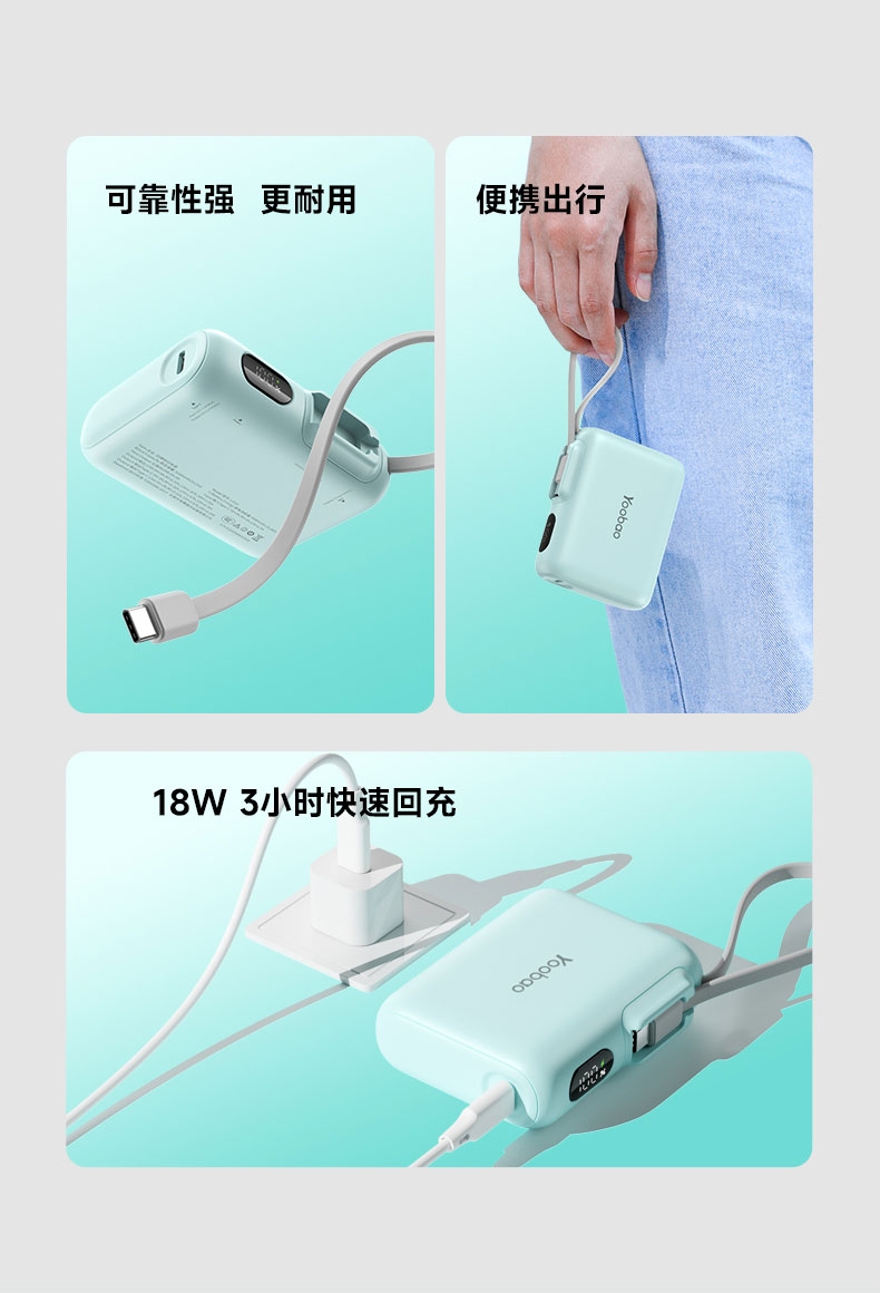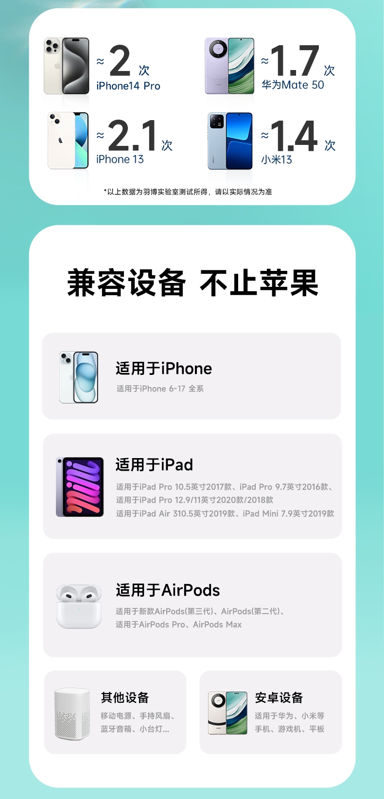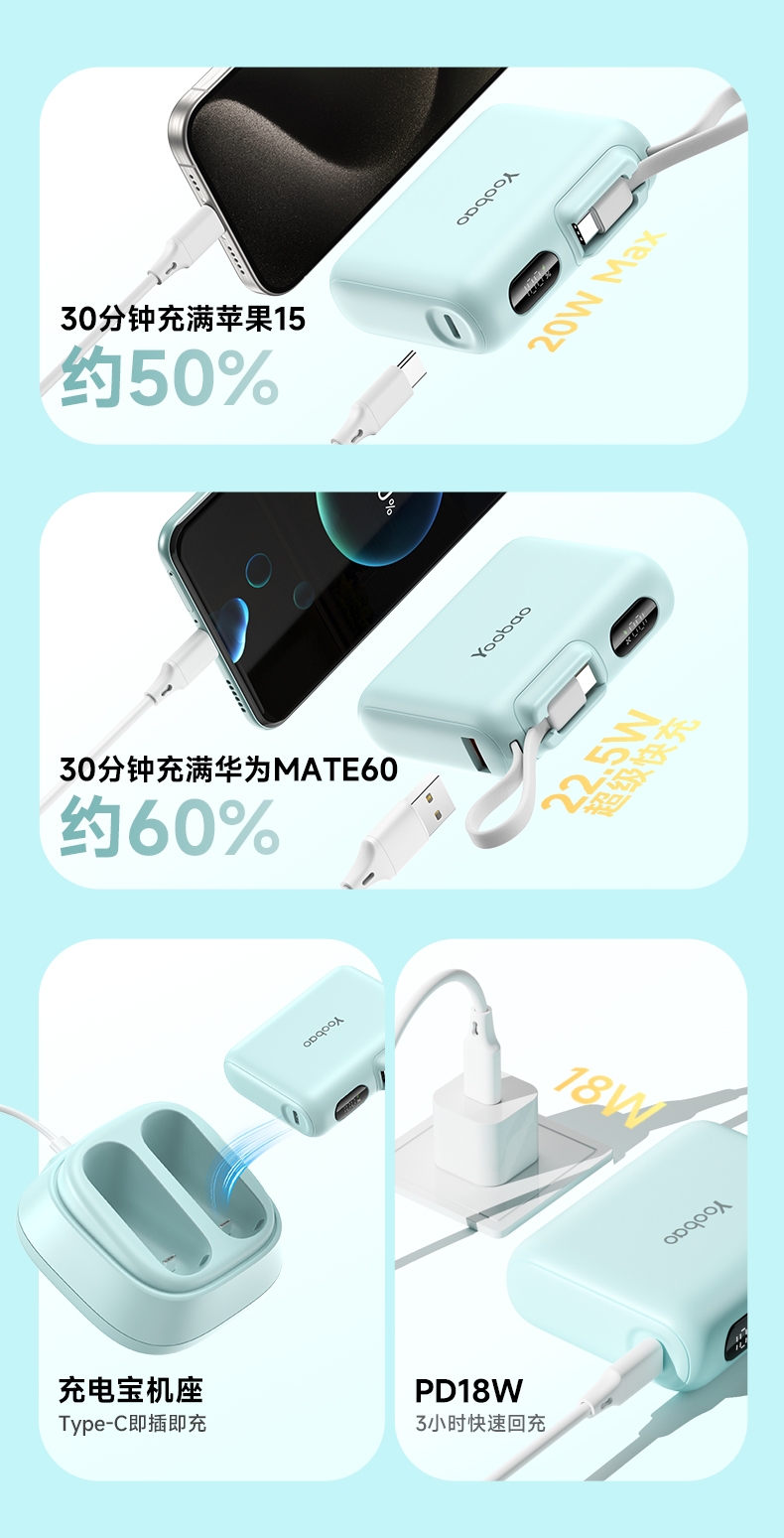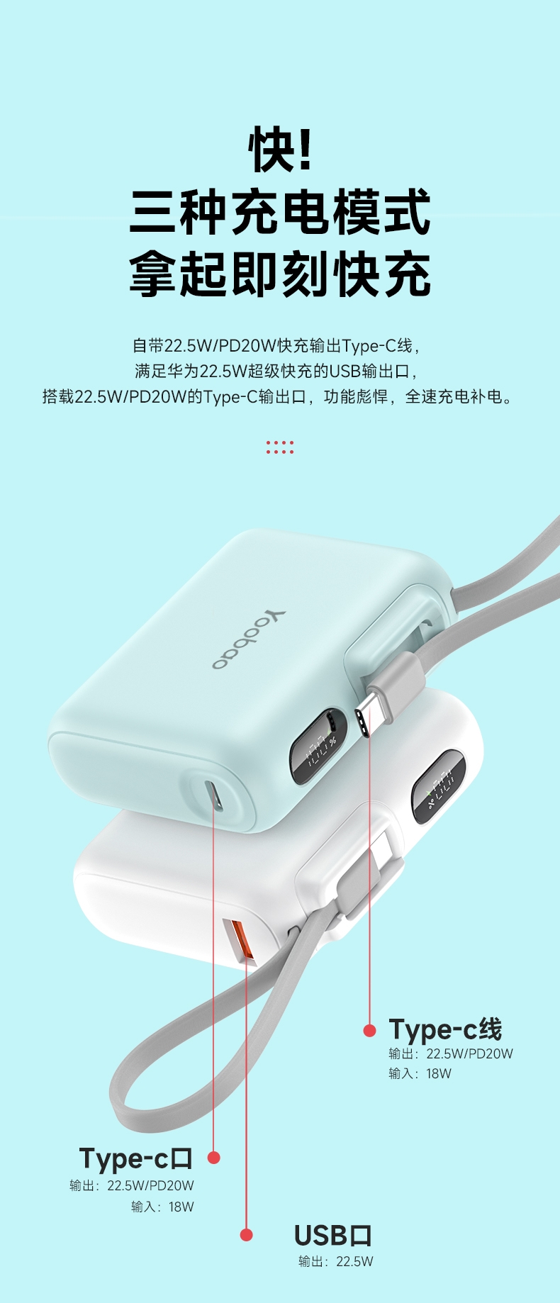 多口输出 快充更安全;有3C安全认证 可登飞机;高品质 自带线
