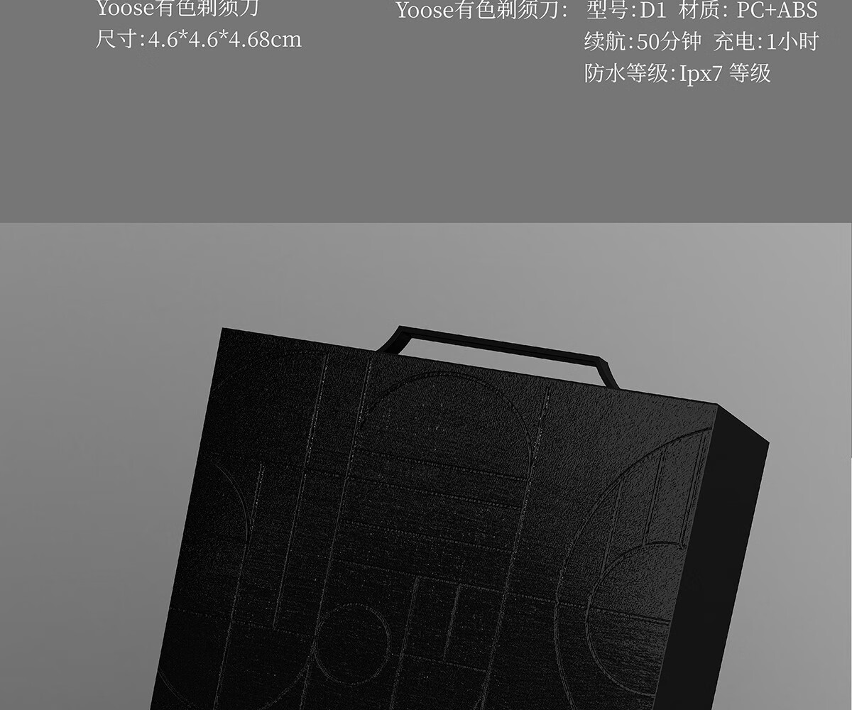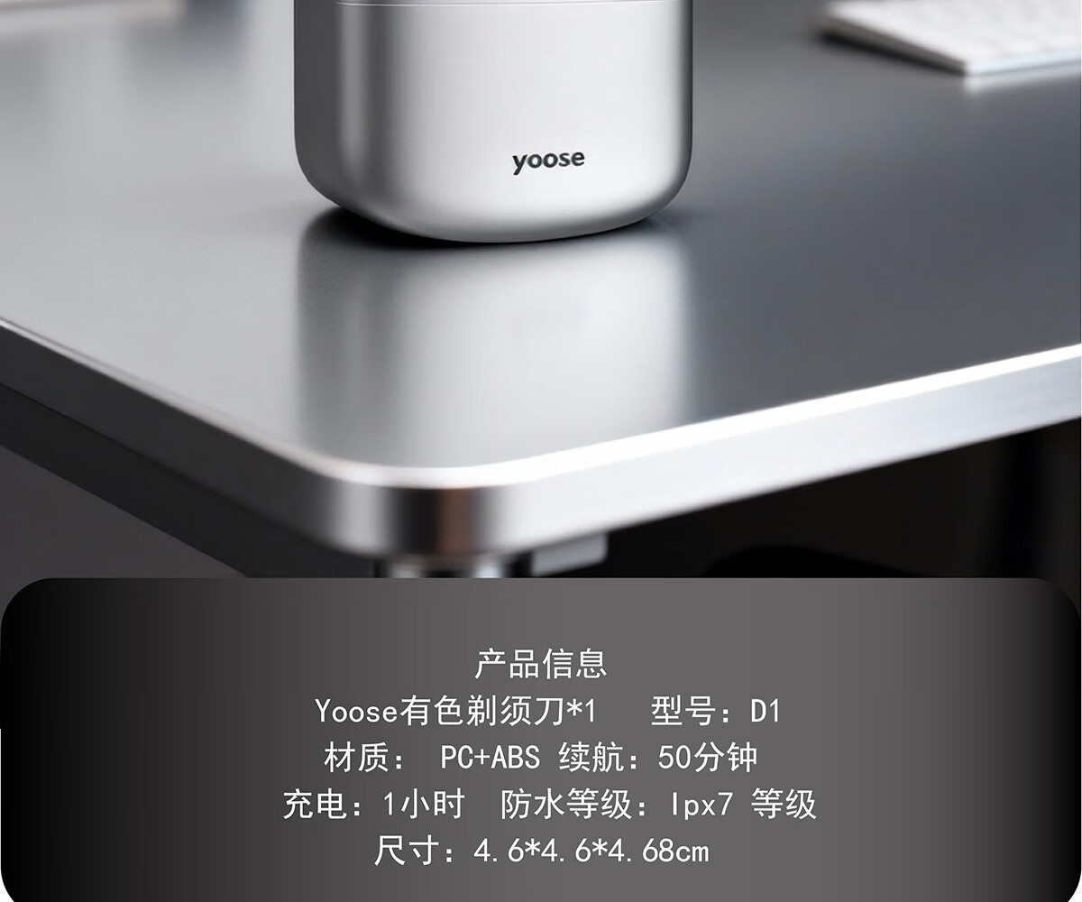 有色剃须刀:型号:D1 材质: PC+ABS 续航:50分钟 充电:1小时 防水等级:Ipx7 等级
