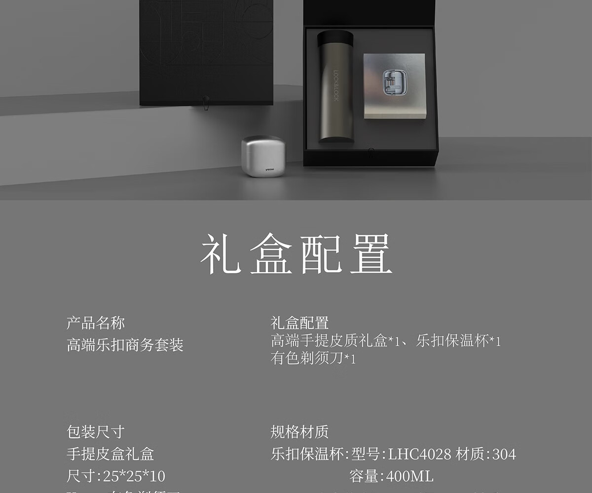 配置清单:高端手提皮质礼盒*1、乐扣保温杯*1 有色剃须刀*1
