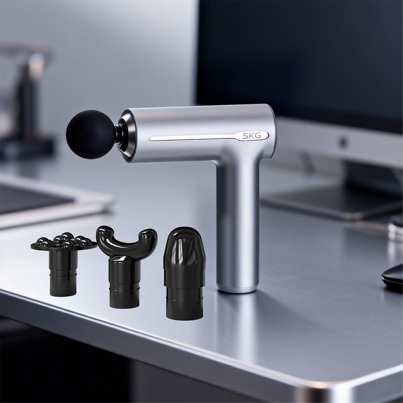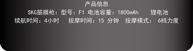 SKG筋膜枪:型号:F1 尺寸:229*186*63mm 电池容量:1800mAh 锂电池 续航时间: 4小时 按摩时间:15 分钟 按摩模式: 6档力度