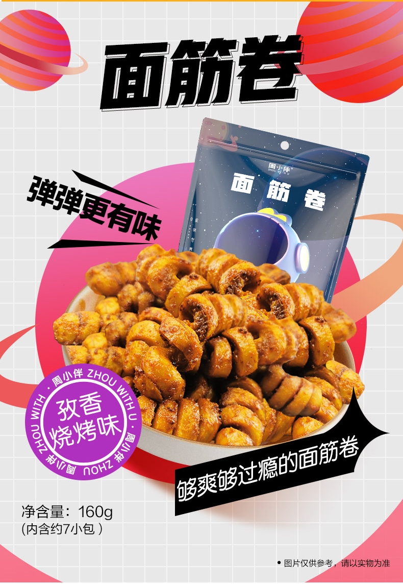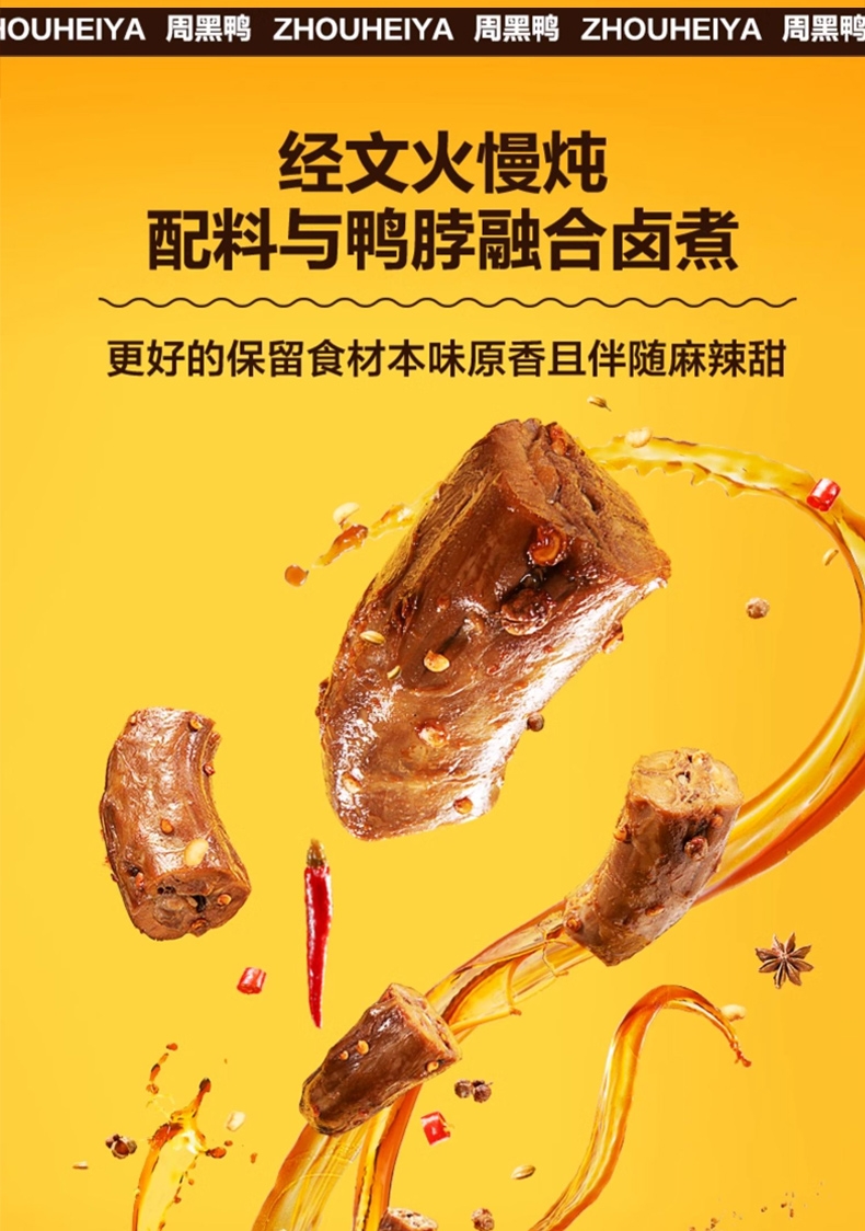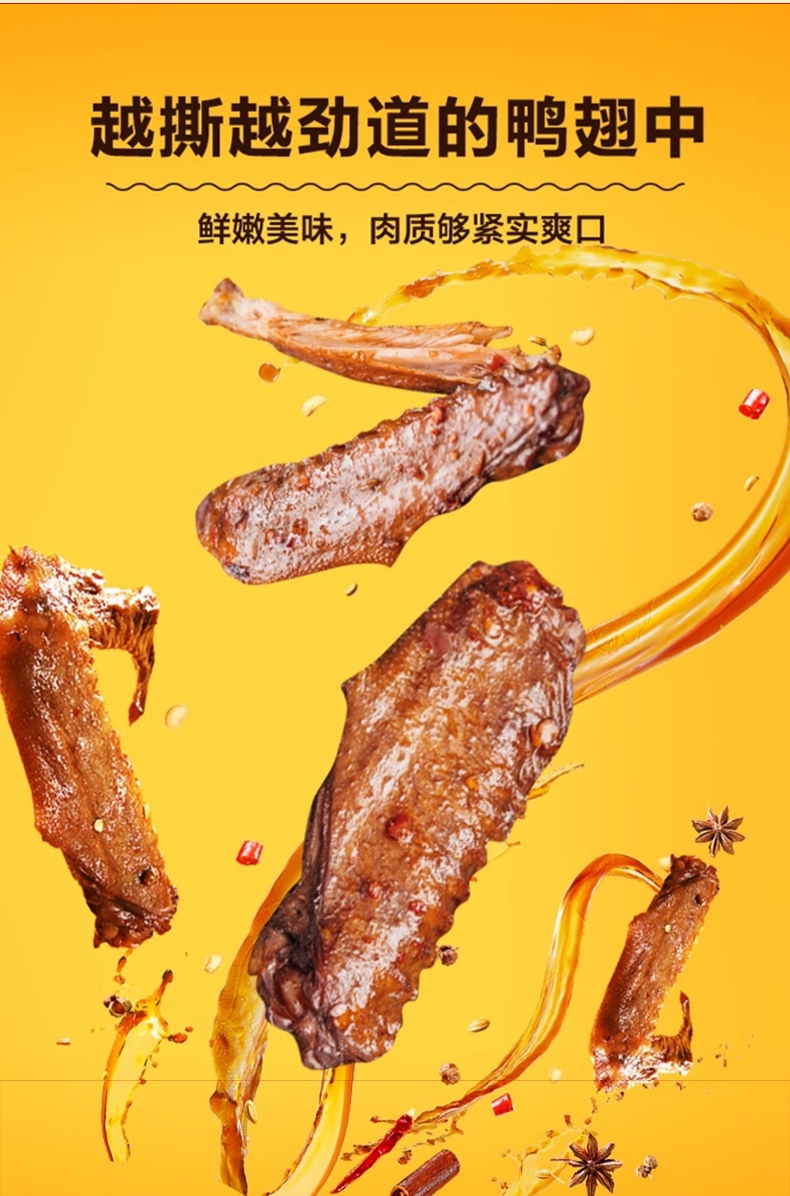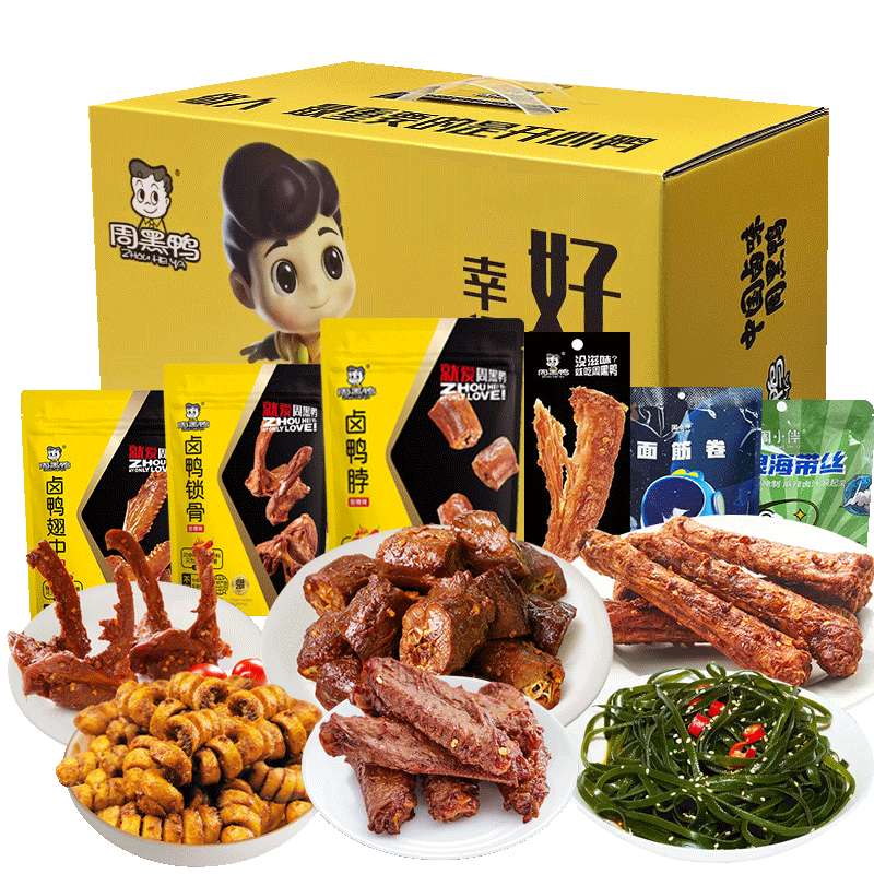 配置清单:周黑鸭卤鸭翅中75g 周黑鸭卤鸭脖60g 周黑鸭卤鸭锁骨66g 周黑鸭周小伴面筋卷160g 周黑鸭周小伴海带丝160g 周黑鸭手撕鸡脖40g