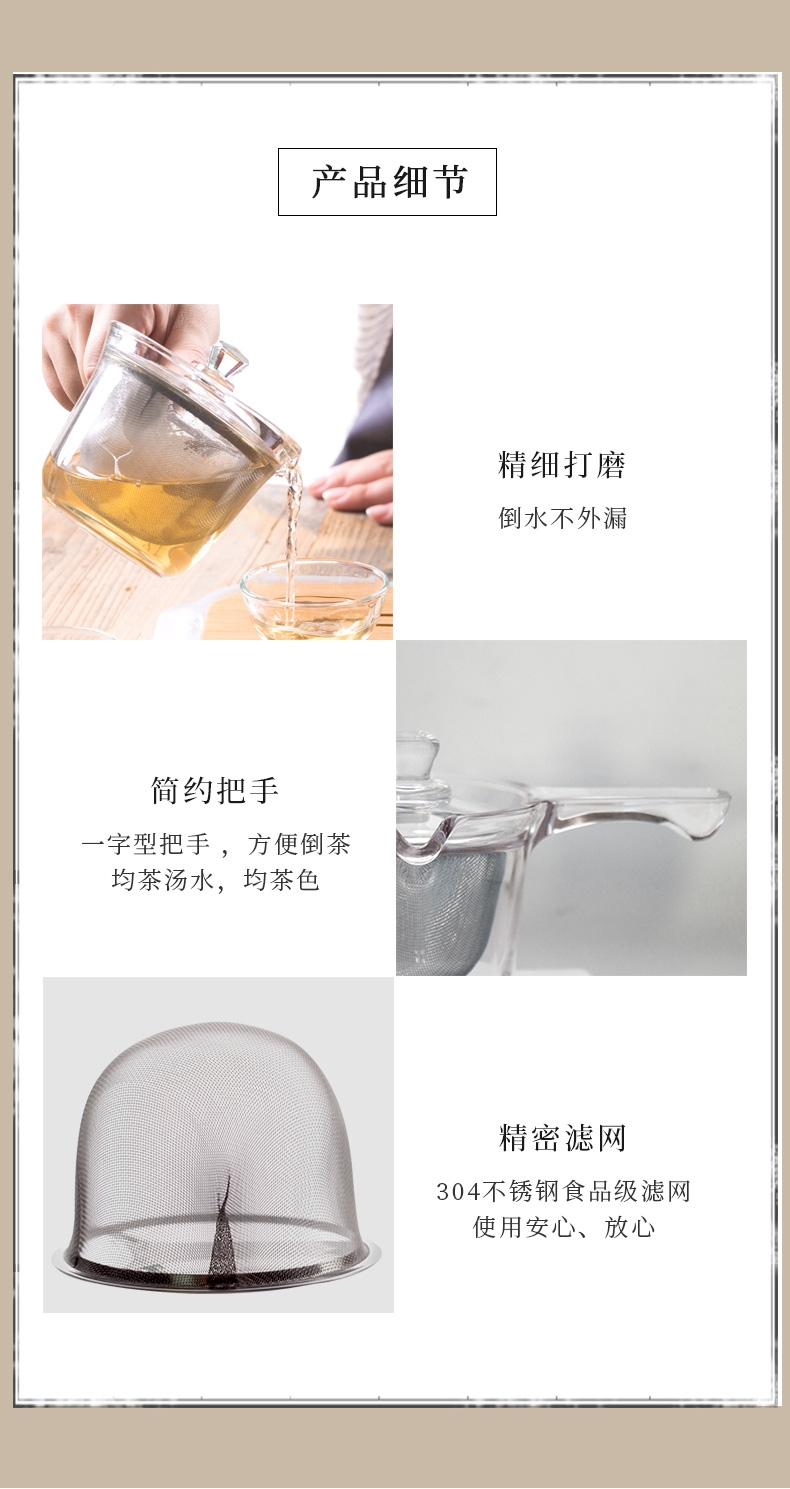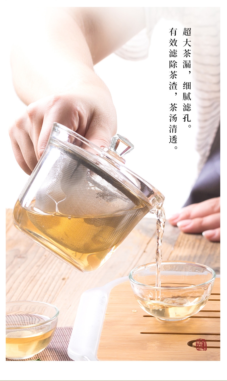 细密滤网,过滤茶渣;一字型把手,握感舒适;超大茶漏,细腻滤孔