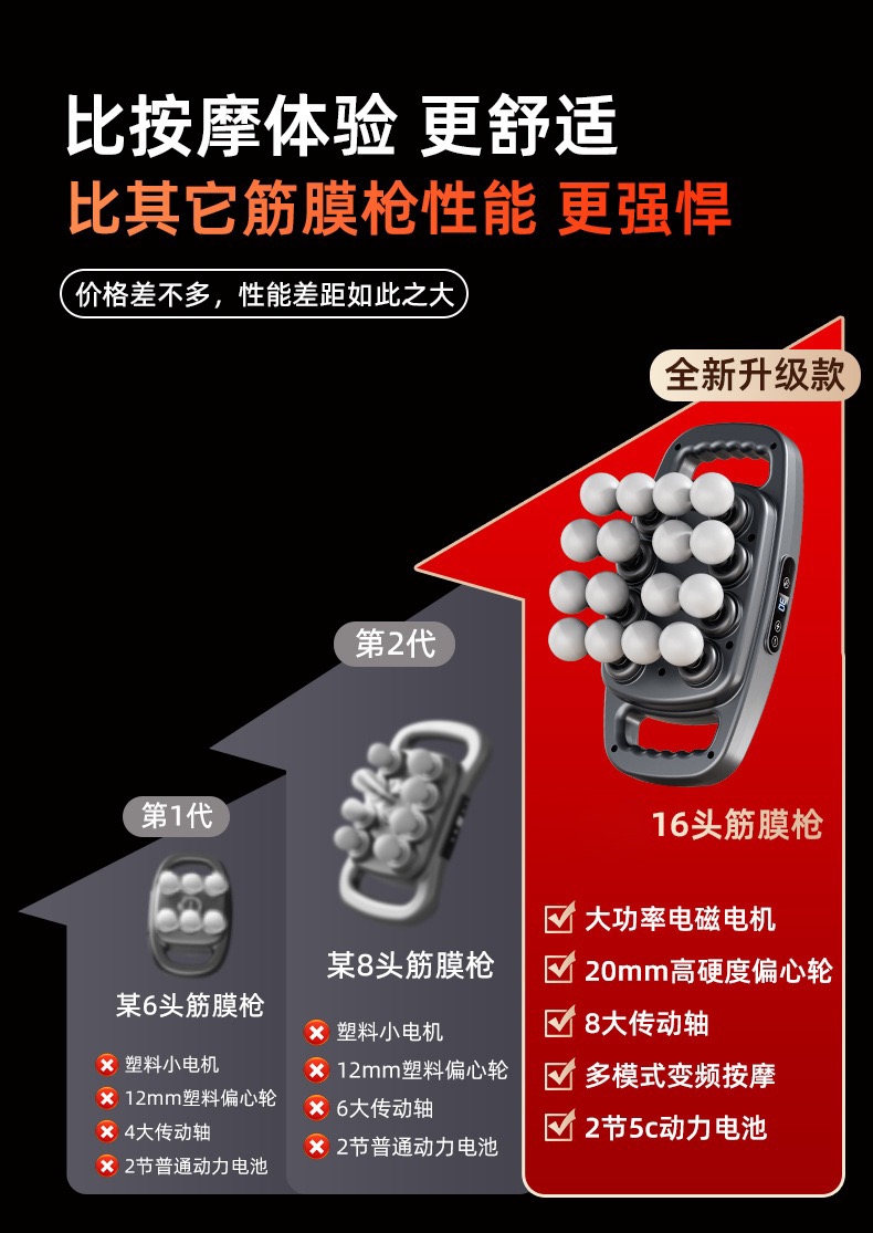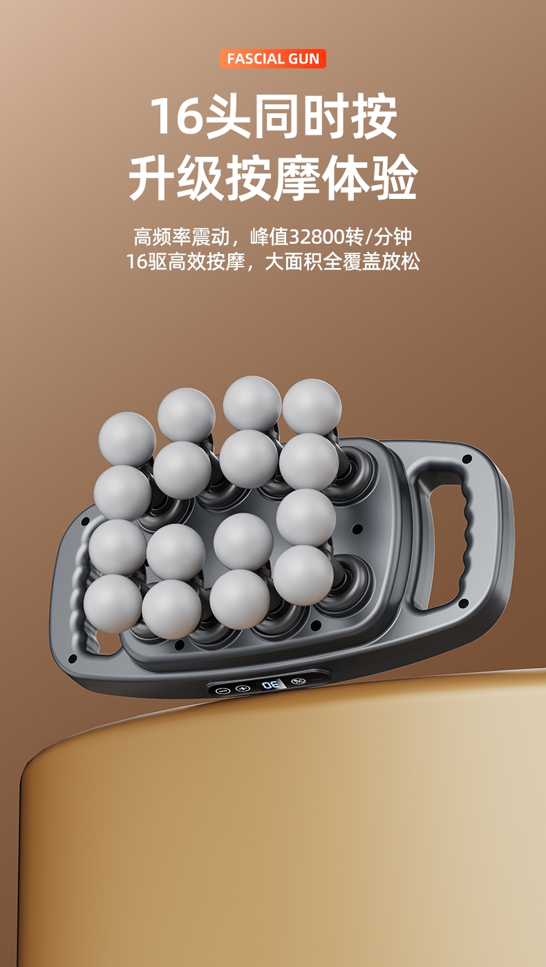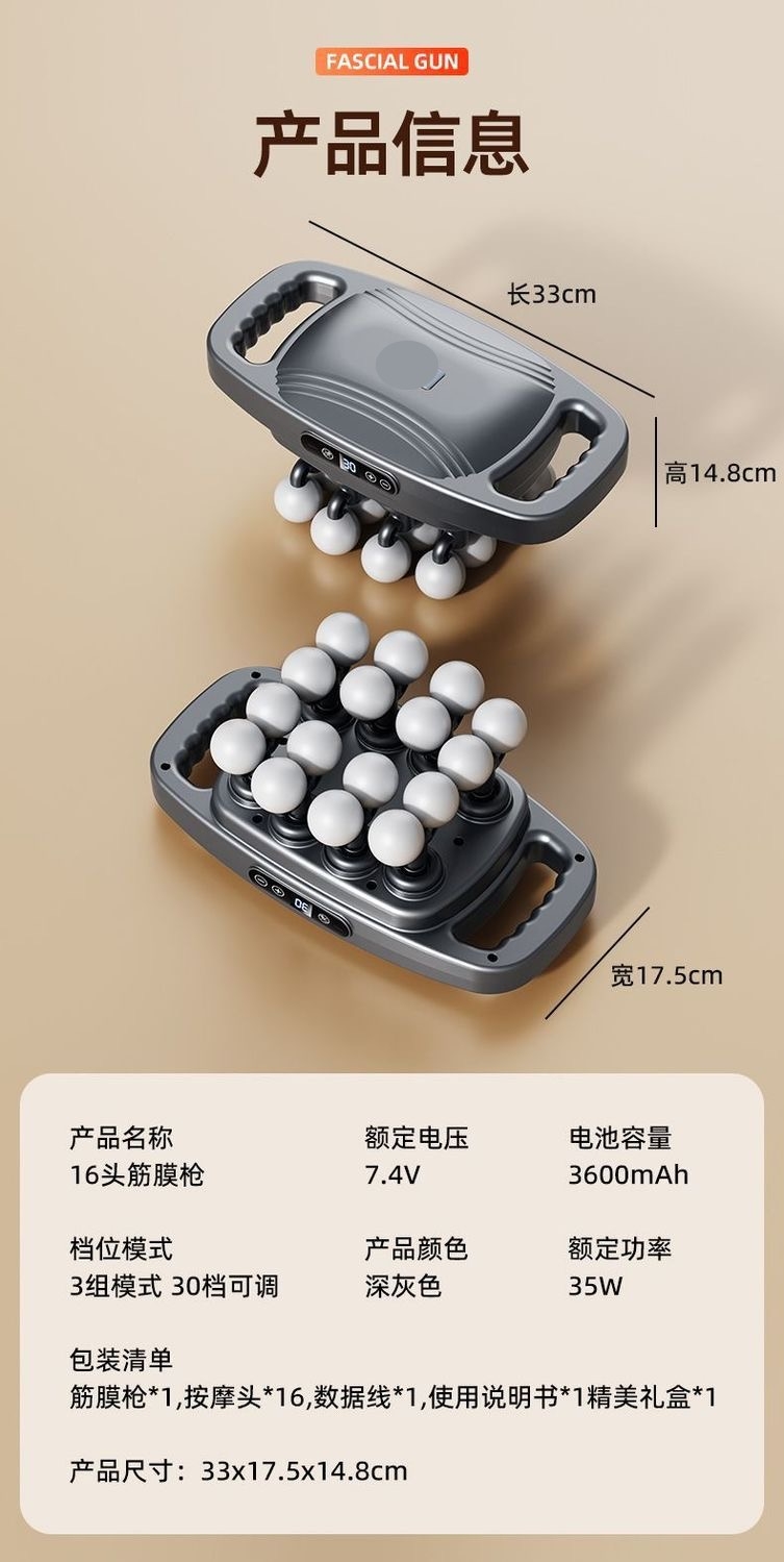 大动力16头大面积按摩精美礼盒包装送礼最佳;液晶显示三款模式加三十档位可调;高效肌肉颈椎全身放松