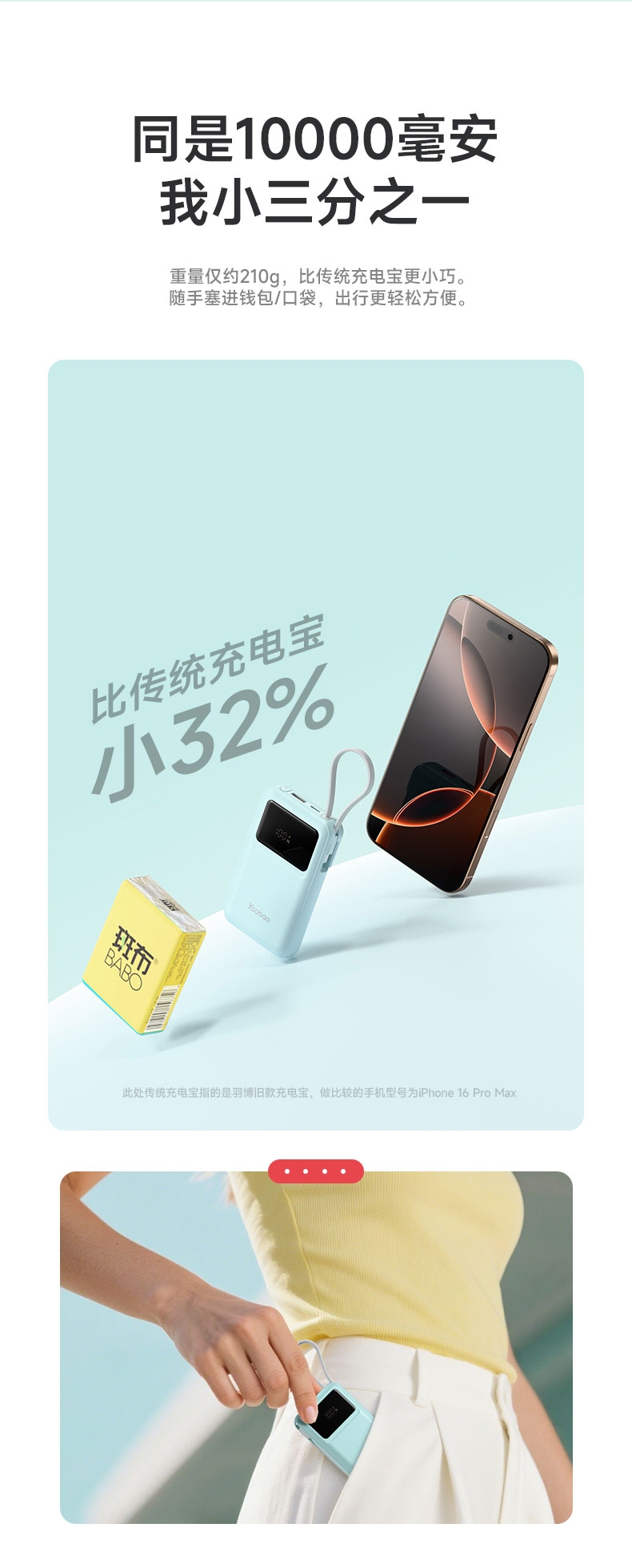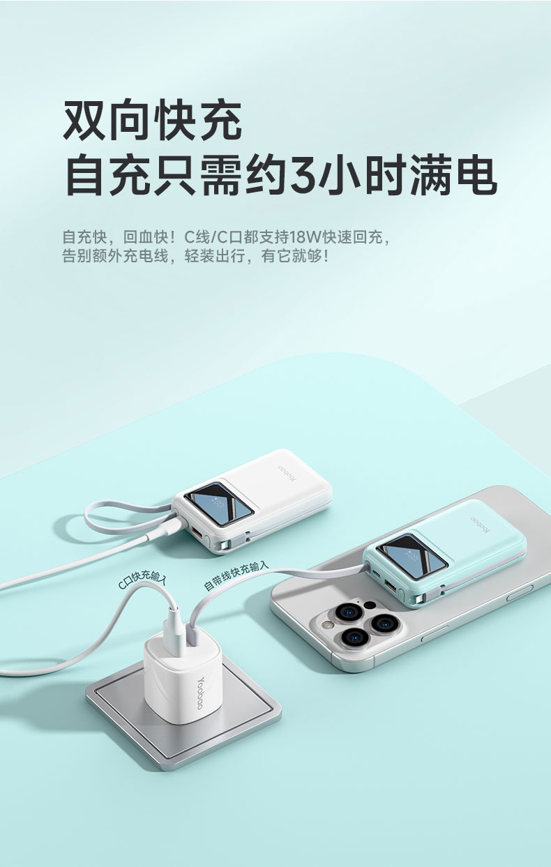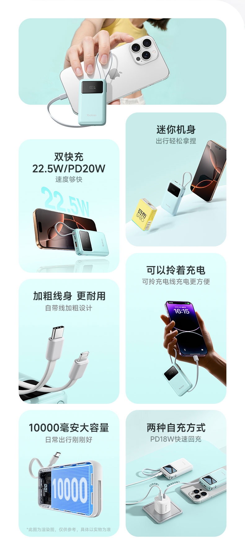 自带线 充电更方便;有3C安全认证 可登飞机;小巧便捷 出行不再是负担