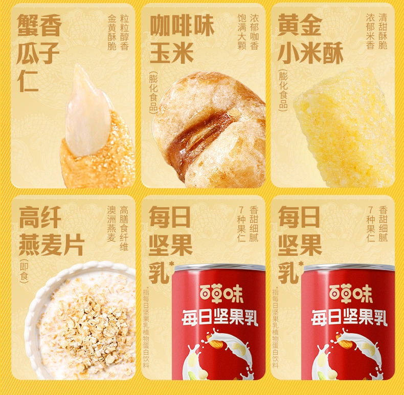 配置清单:【百草味】夏威夷果(奶油味) 60g *1 【百草味】熟制板栗仁 60g*1 【百草味】蟹香瓜子仁30g*1 【百草味】咖啡味玉米45g*1 【百草味】黄金小米酥(膨化食品)70g*1 【百草味】燕麦片(原味)100g*1 【百草味】每日坚果乳 310g* 2