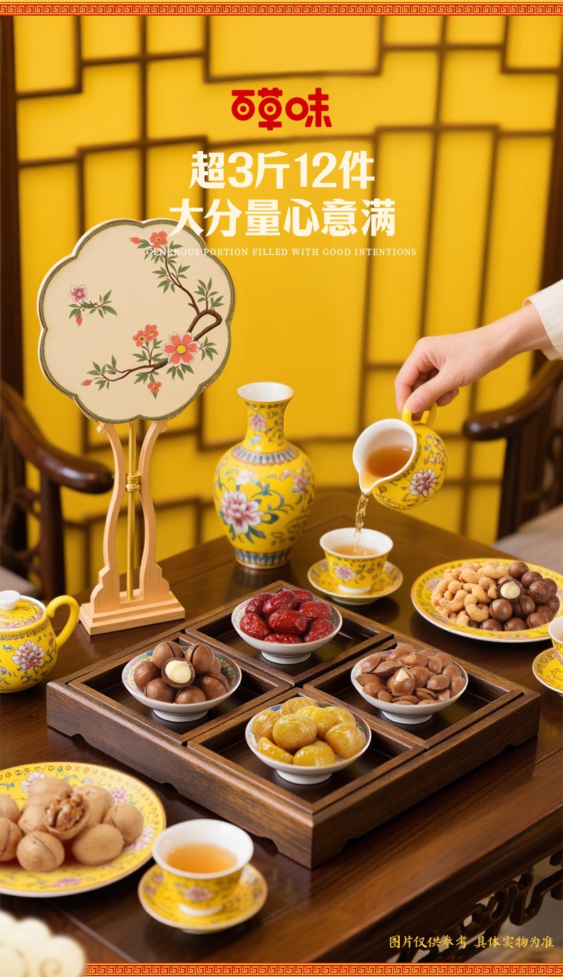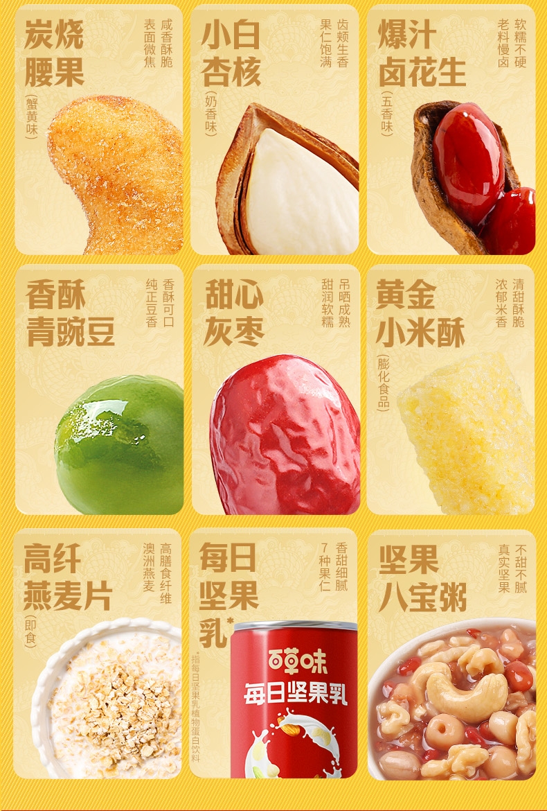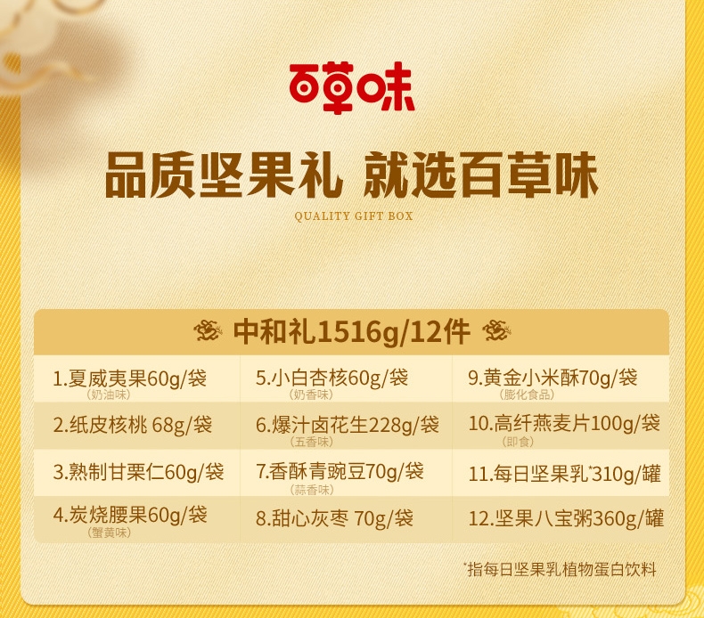 配置清单:【百草味】夏威夷果(奶油味) 60g*1 【百草味】纸皮核桃 68g*1 【百草味】熟制板栗仁 60g*1 【百草味】炭烧腰果(蟹黄味)60g*1 【百草味】小白杏核(奶香味)60g*1 【百草味】爆汁卤花生(五香味)228g*1 【百草味】香酥小豌豆(蒜香味) 70g*1 【百草味】甜心灰枣 70g*1 【百草味】黄金小米酥(膨化食品)70g*1 【百草味】燕麦片(原味)100g*1 【百草味】每日坚果乳 310g*1 【百草味】坚果八宝粥360g*1