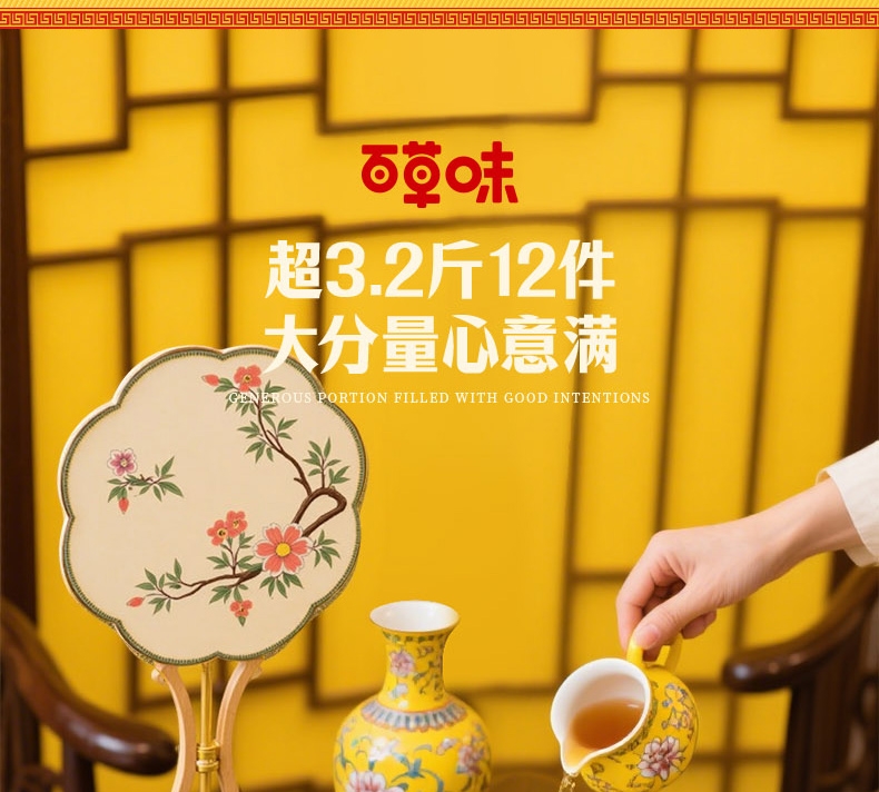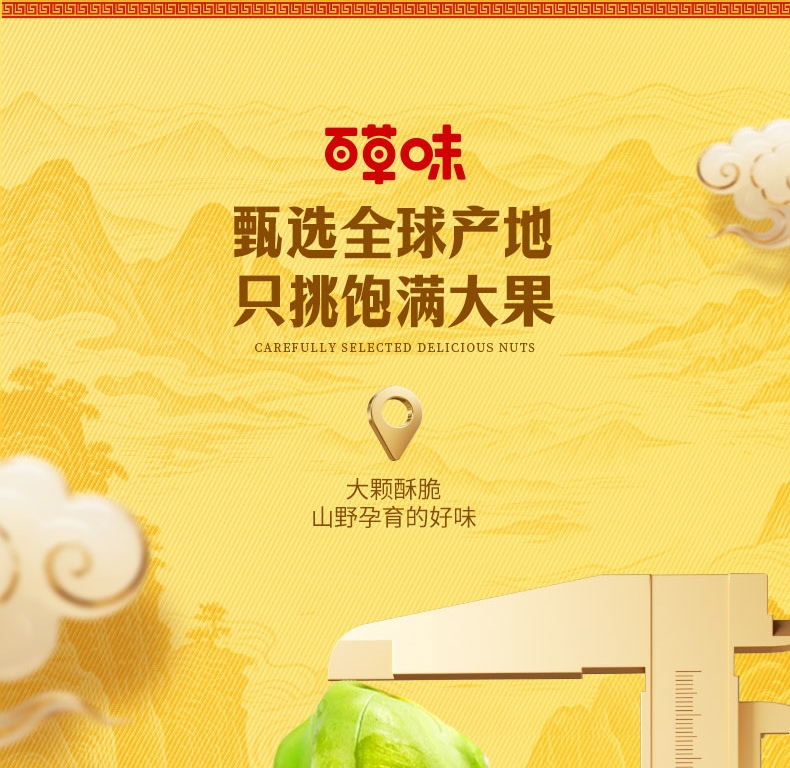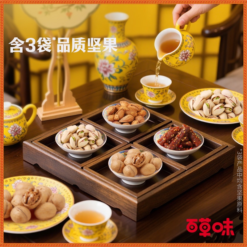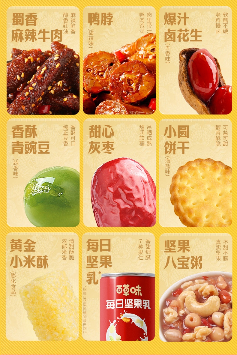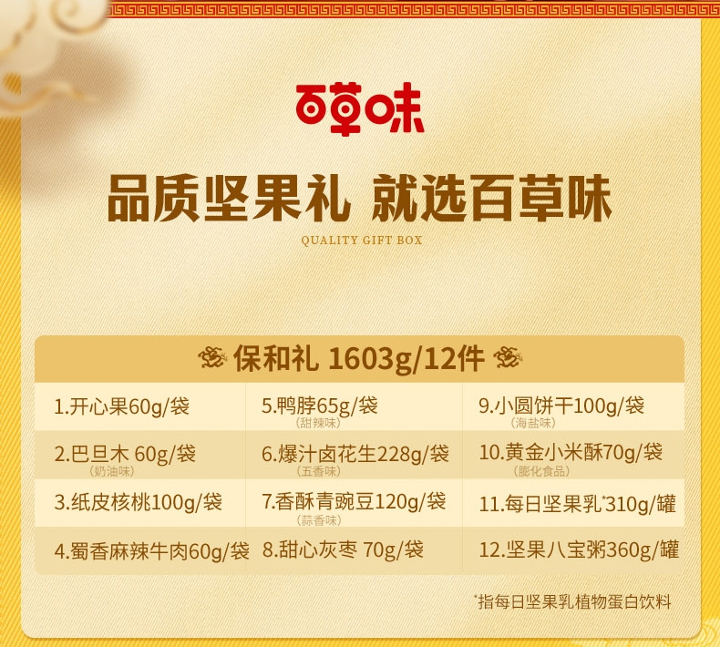 配置清单:【百草味】开心果60g*1 【百草味】巴旦木(奶油味)60g*1 【百草味】纸皮核桃 100g*1 【百草味】蜀香麻辣牛肉60g*1 【百草味】鸭脖(甜辣味)65g*1 【百草味】爆汁卤花生(五香味)228g*1 【百草味】香酥小豌豆(蒜香味) 120g*1 【百草味】甜心灰枣 70g*1 【百草味】小圆饼干(海盐味)100g*1 【百草味】黄金小米酥(膨化食品)70g*1 【百草味】每日坚果乳 310g*1 【百草味】坚果八宝粥360g*1