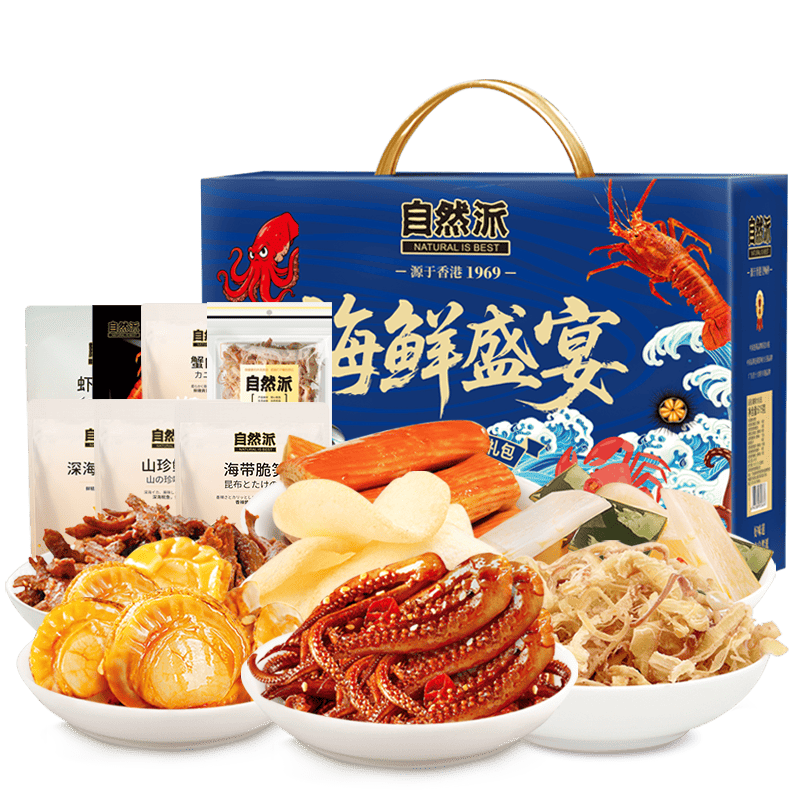 配置清单:自然派炭烧味鱿鱼丝50g 自然派蟹肉棒(香辣味)72g 自然派珍宝虾片80g 自然派虾夷扇贝(烧烤味)75g 自然派山珍魷鱼60g 自然派香辣味深海小鱼仔88g 自然派海带脆笋香辣味130g