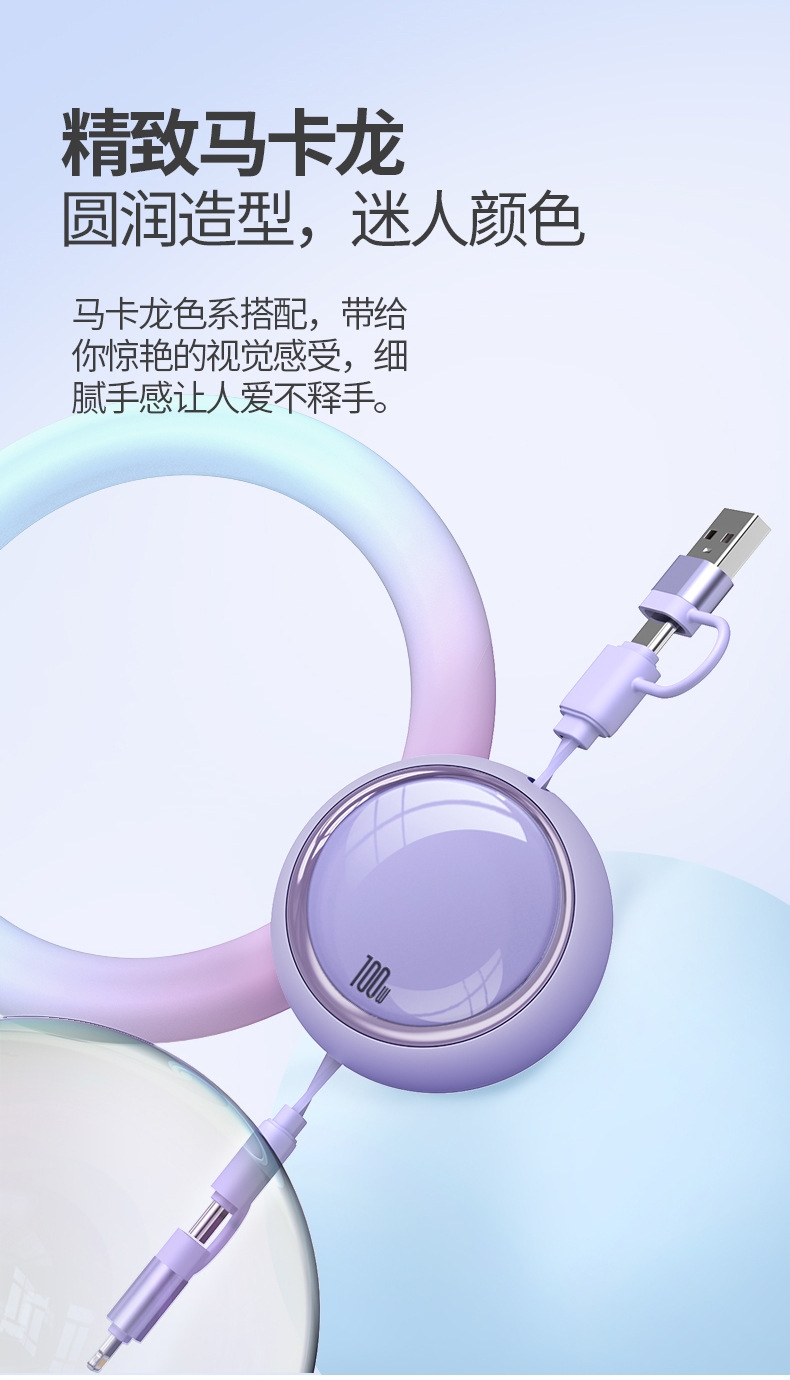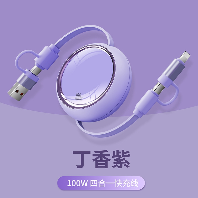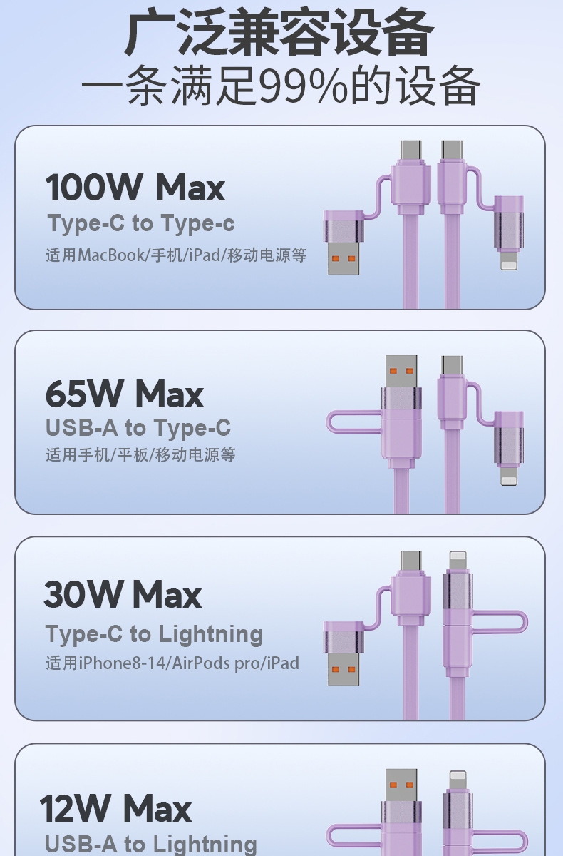 100W四合一超级快充数据线:材质TPE/ABS/铝合金,重量55g,线长1米,接口TYPE-C/苹果,协议SCP QC3.0+ PD100W,铜丝规格纯铜 50*2+10*3 ,特点双TYPE-C配置emarker芯片支持PD100W
