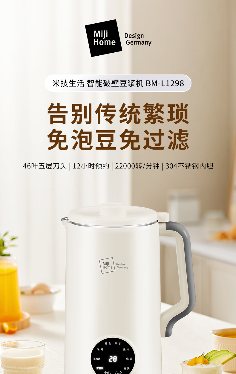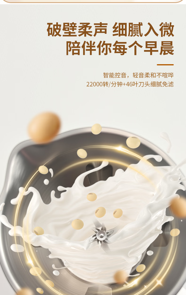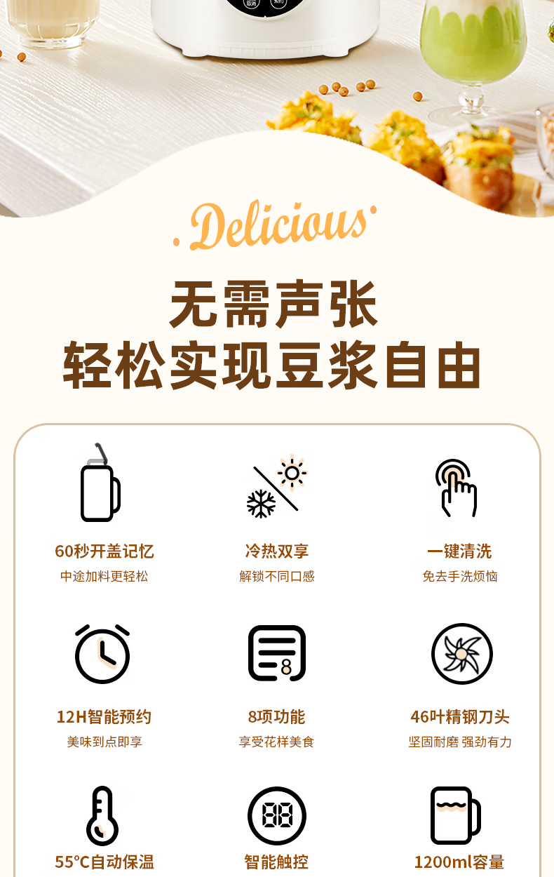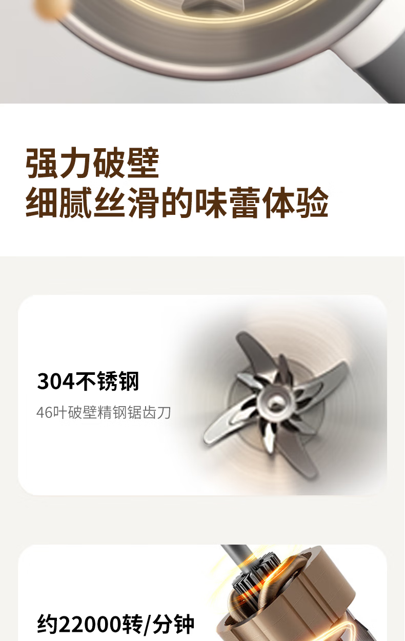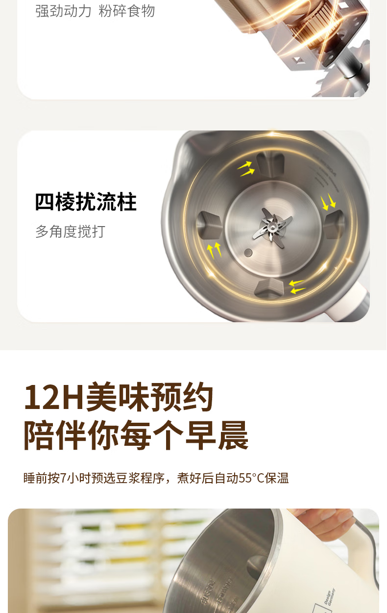 304不锈钢46叶精钢破壁刀头,五层分布,全方位破;支持12小时预约与2小时保温(默认保温55℃);60秒开盖记忆功能,中途加料更轻松