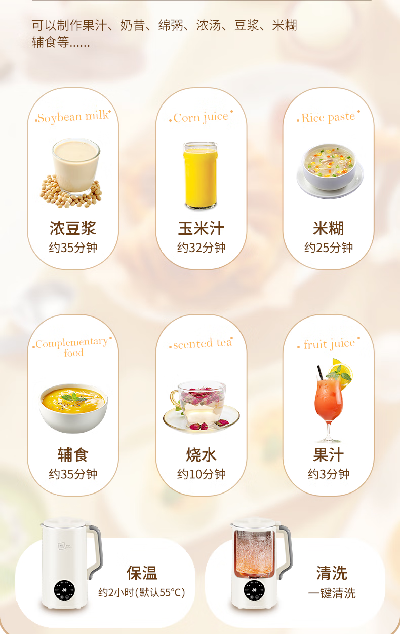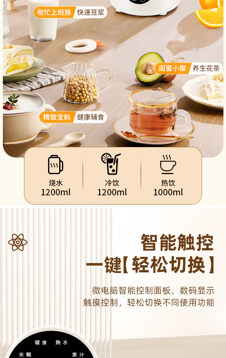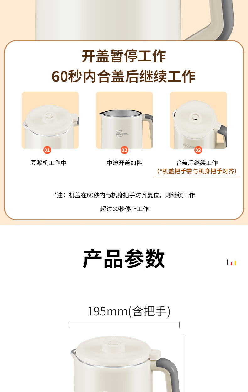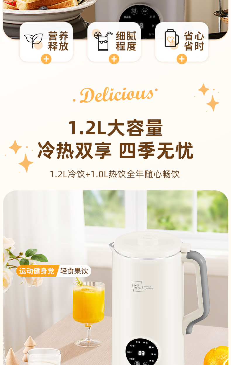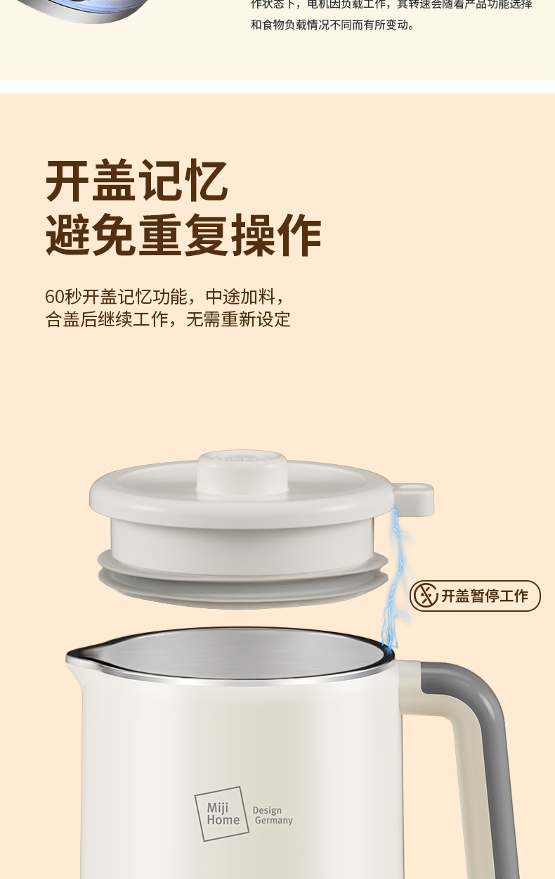 304不锈钢46叶精钢破壁刀头,五层分布,全方位破;支持12小时预约与2小时保温(默认保温55℃);60秒开盖记忆功能,中途加料更轻松