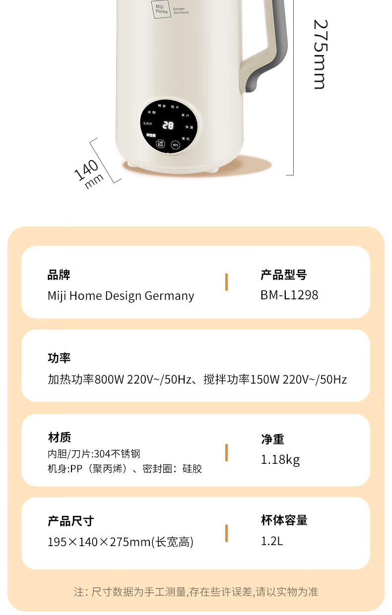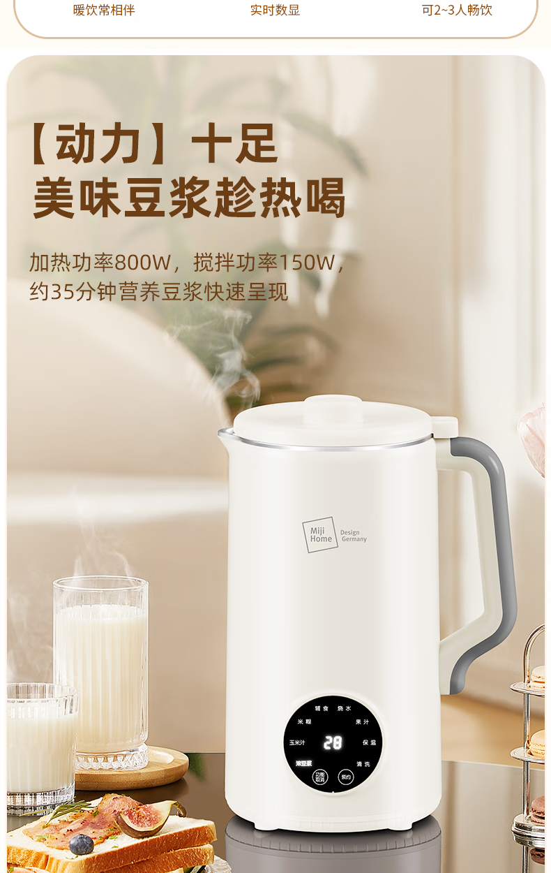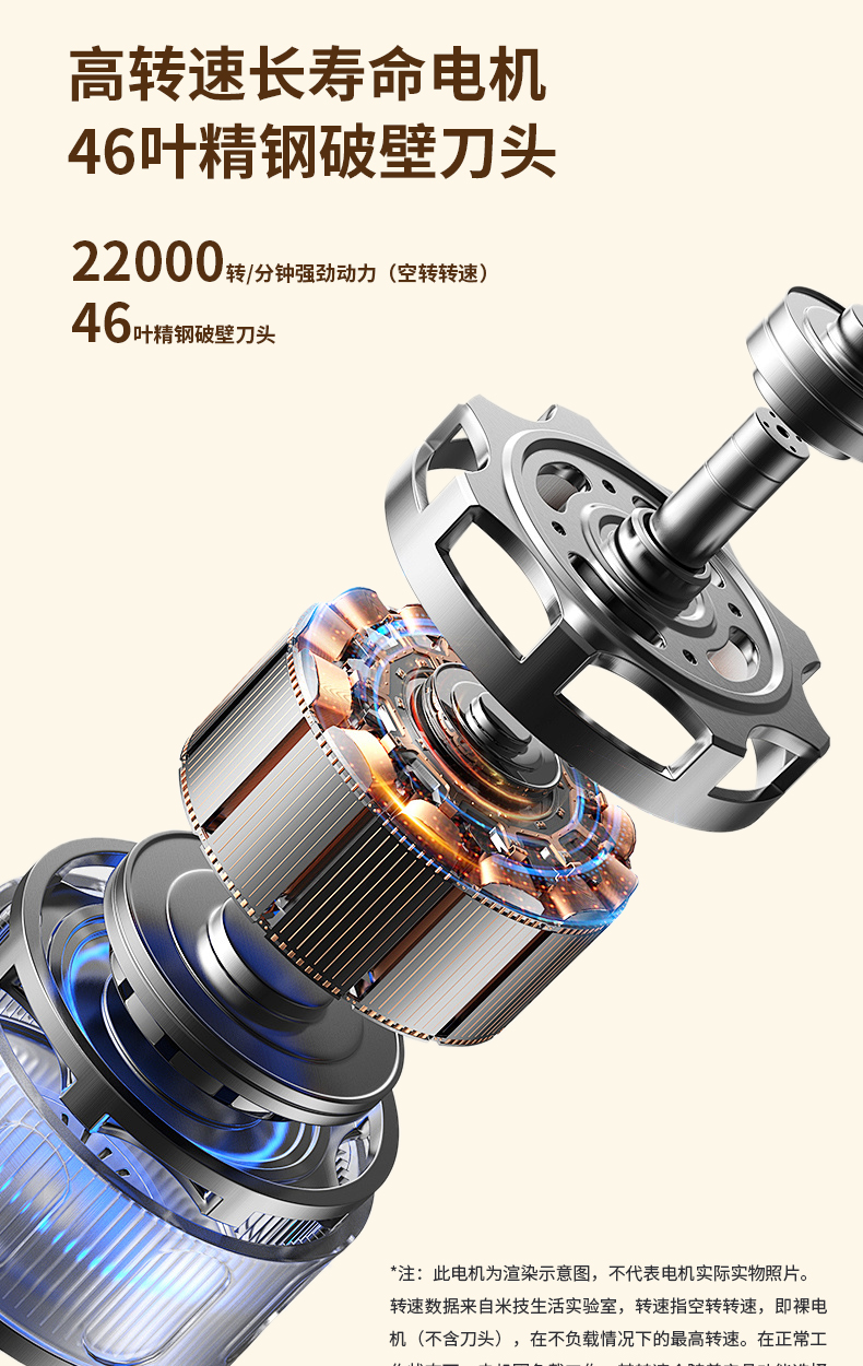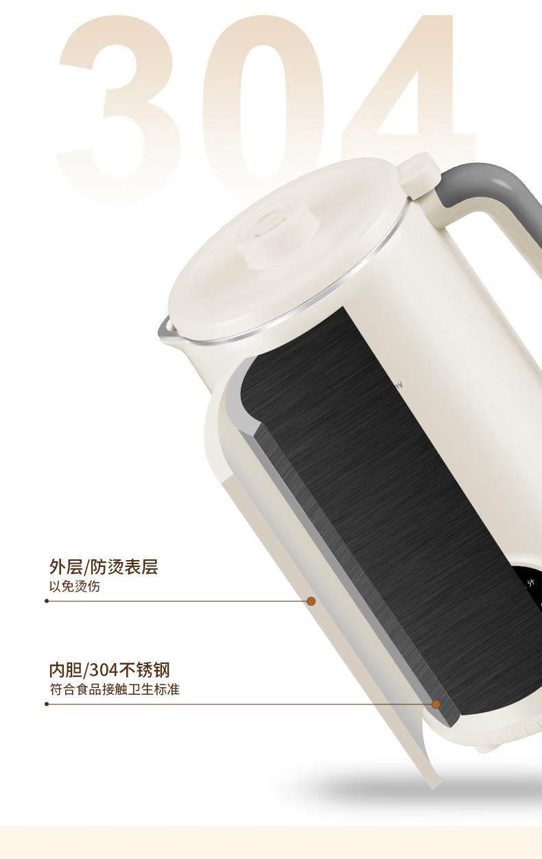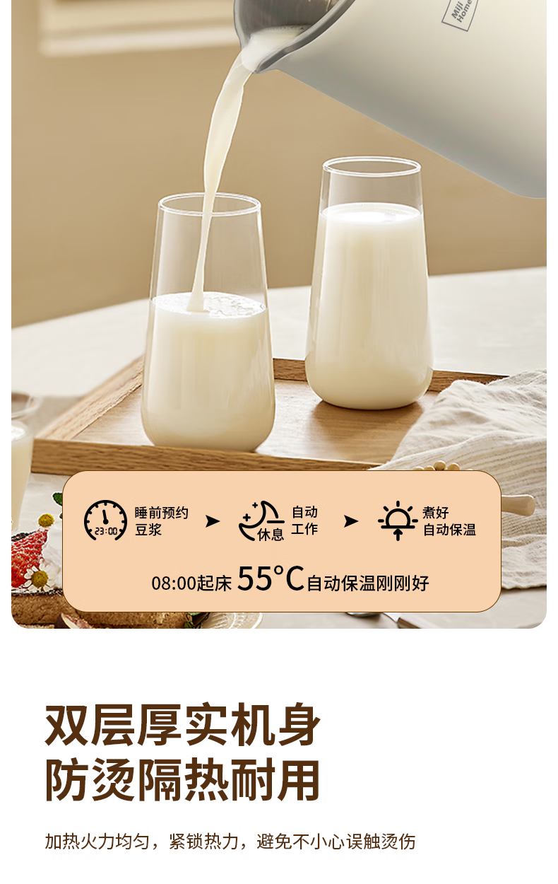 304不锈钢46叶精钢破壁刀头,五层分布,全方位破;支持12小时预约与2小时保温(默认保温55℃);60秒开盖记忆功能,中途加料更轻松