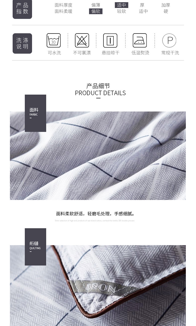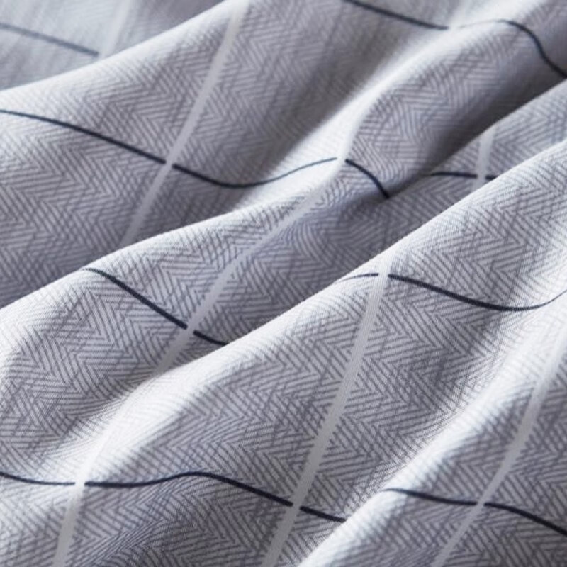 灰色条格印花,入眼舒适随性,体现中性风格;磨毛面料手感柔软细腻,贴肤,仿佛睡在云朵里;优质中空纤维,经久耐用不板结