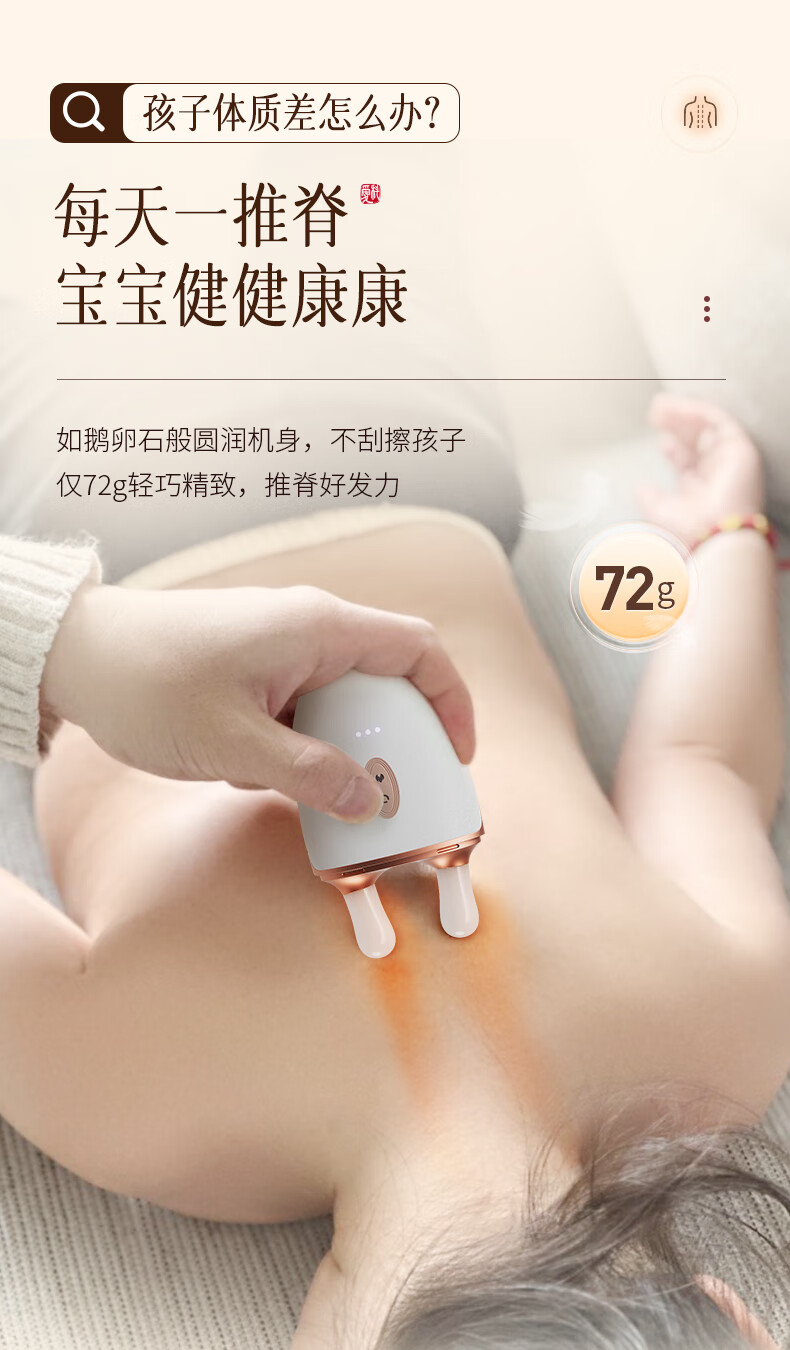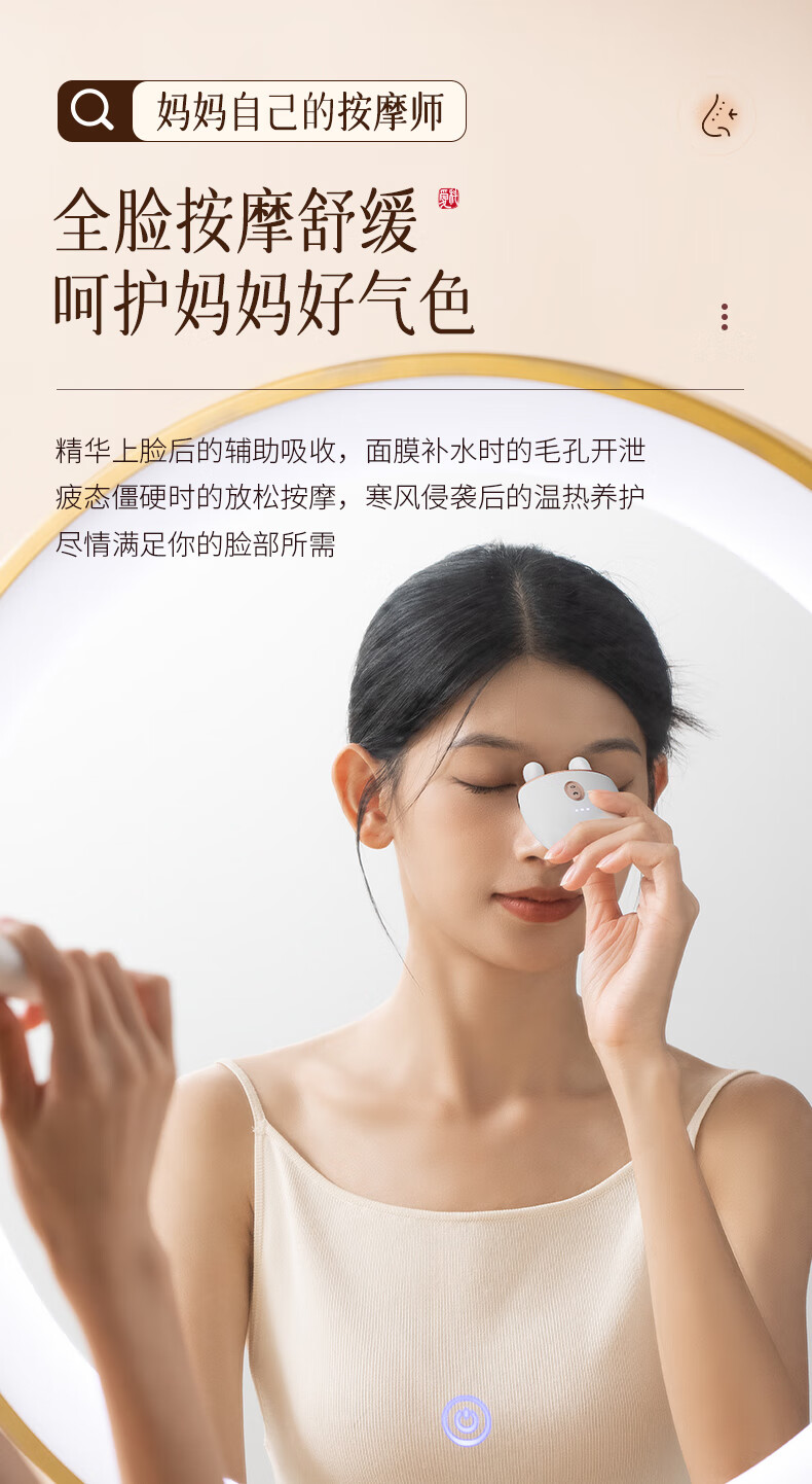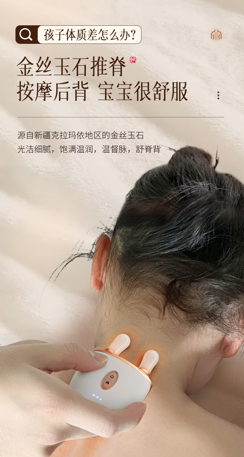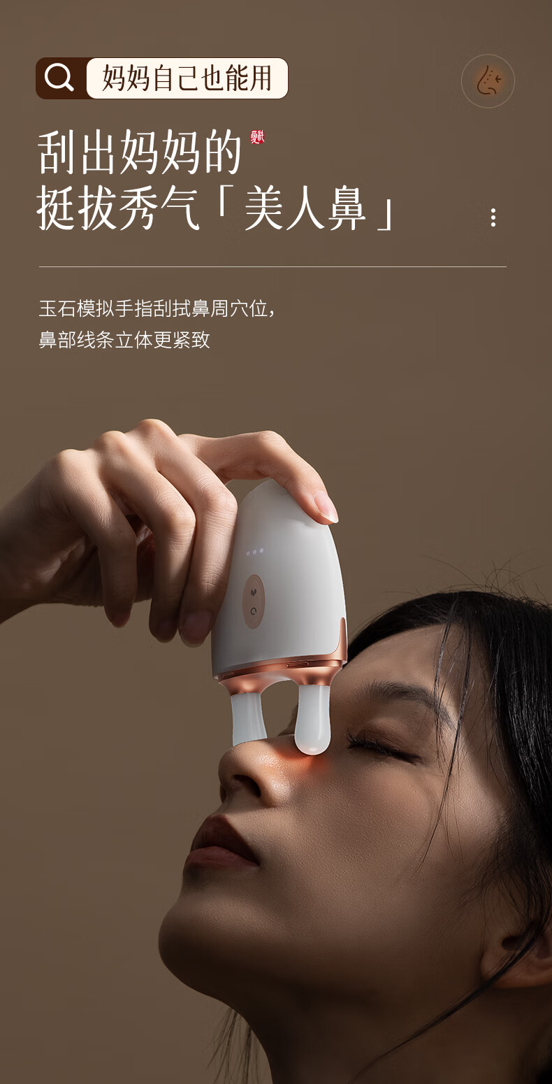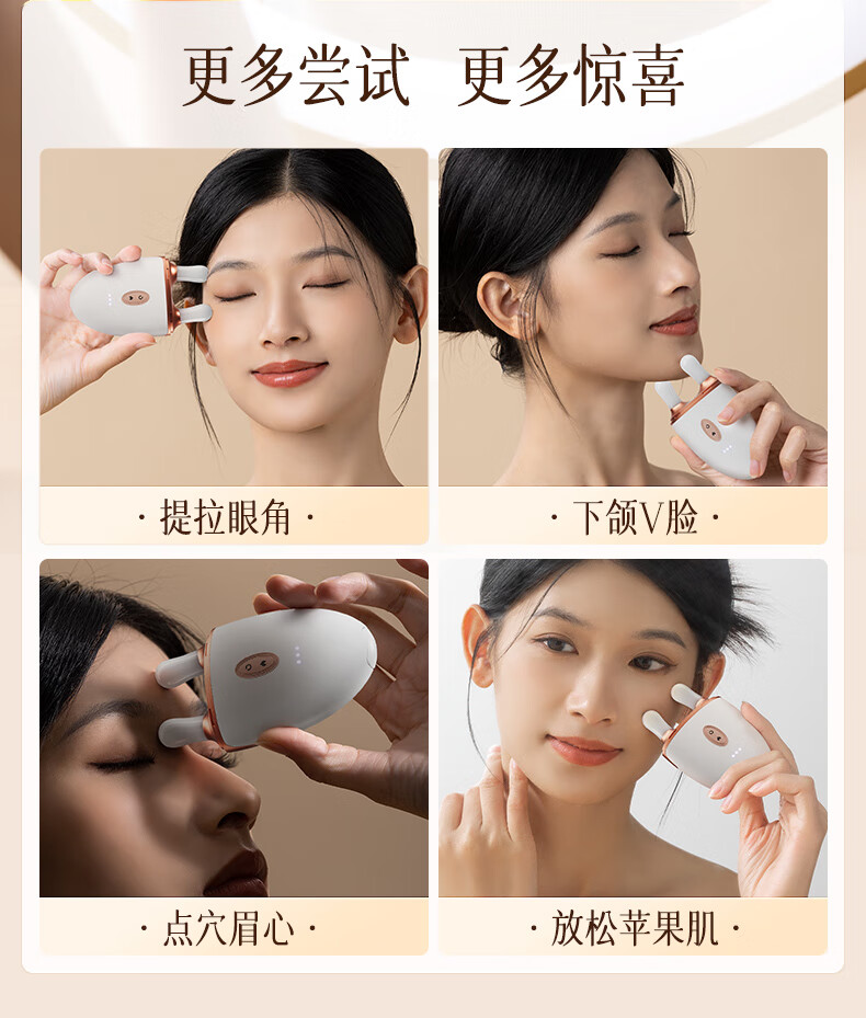 升级双玉石U形按摩头,圆润温和推刮;三档温度 + 震动按摩,放松促循环;75g轻巧精致,随身易携